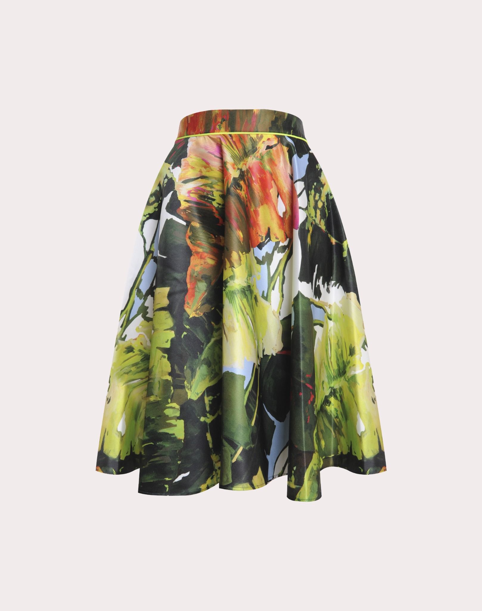 chân váy xoè, nền trắng, hoạ tiết lá bản to loang nhiều màu