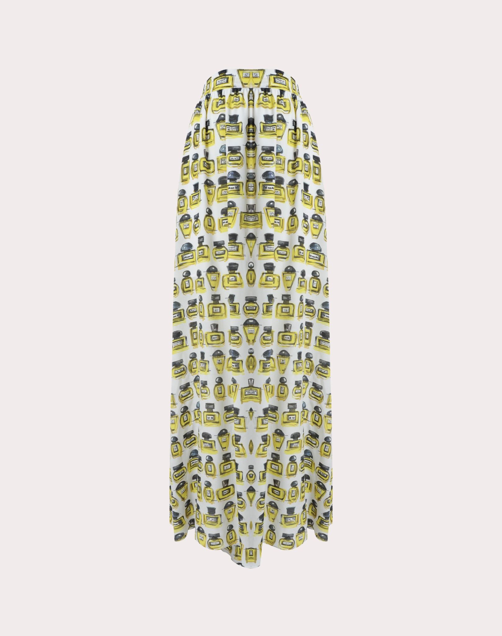Chân váy dài, nền trắng, toàn thân in hình lọ nước hoa màu vàng