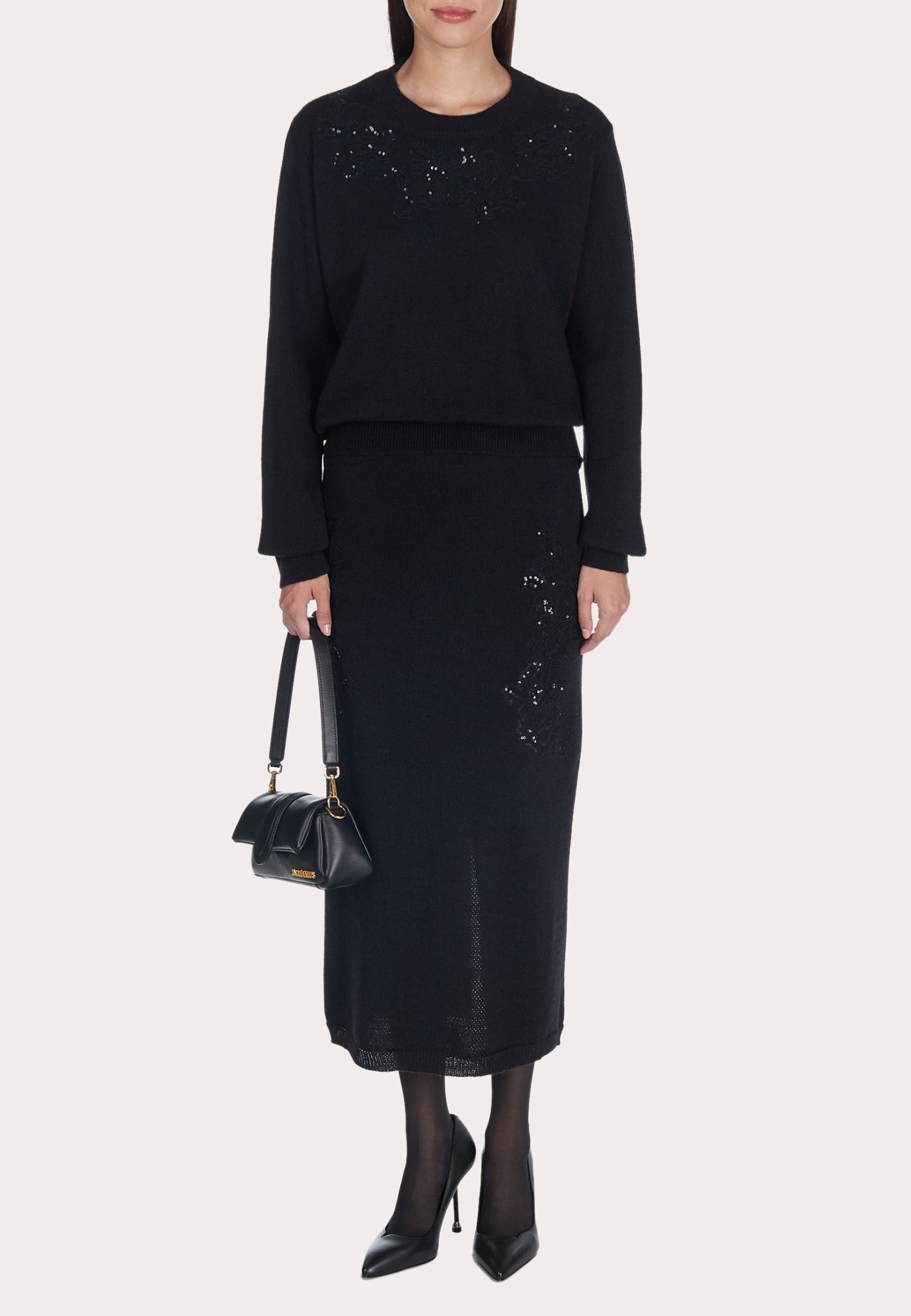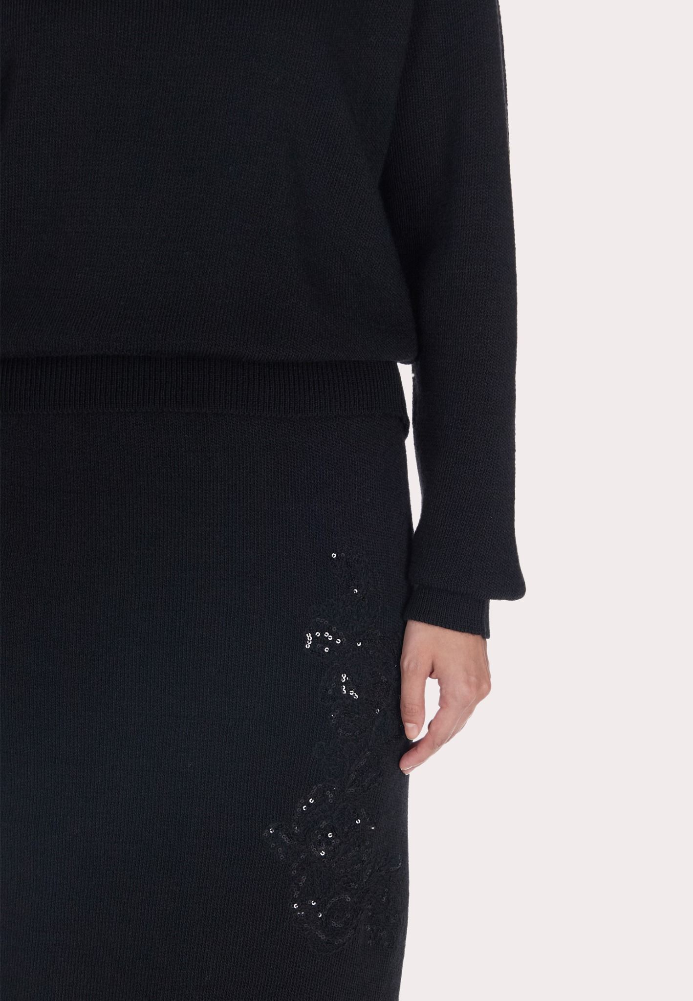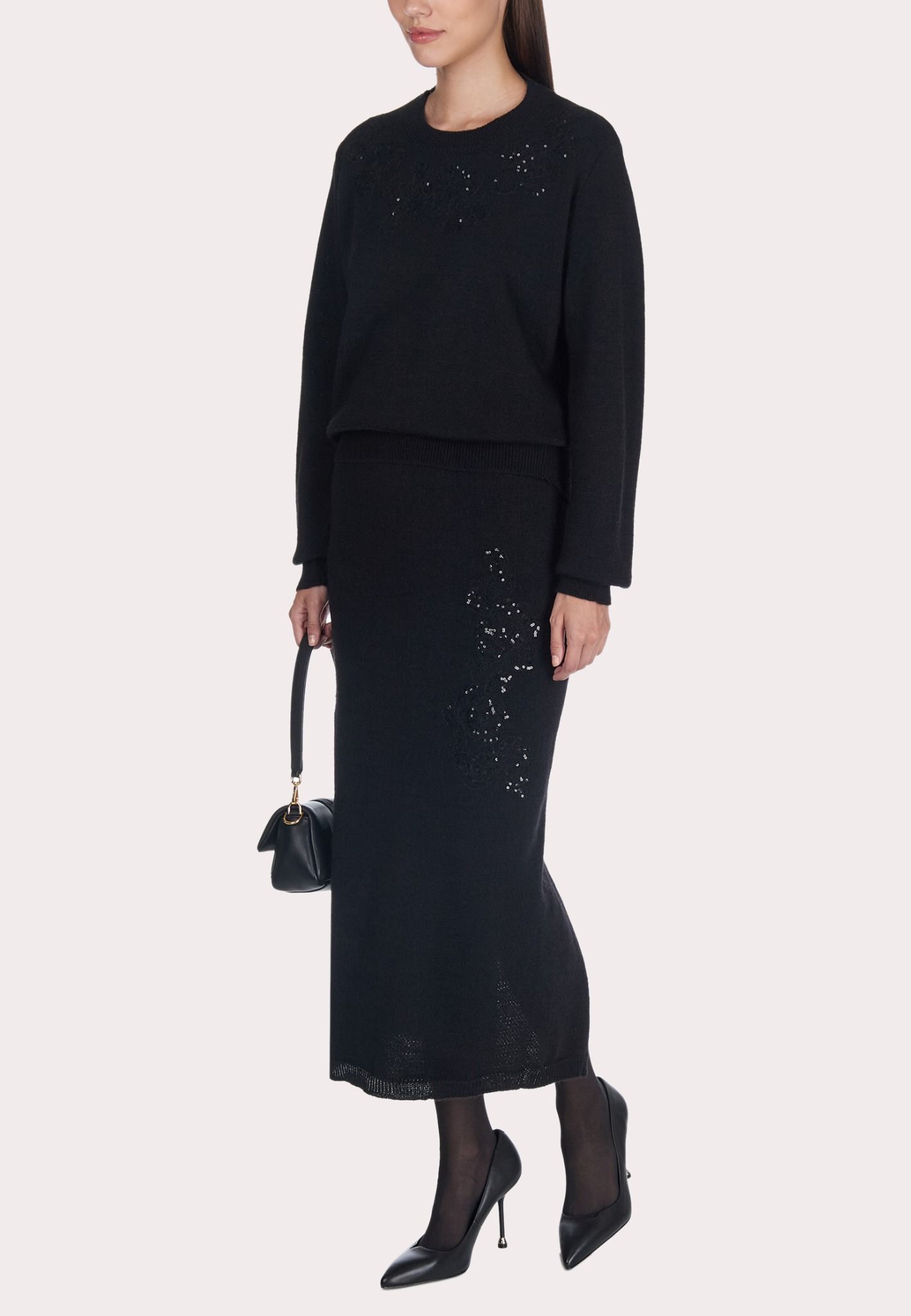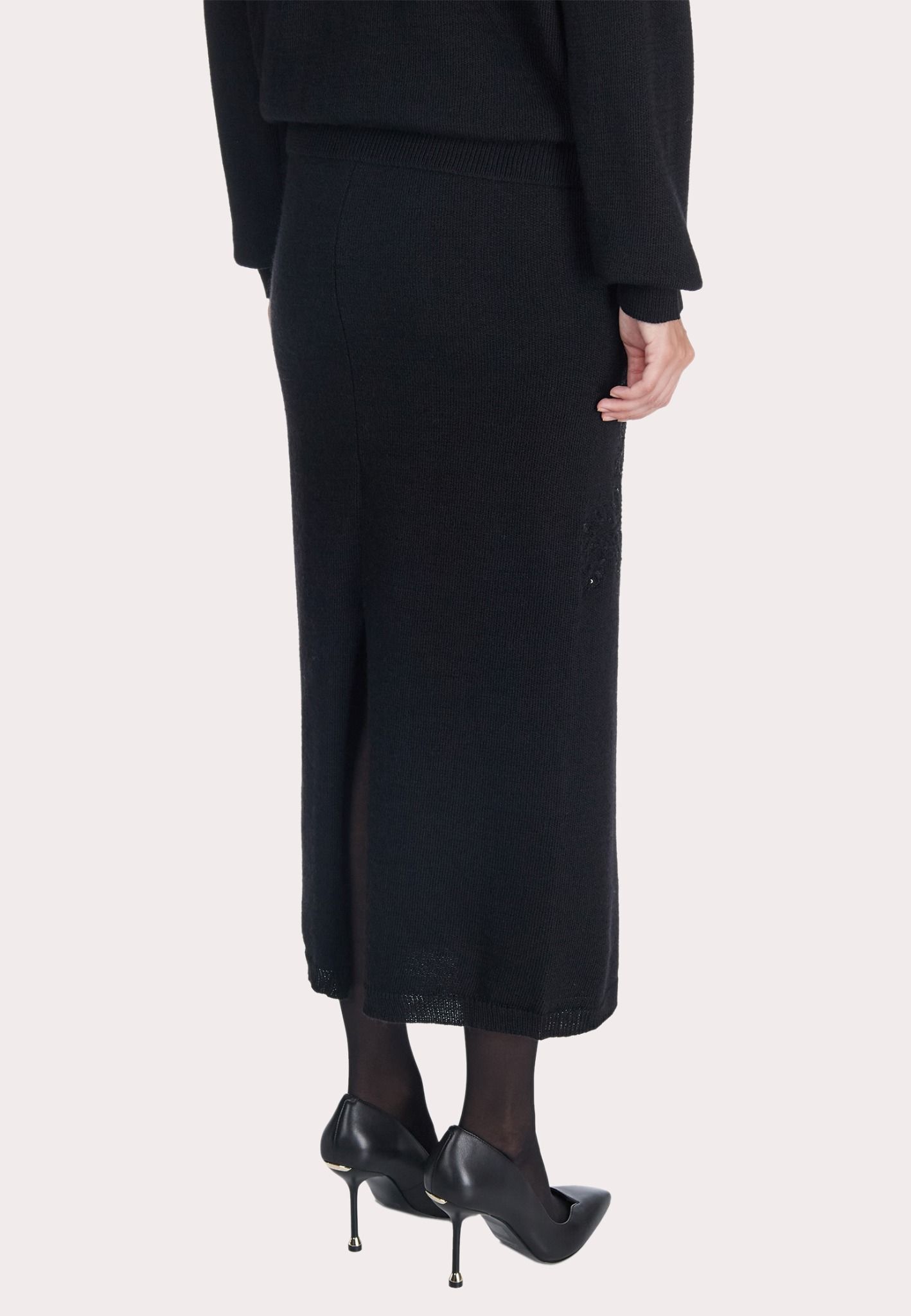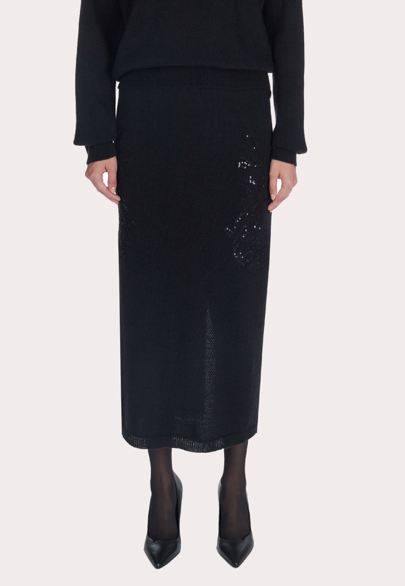 Chân váy chất sợi màu đen, cạp chun có dây rút, 2 bên thân gắn cườm tạo hoa cùng màu