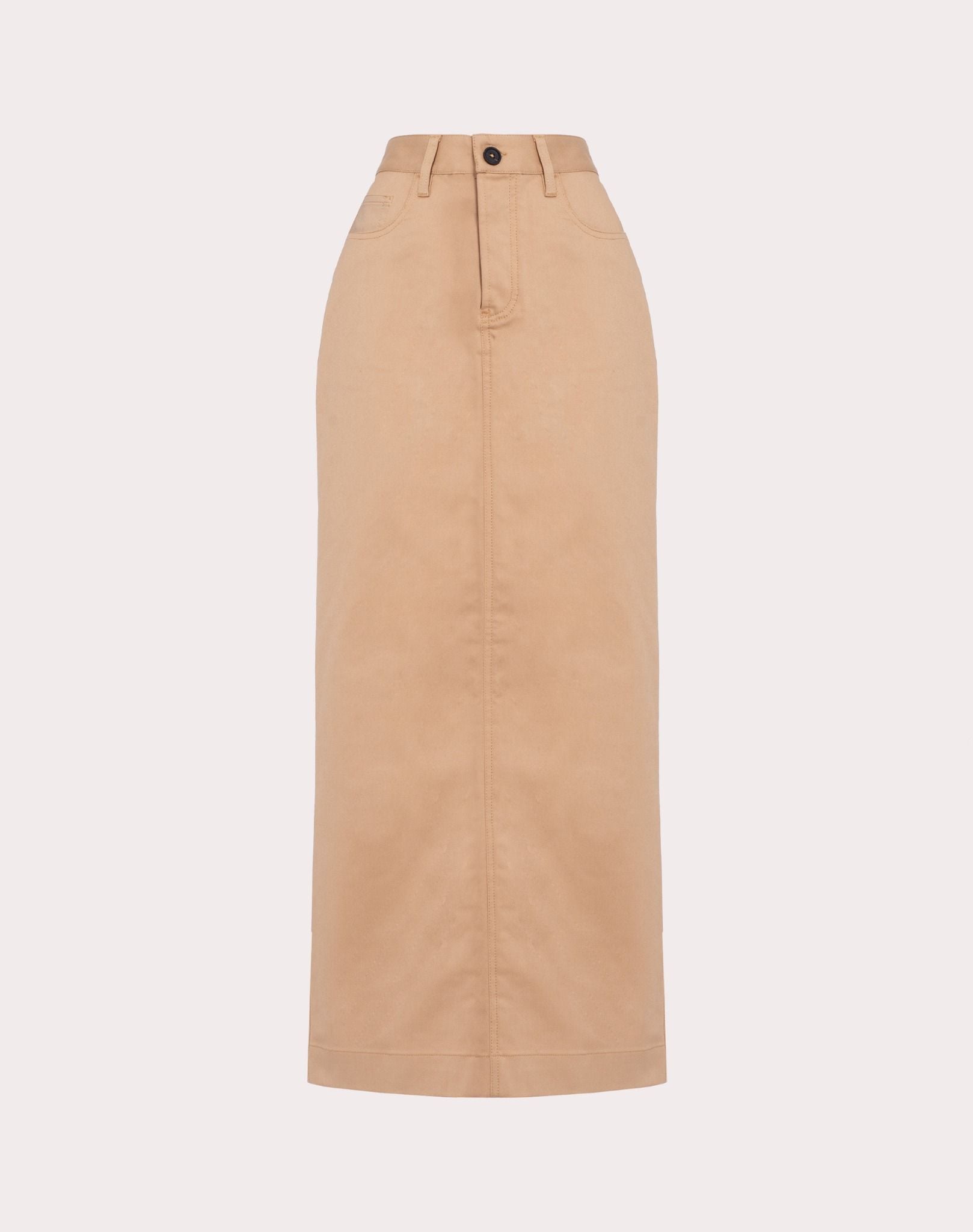 Chân váy kaki màu nâu dáng dài, thân trước 2 túi, thân sau 2 túi bổ , xẻ sau