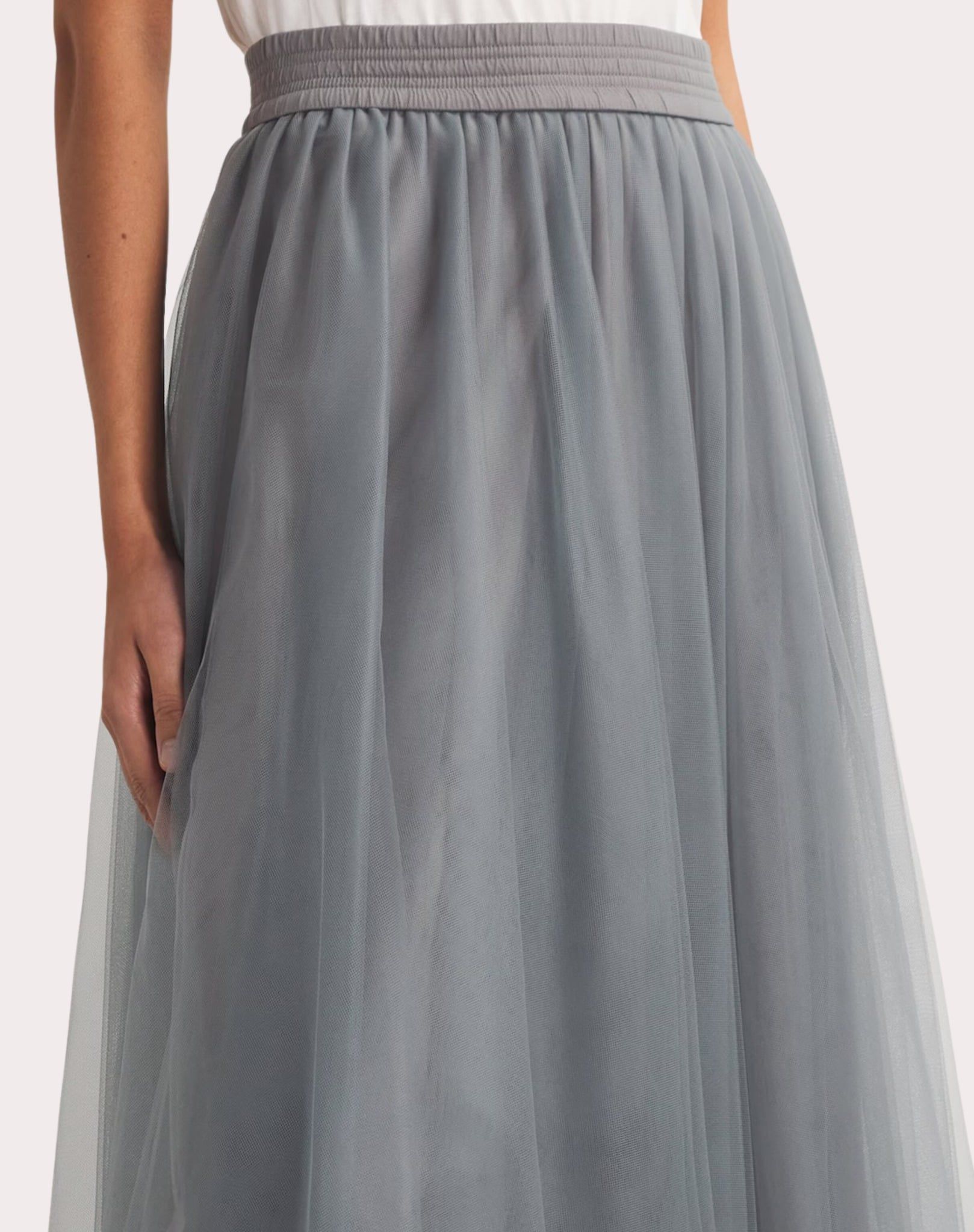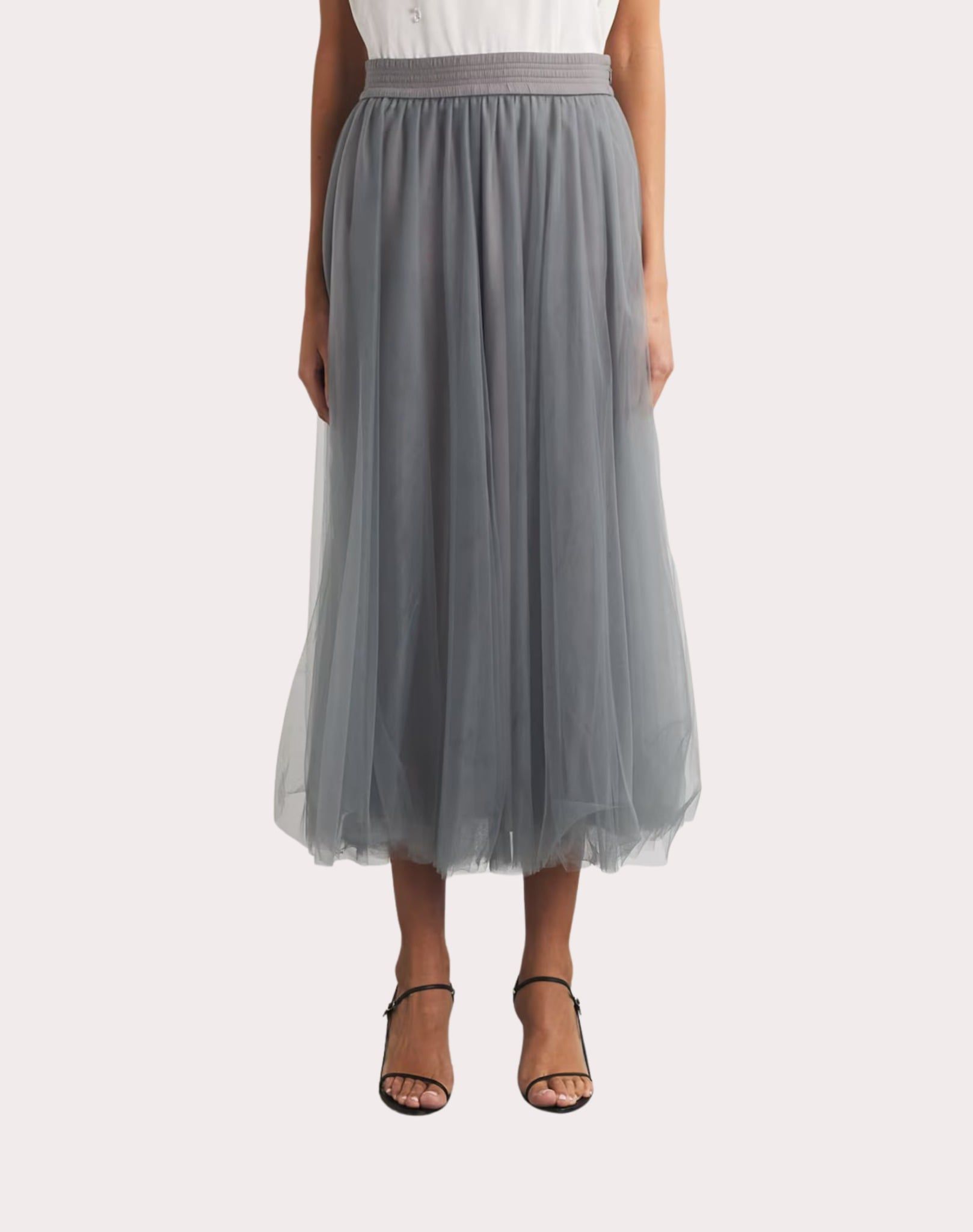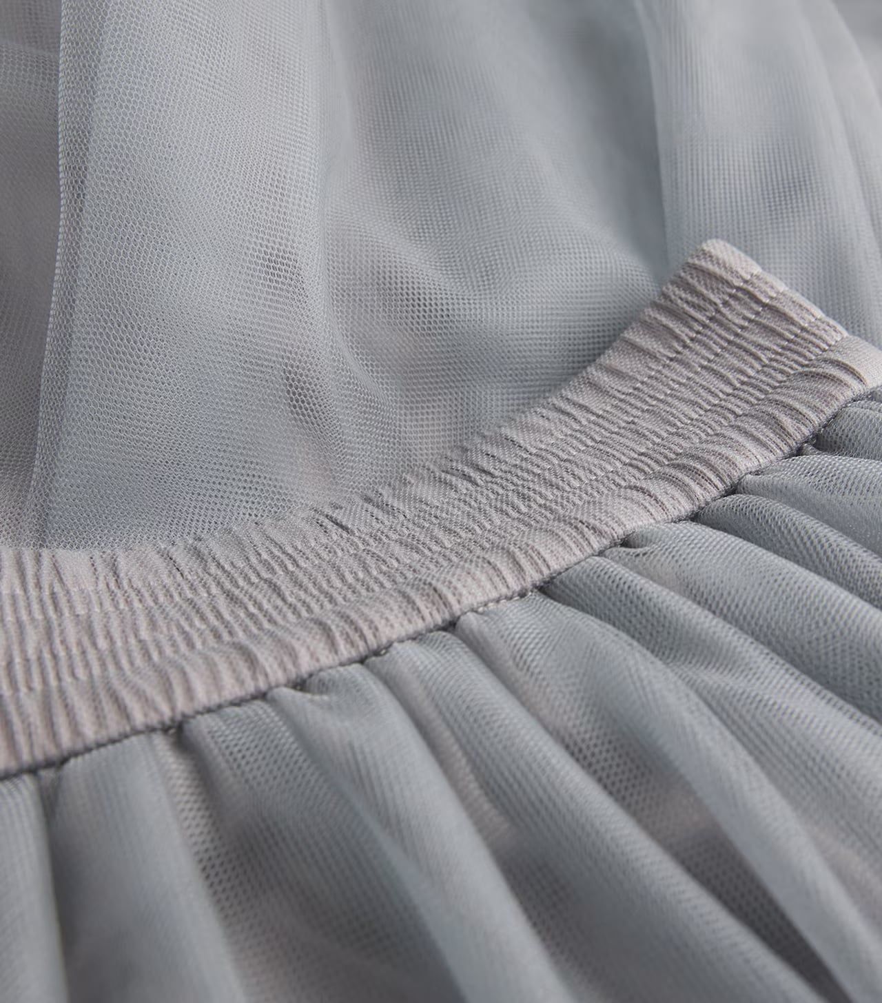 Chân váy chất ren lưới 2 lớp màu xanh nhạt, lót trong màu hồng, cạp chun