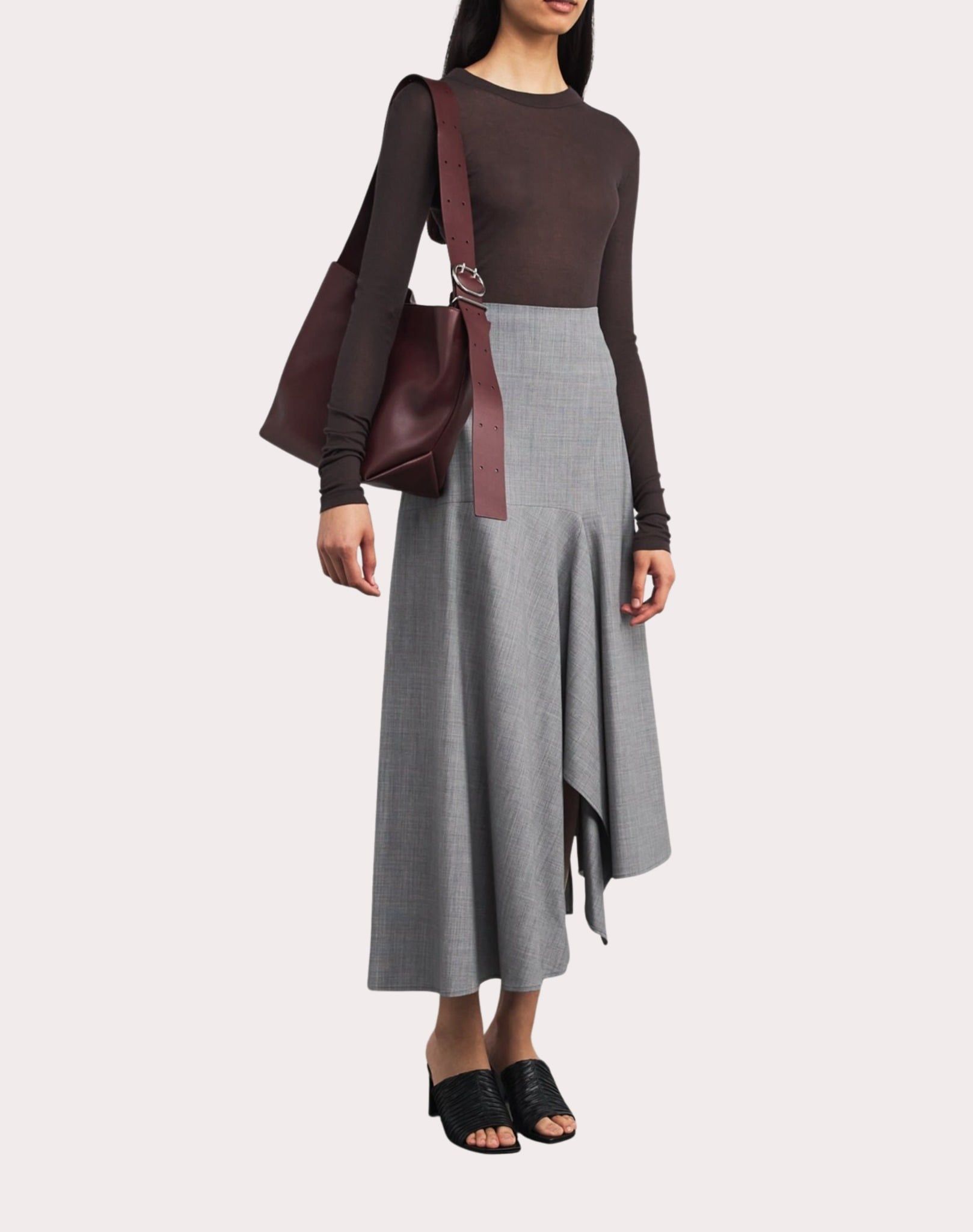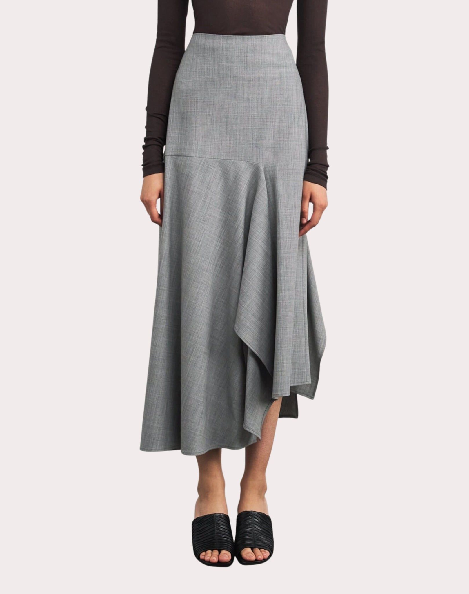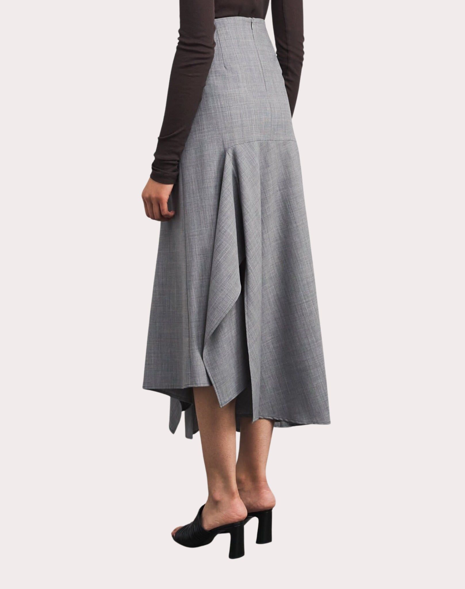 Chân váy màu ghi, thân dưới xếp ly, gấu chéo