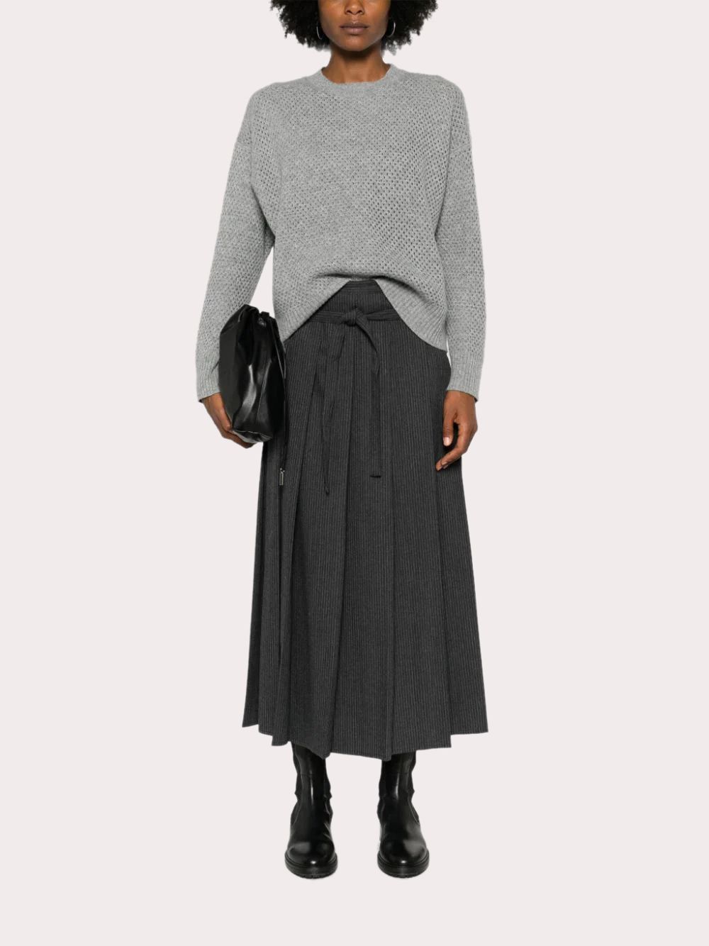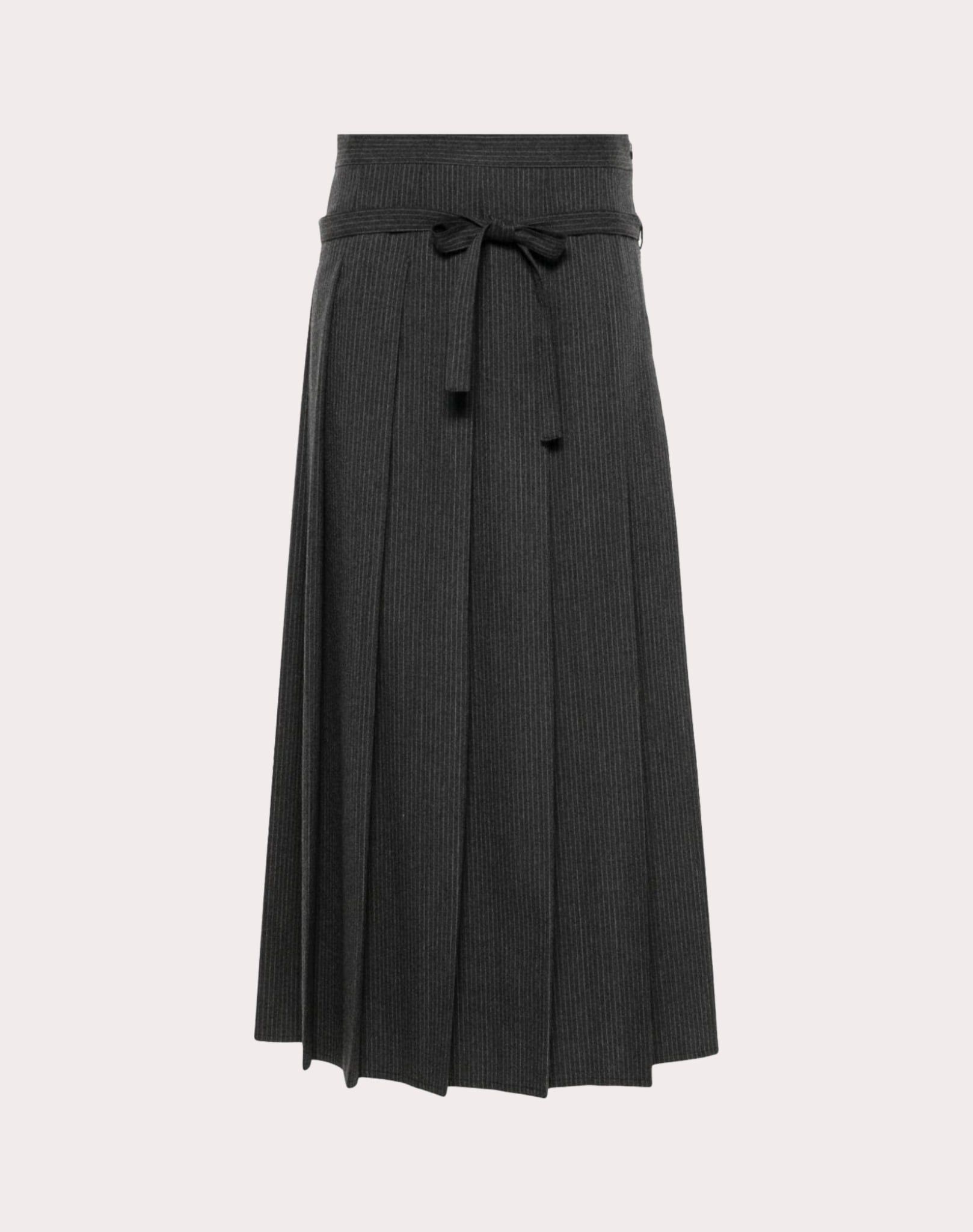 Chân váy dáng dài,toàn thân xếp li màu ghi đậm kẻ trắng,kéo khóa cạnh,hông may ghép đỉa luồn dây cùng màu