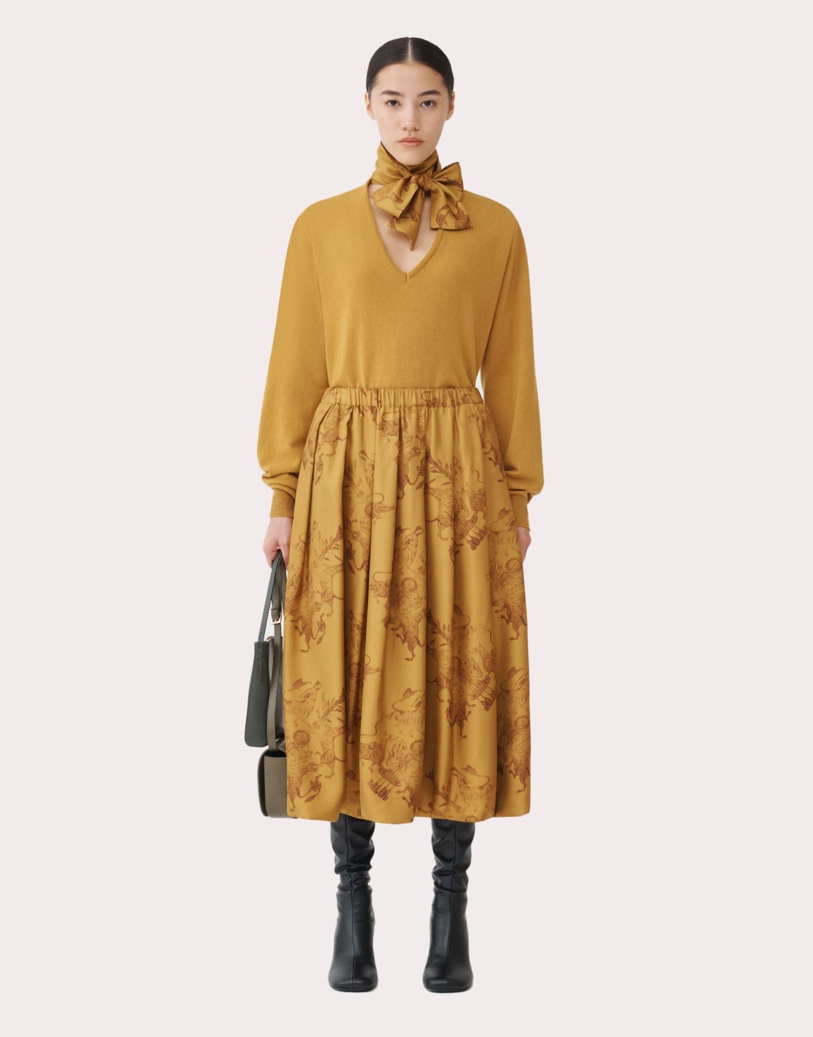 Chân váy màu vàng đậm,toàn thân xếp li họa tiết người thú màu nâu,cạp chun,có hai túi sườn