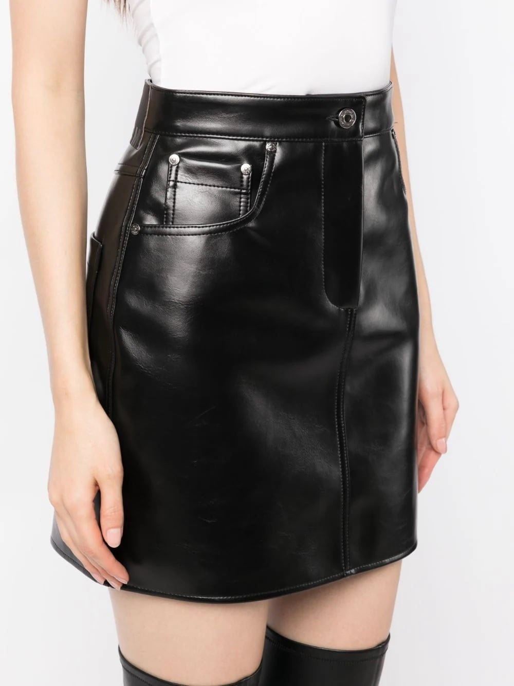 Chân váy ngắn chất da màu đen kéo khóa cài khuy trước, cạp sau gắn miếng da dập chìm chữ MSGM