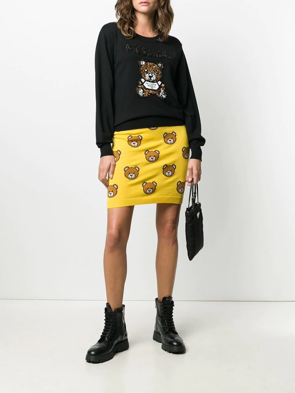 Chân váy dang bút chì chất liệu len sợi màu trắng toàn thân họa tiết gấu màu nâu