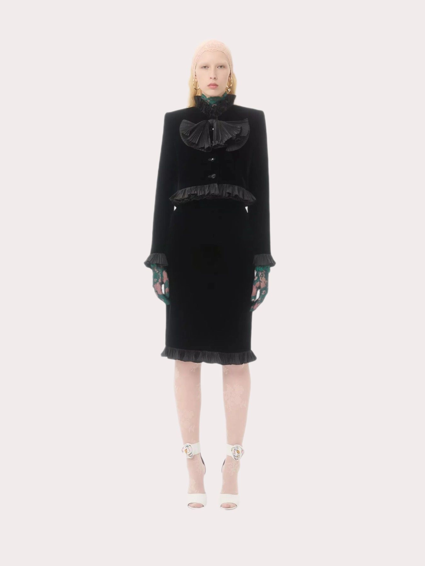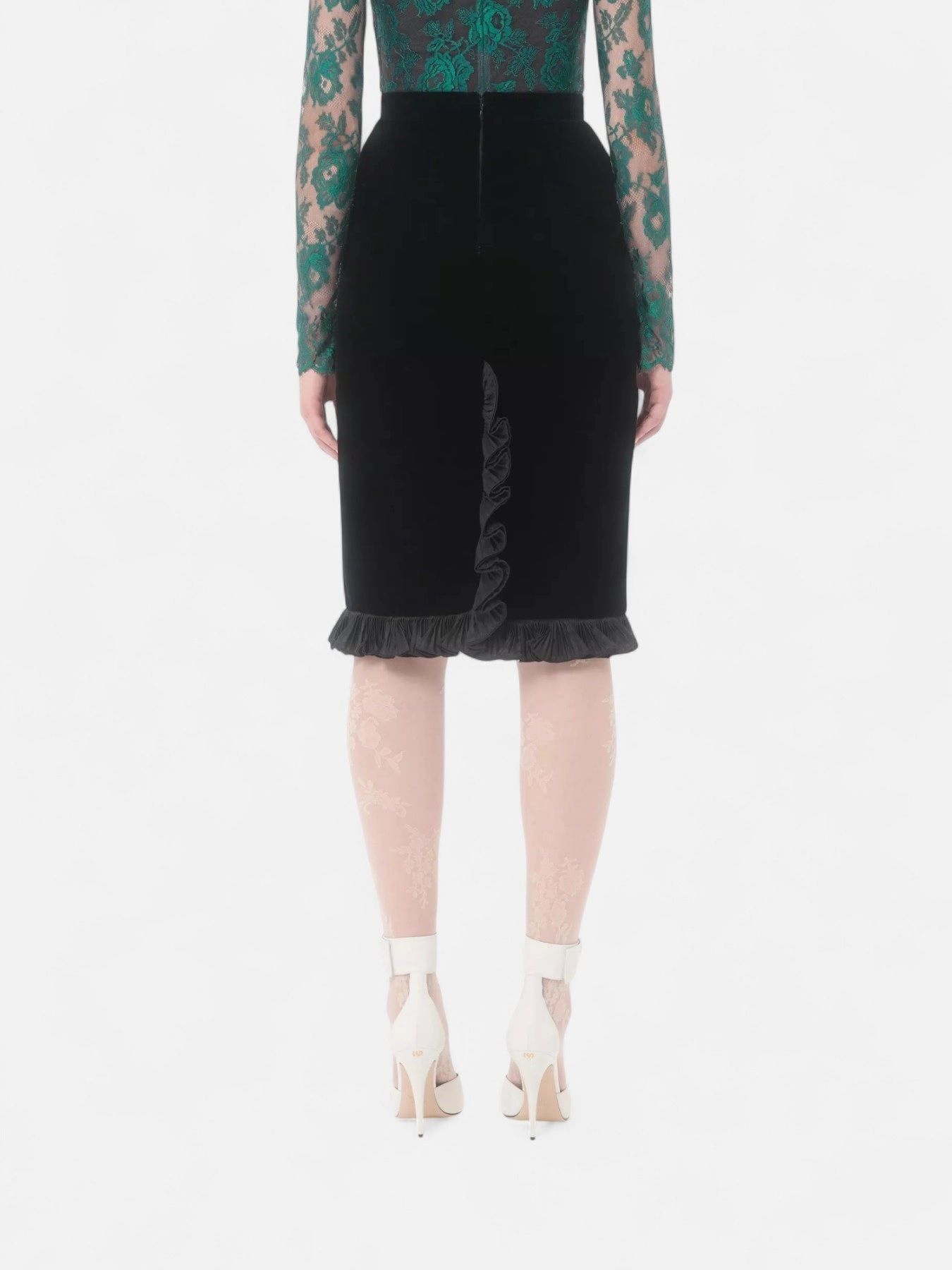 Chân váy chất vải nhung màu đen, gấu pha vải đen xếp ly