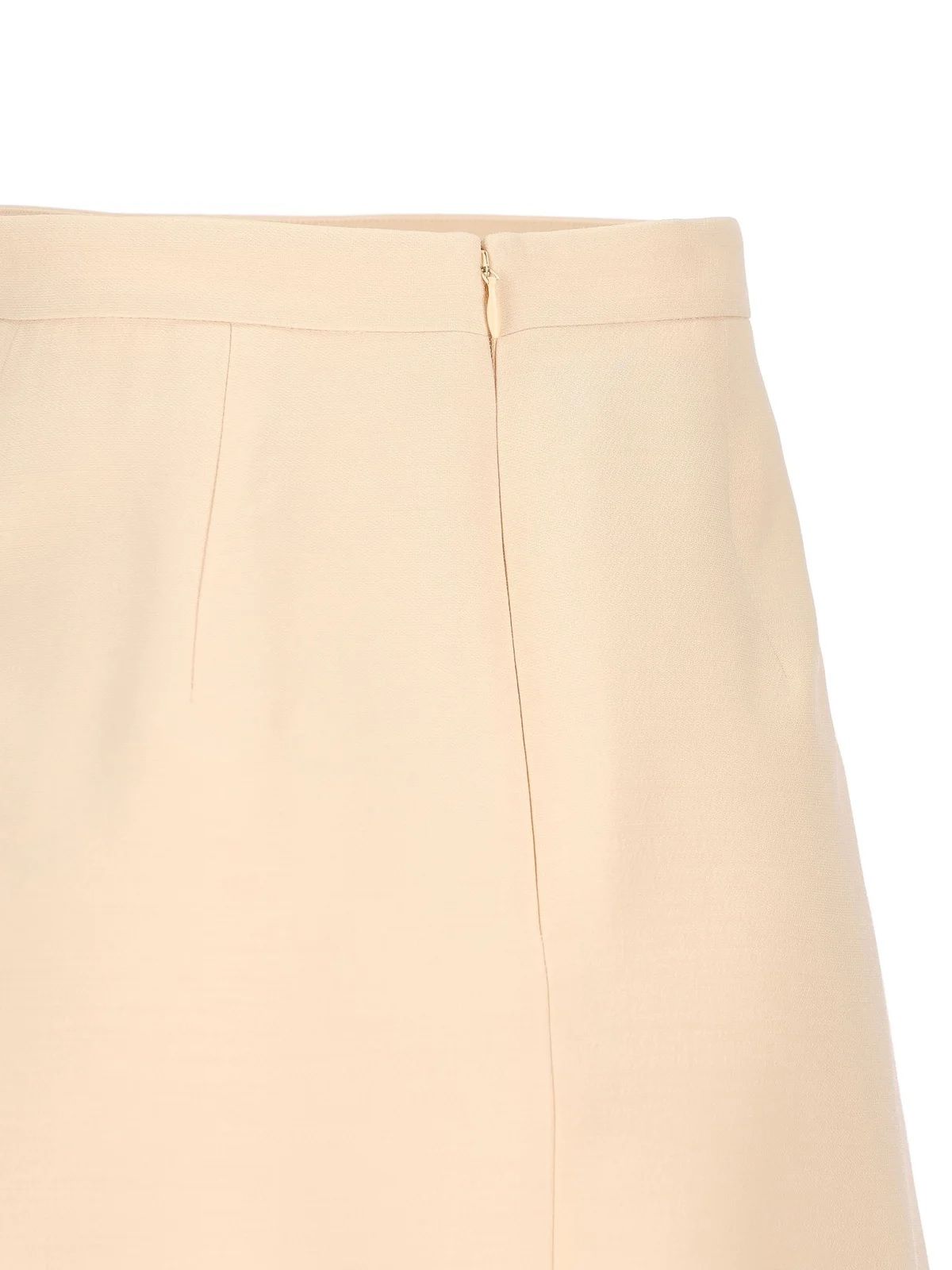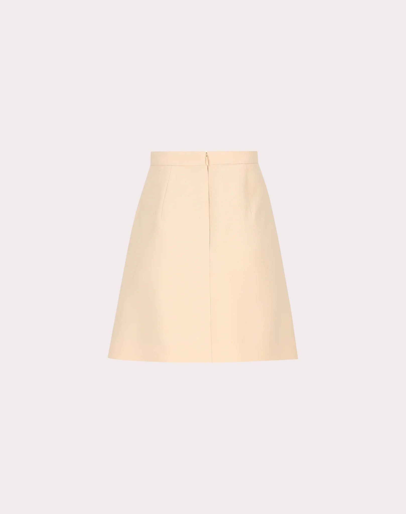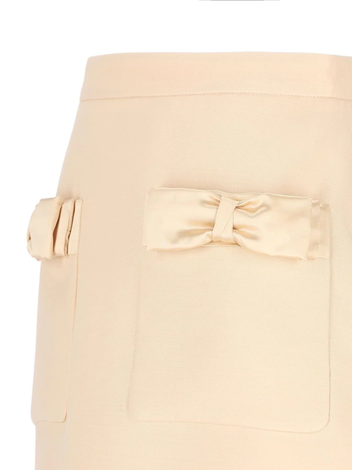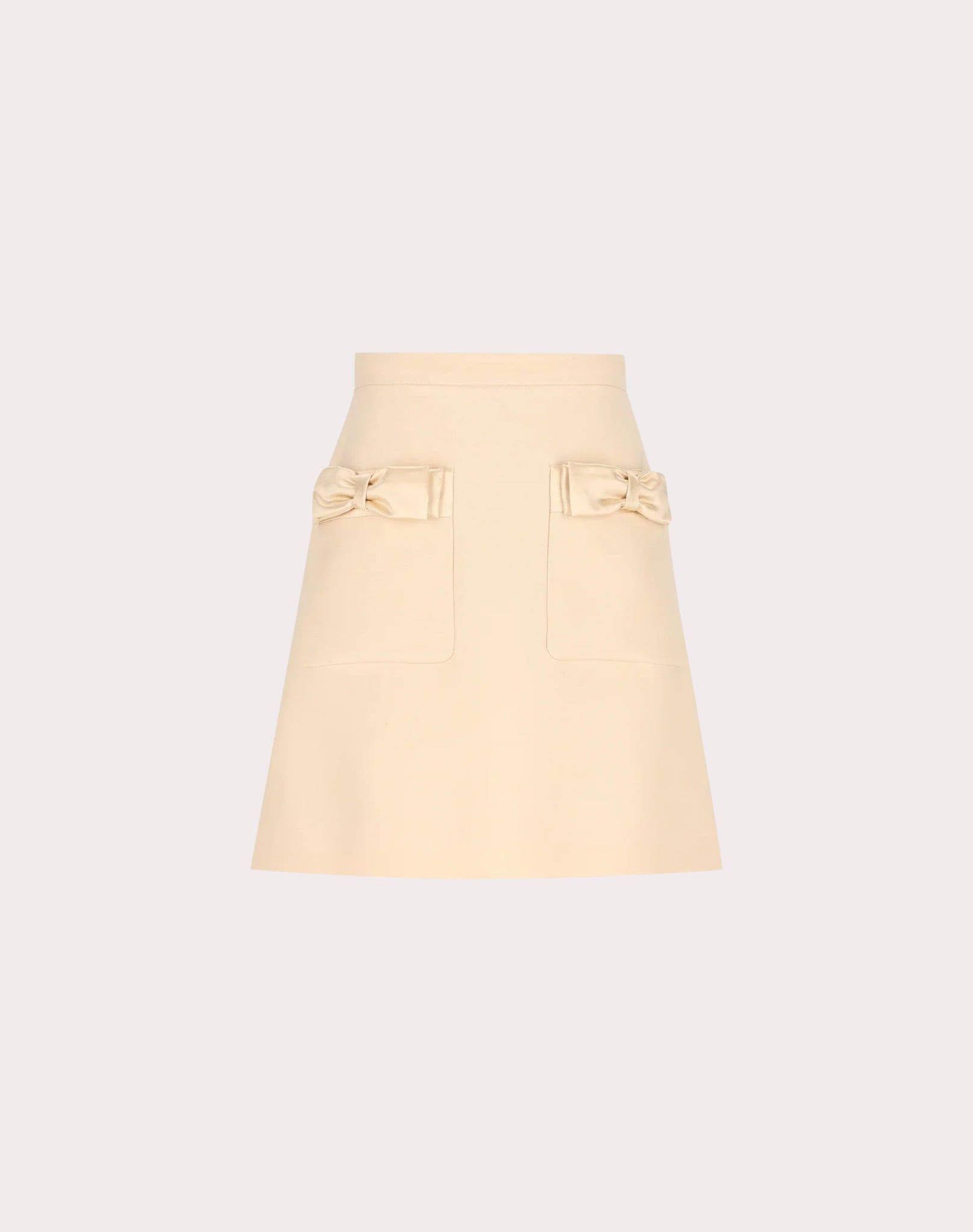 Chân váy dáng ngắn màu be, kéo khóa sau, thân trước có 2 túi miệng túi gắn nơ cùng màu
