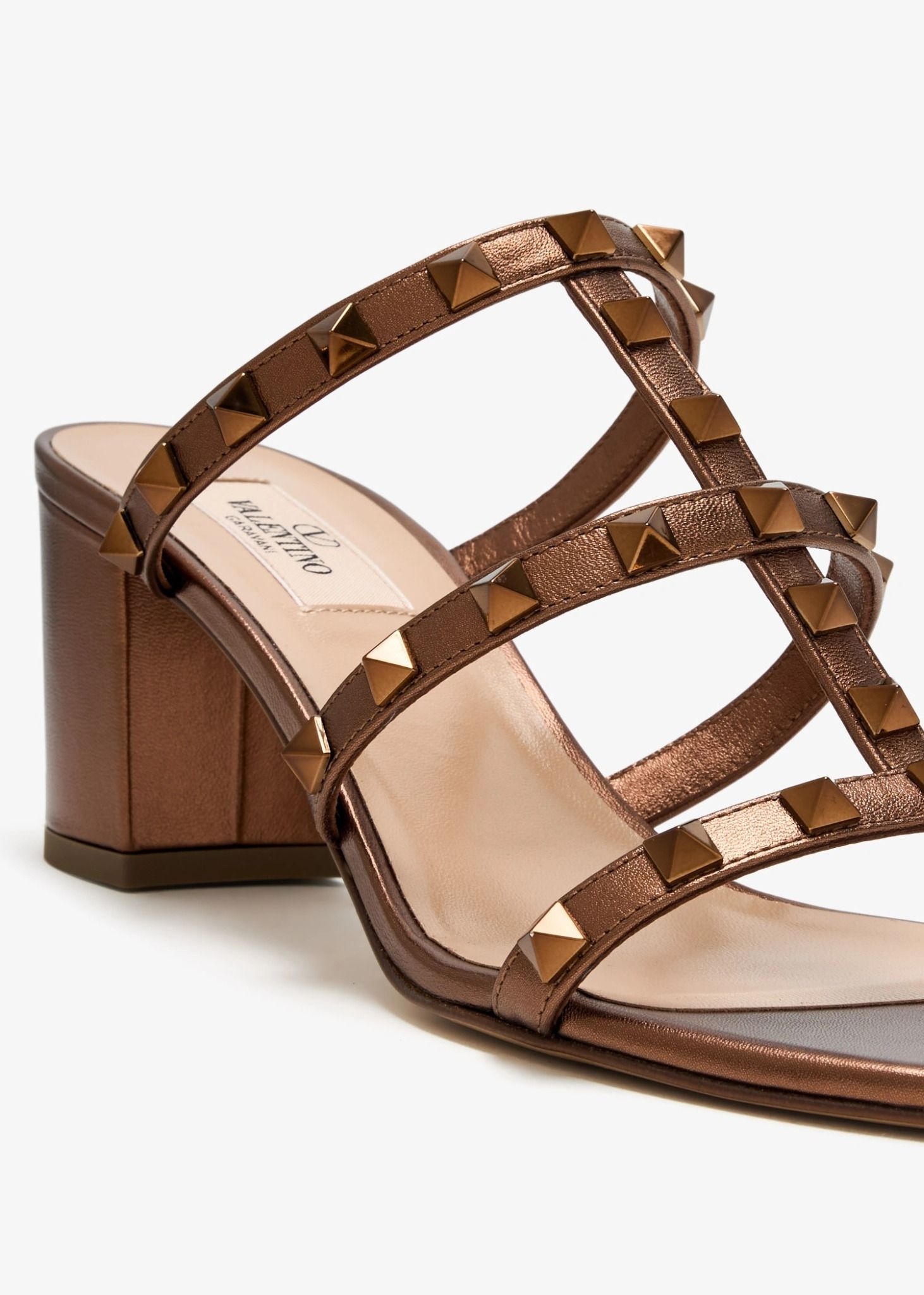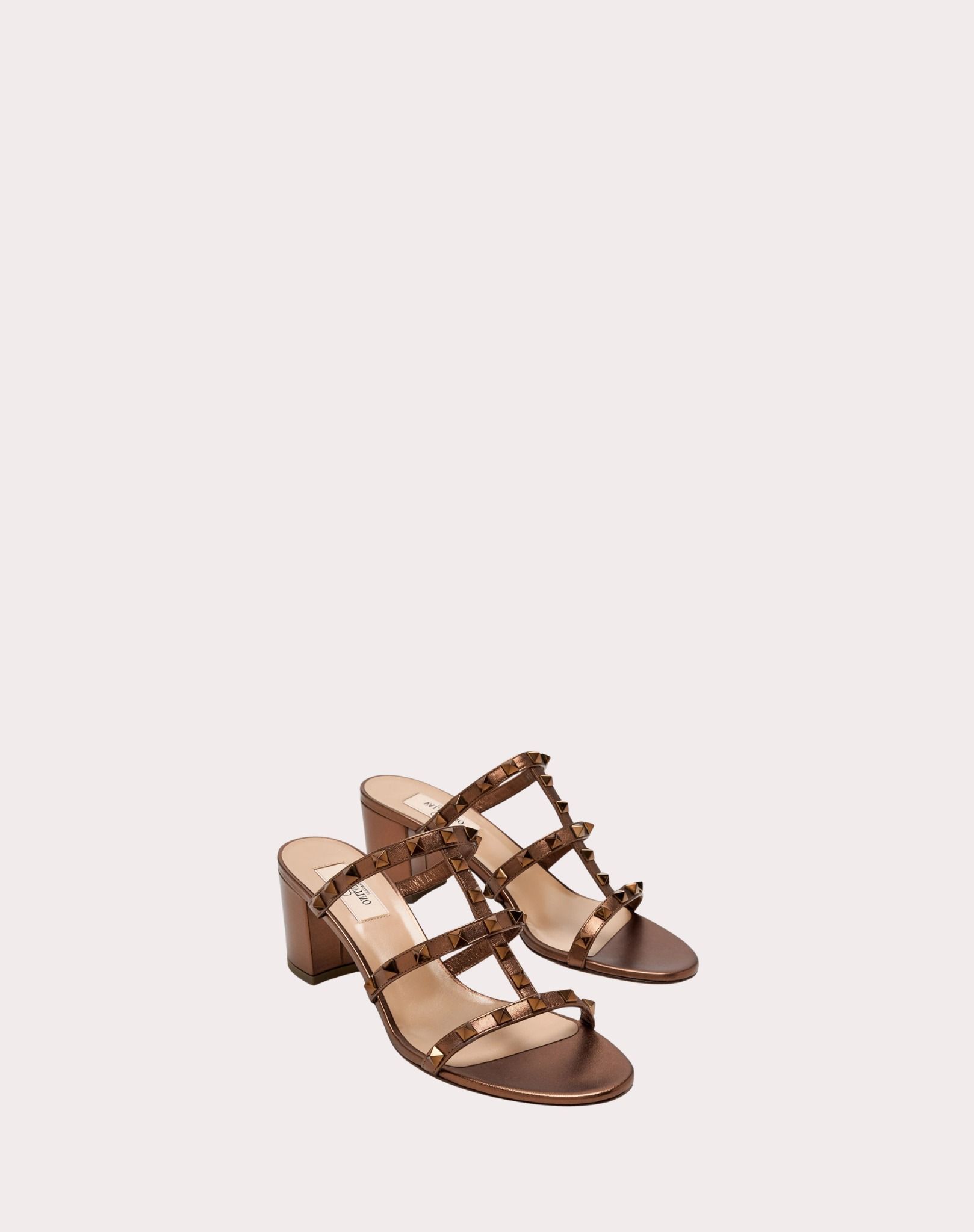 Dép nữ cao gót da màu nâu, 3 quai đính đinh tán cùng màu, gót cao 6cm