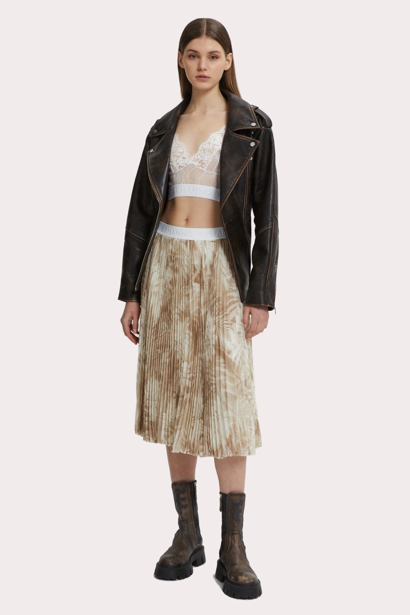 Chân váy xếp ly nền màu nâu họa tiết hoa trắng, Cạp chun màu trắng thêu chữ Ermanno cùng màu, có lót màu trắng