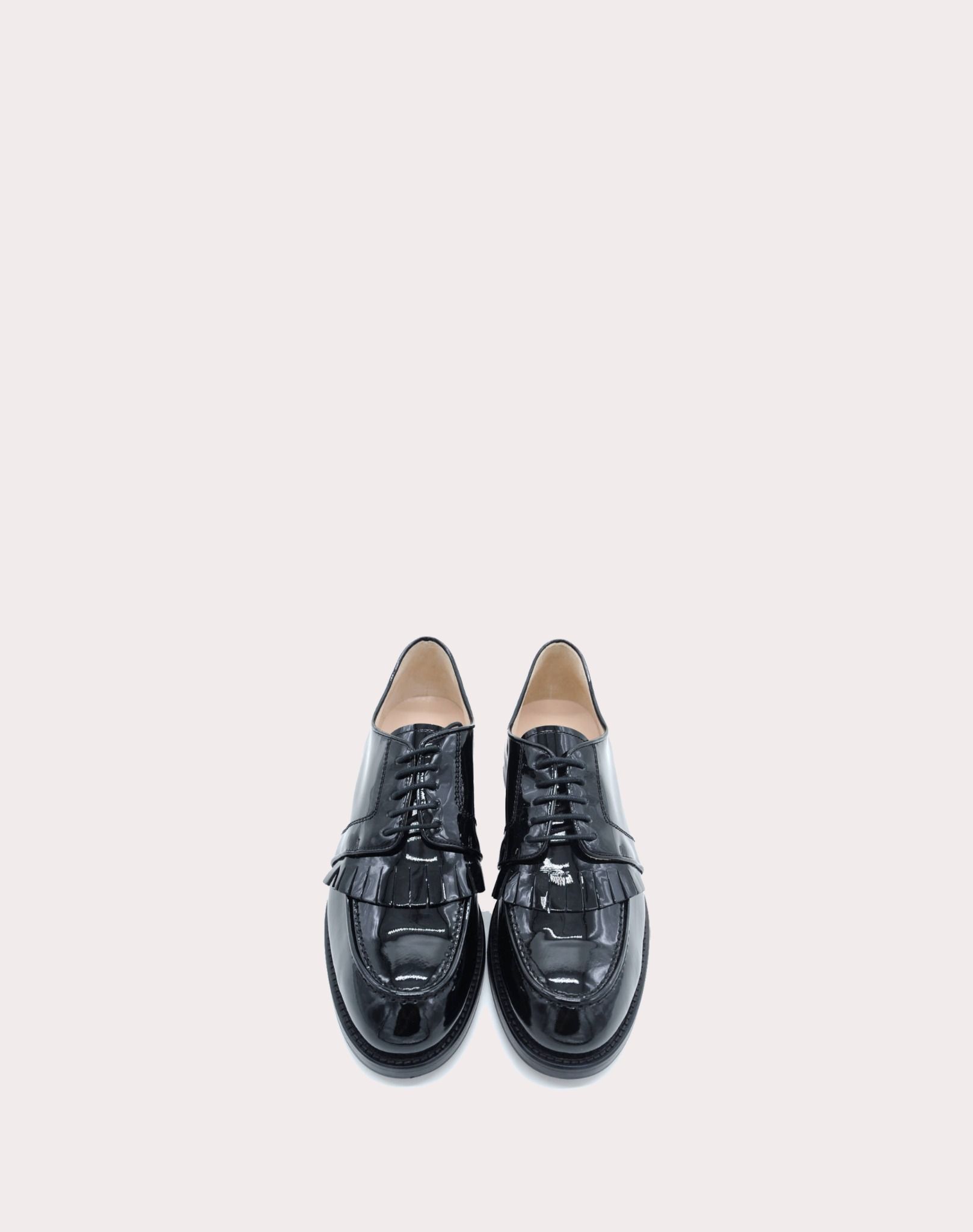 giày nữ da đen bóng buộc dây, phía mũi pha da cắt tua rua
