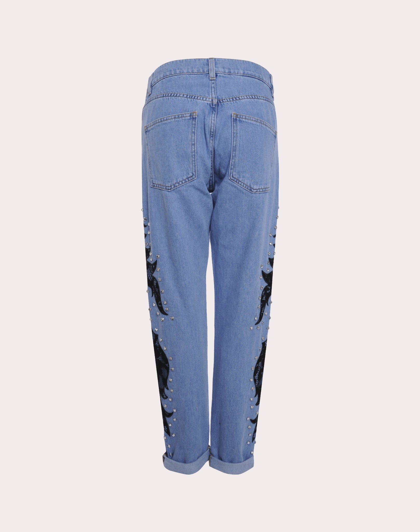 Quần jean nữ màu xanh bò, may ghép ren đen và gắn đá trắng - Trousers 100%CO