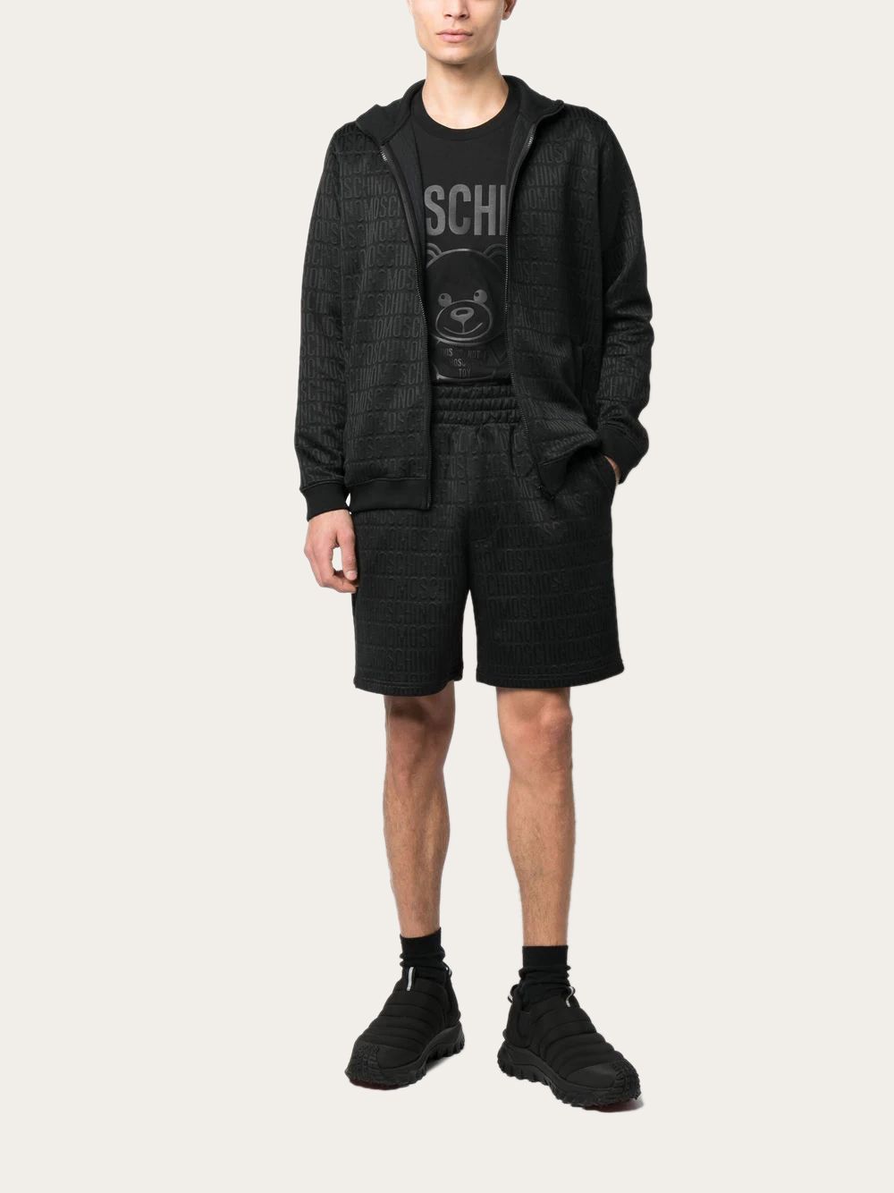 Quần short nam cạp chun có dây rút phía trong, nền màu đen toàn thân họa tiết chữ Moschino phồng màu nâu đen