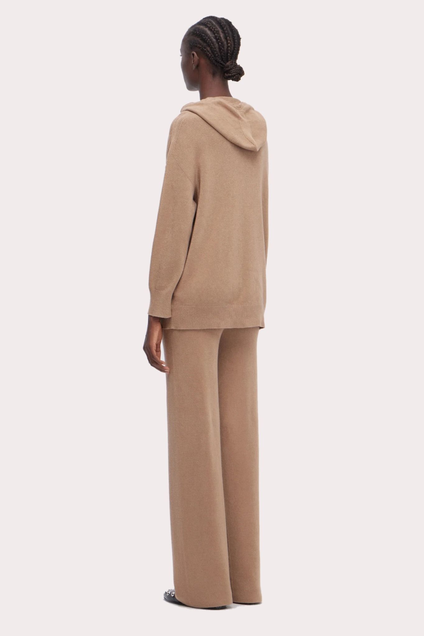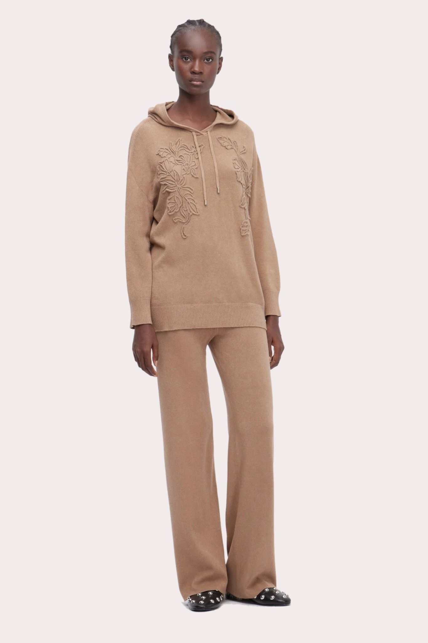 Quần nữ chất sợi màu nâu nhạt cạp chun, hông trái thêu logo cùng màu