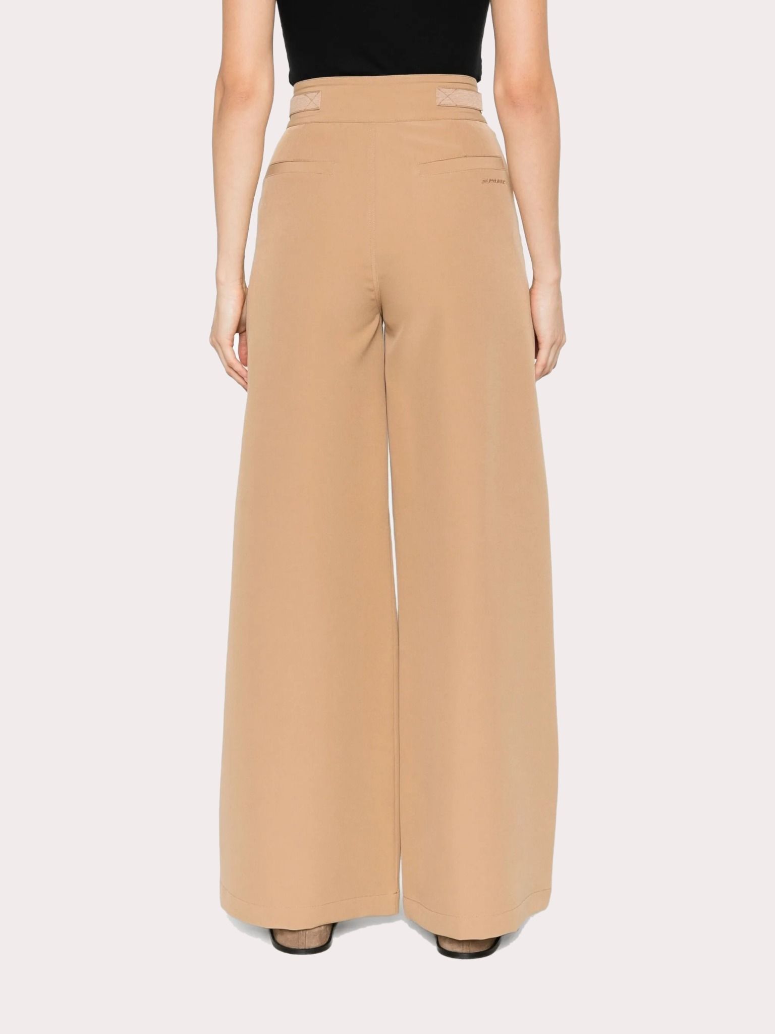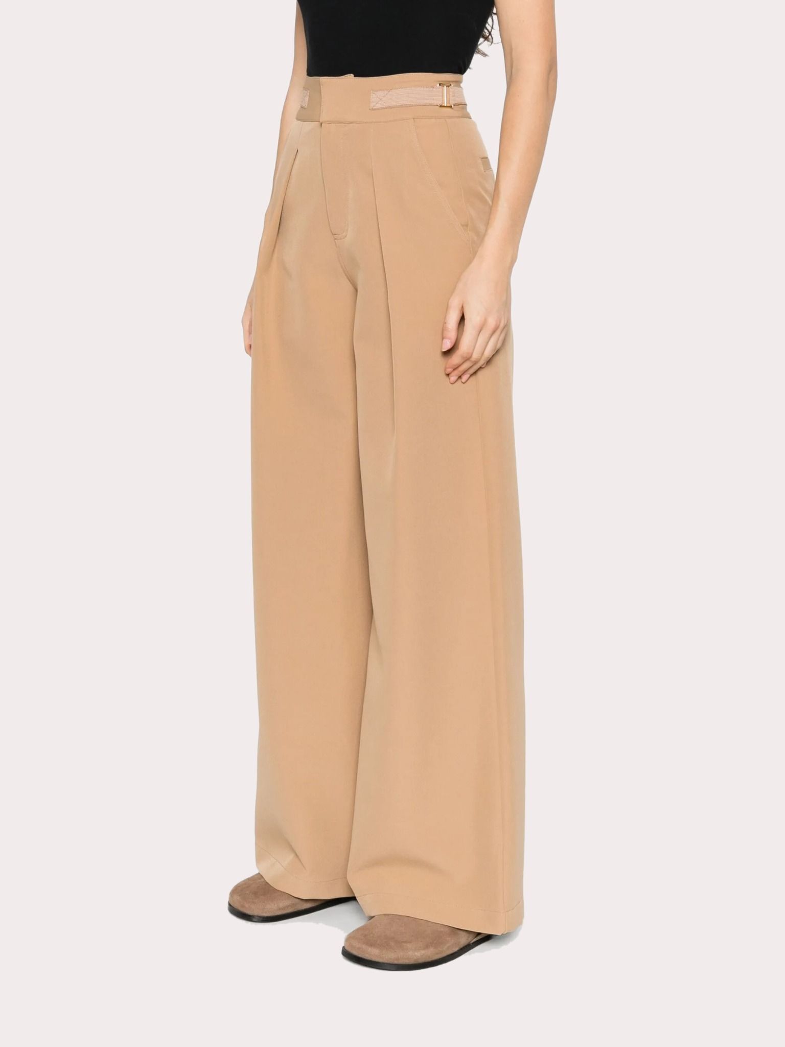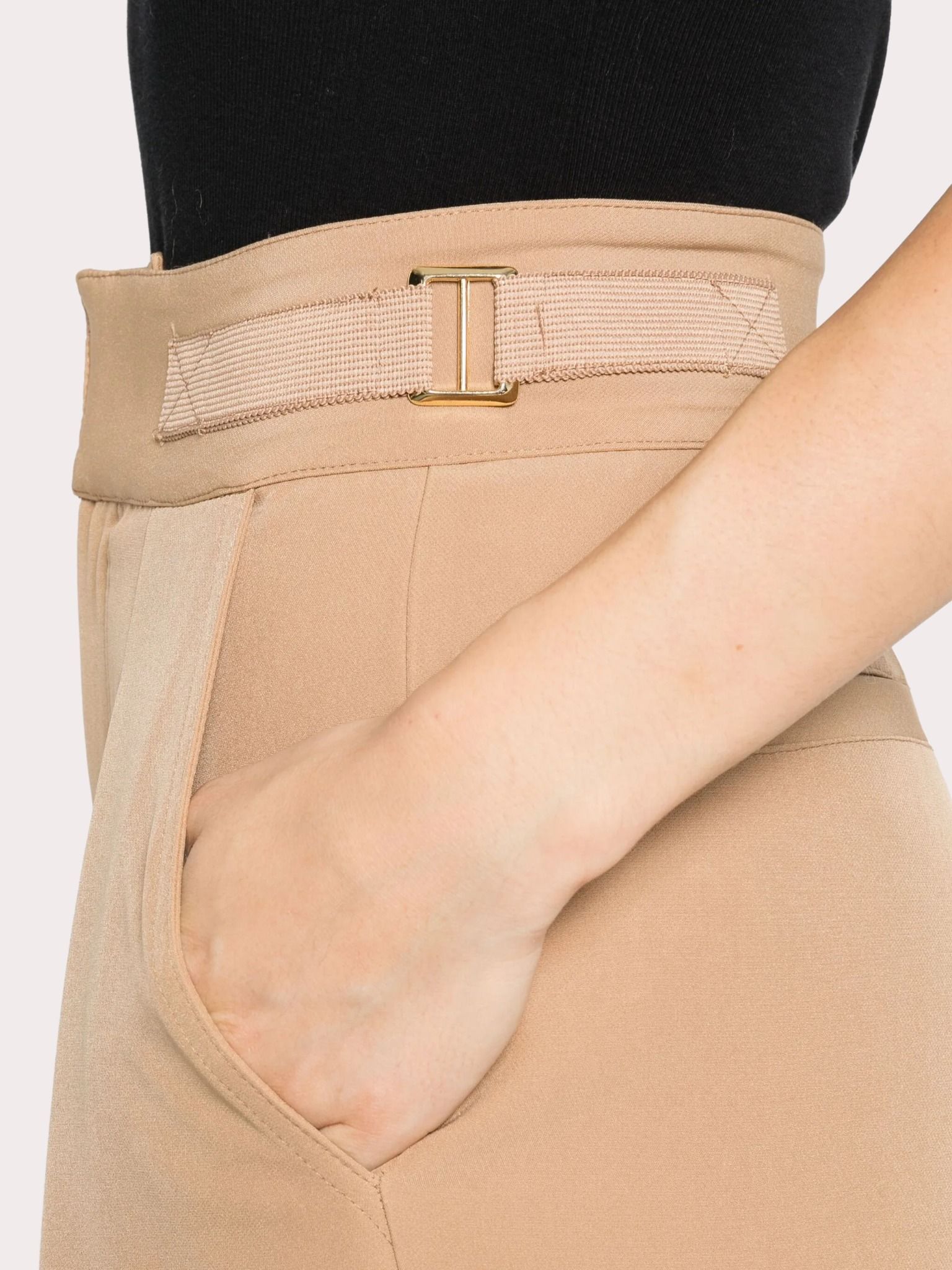 Quần tây nữ màu nâu, trước có 2 túi chéo sau có 2 túi bổ, cạp may ghép đai có khóa cài