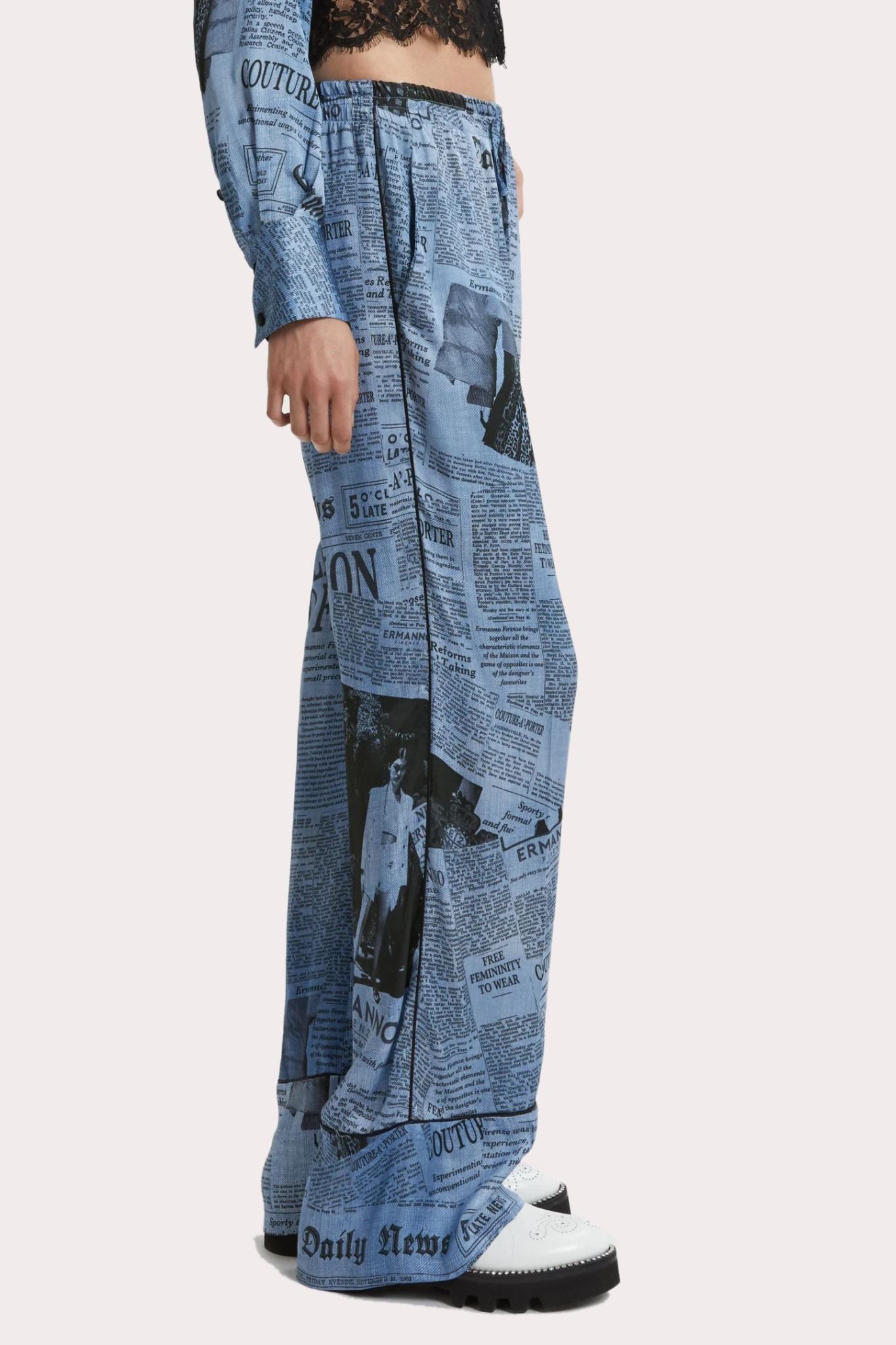 Quần nữ màu xanh biển nhạt,cạp chun có dây rút,toàn thân in họa tiết hoa đen,trước có 2 túi chéo,gấu+ viền may ghép nổi gân đen