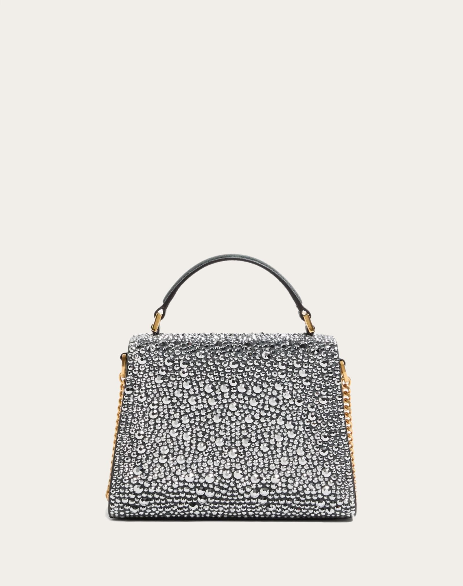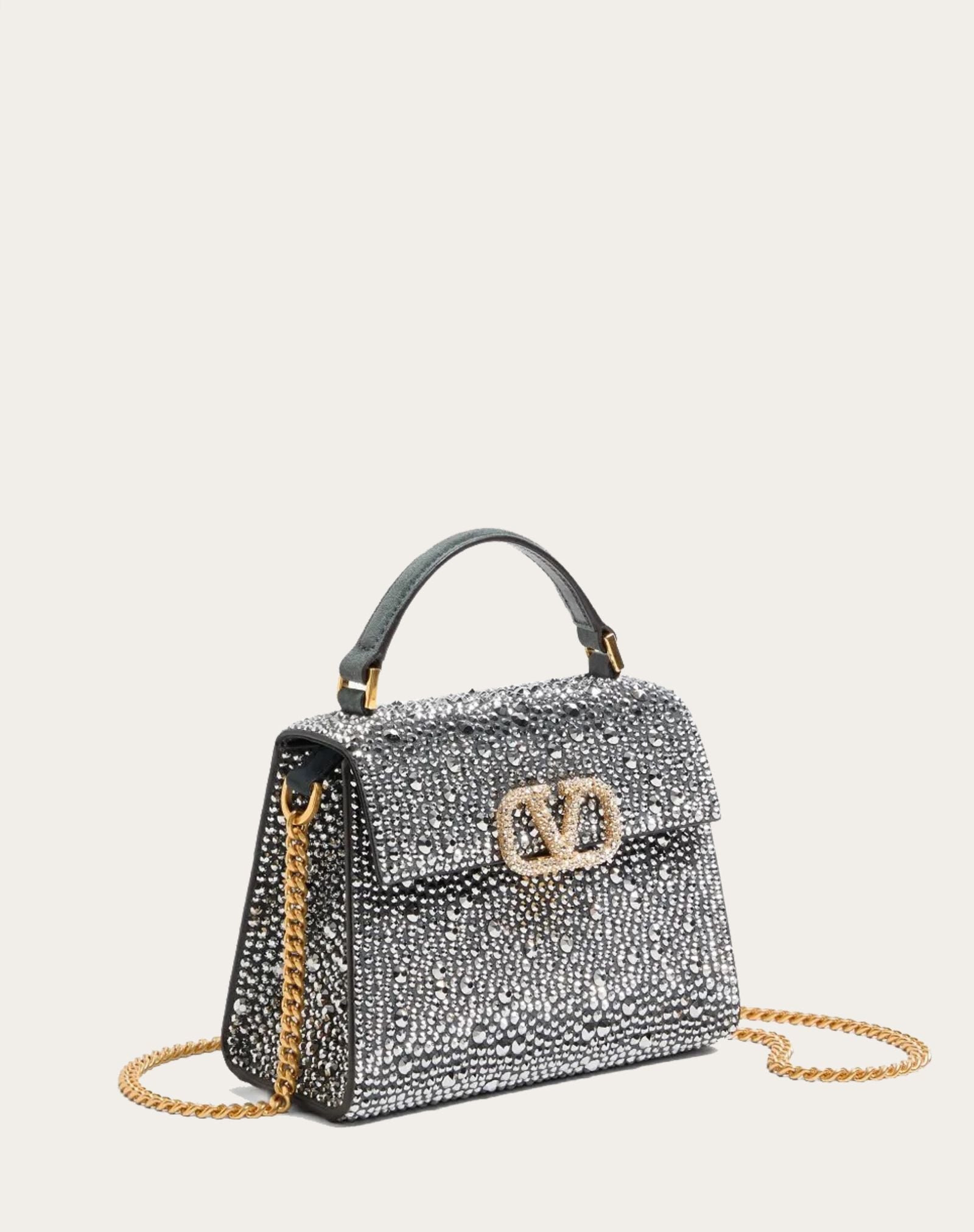 Túi nữ da lộn màu ghi xám, hình thang toàn thân đính đá trắng, nắp logo màu vàng đính đá trắng, 1 quai xách 1 quai đeo, kích thước 20x16