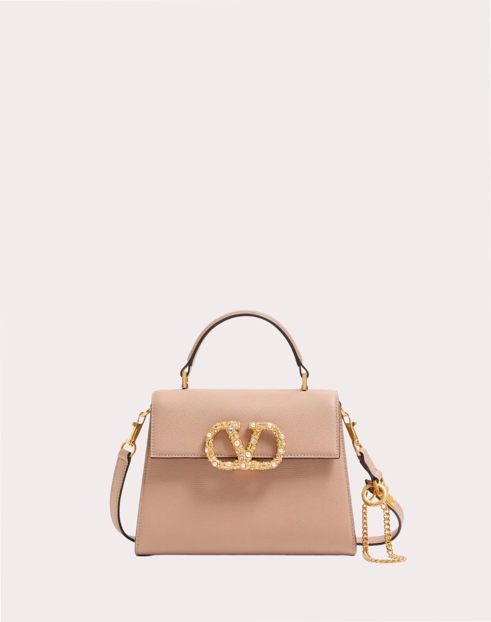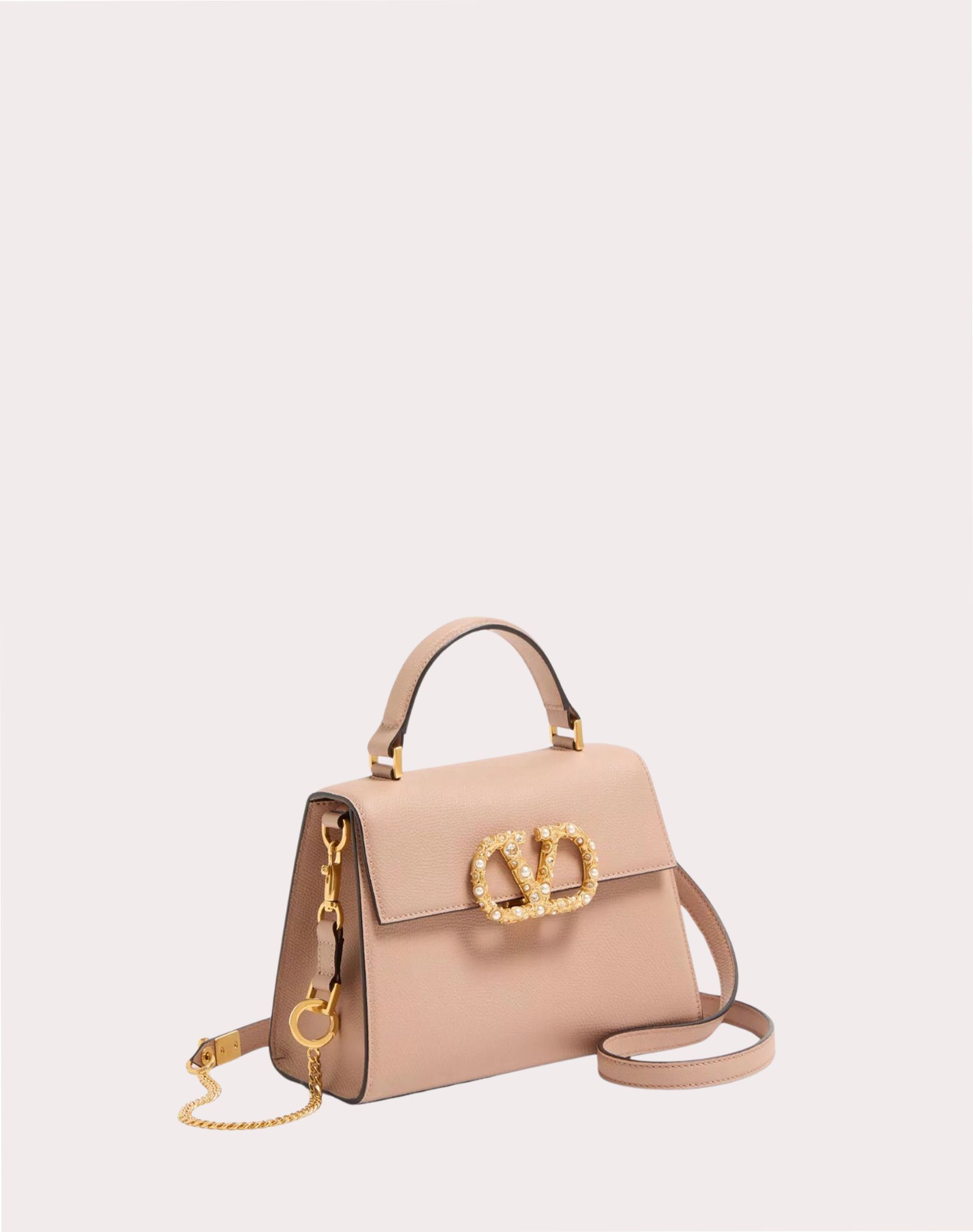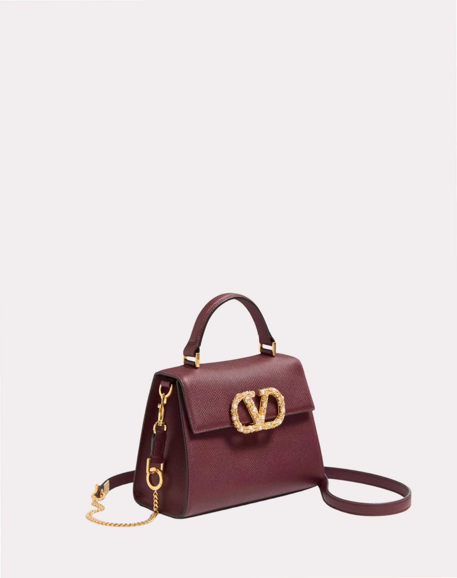 Túi nữ hình thang da màu nâu bã trầu, nắp khóa gắn logo chữ V màu vàng đính đá và ngọc trai màu trắng, 1 quai xách 1 quai đeo, kích thước 21x17