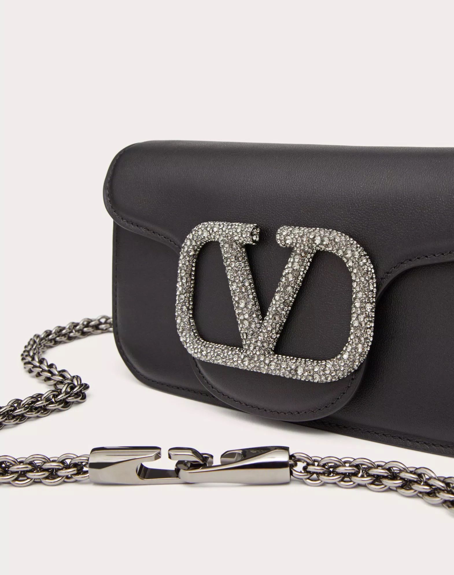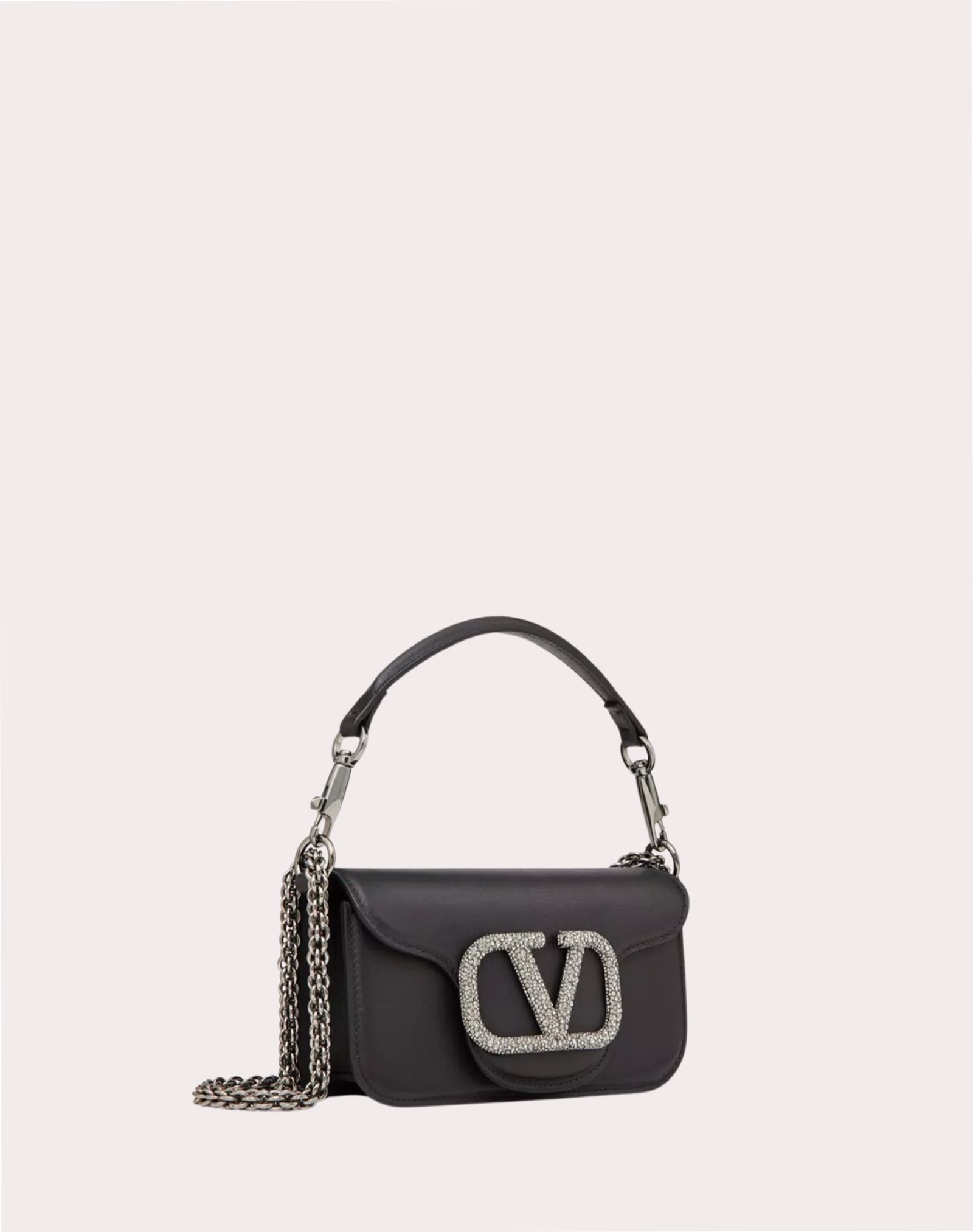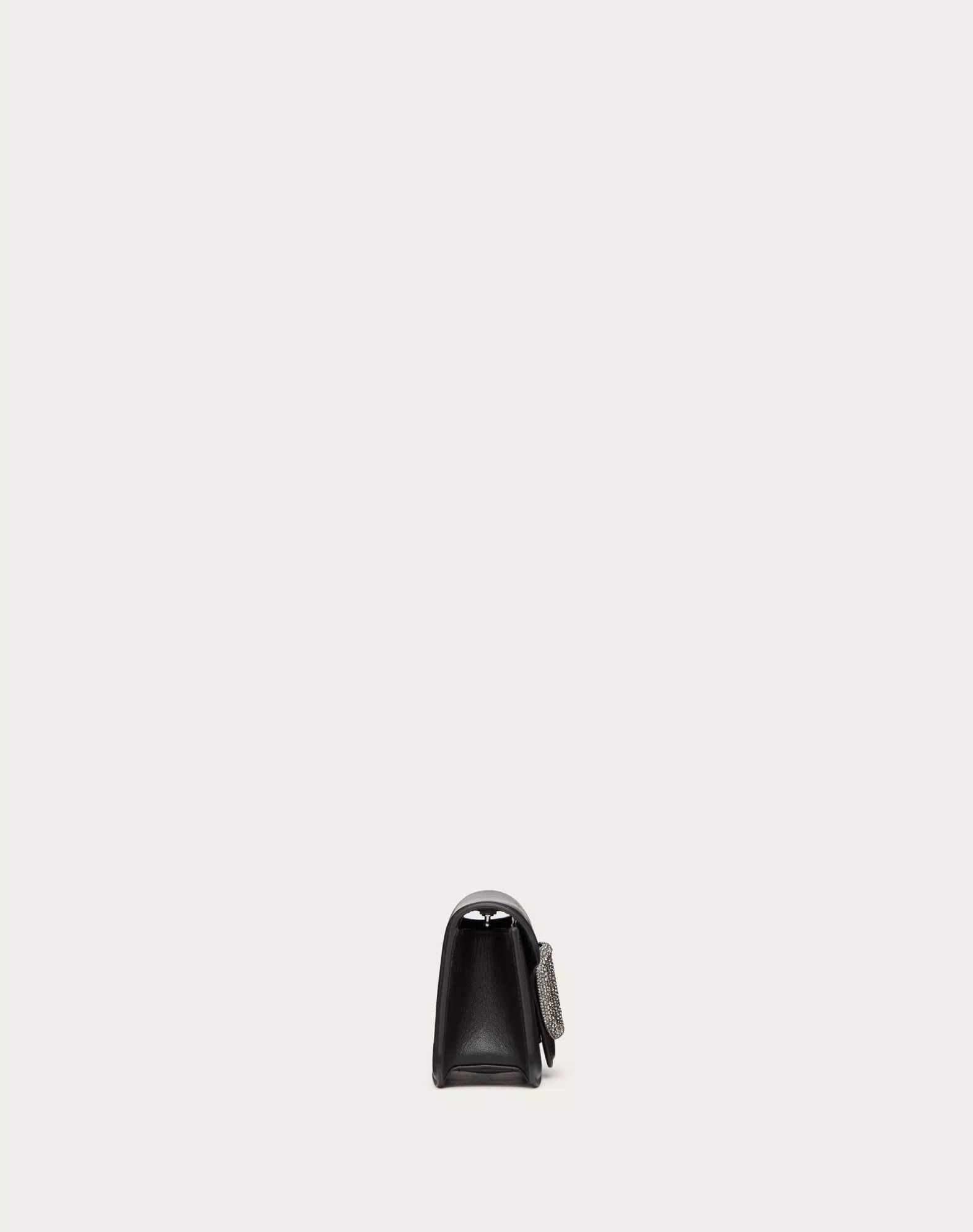 Túi nữ da màu đen nắp túi gắn logo chữ V đính đá màu trắng, 1 quai xách 1 quai đeo, kích thước 19x10
