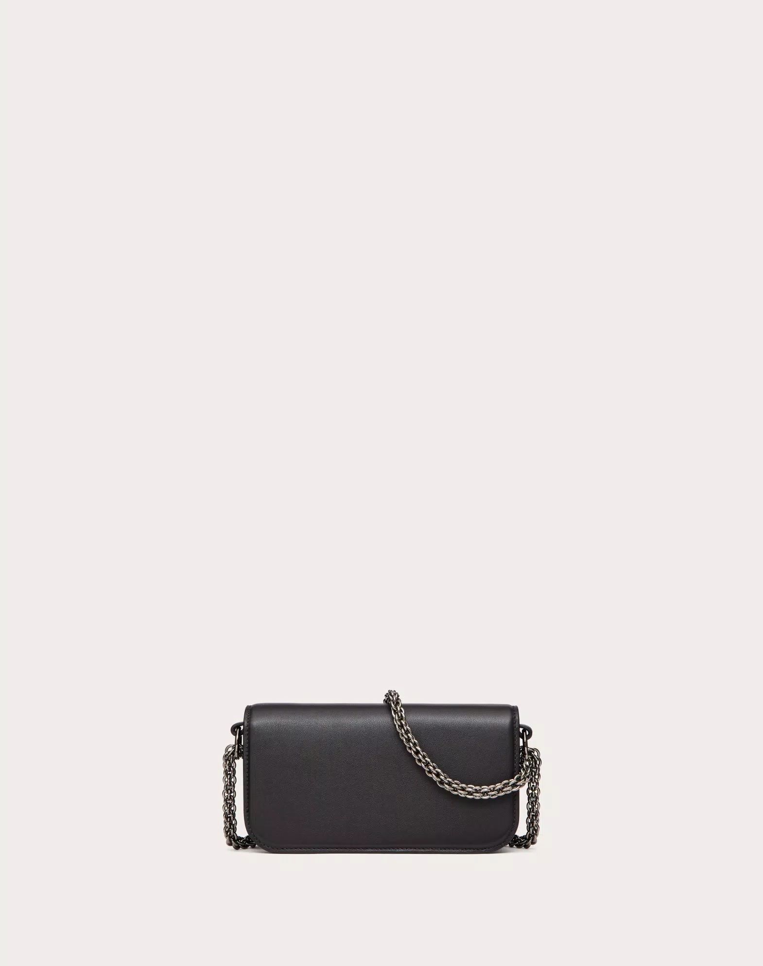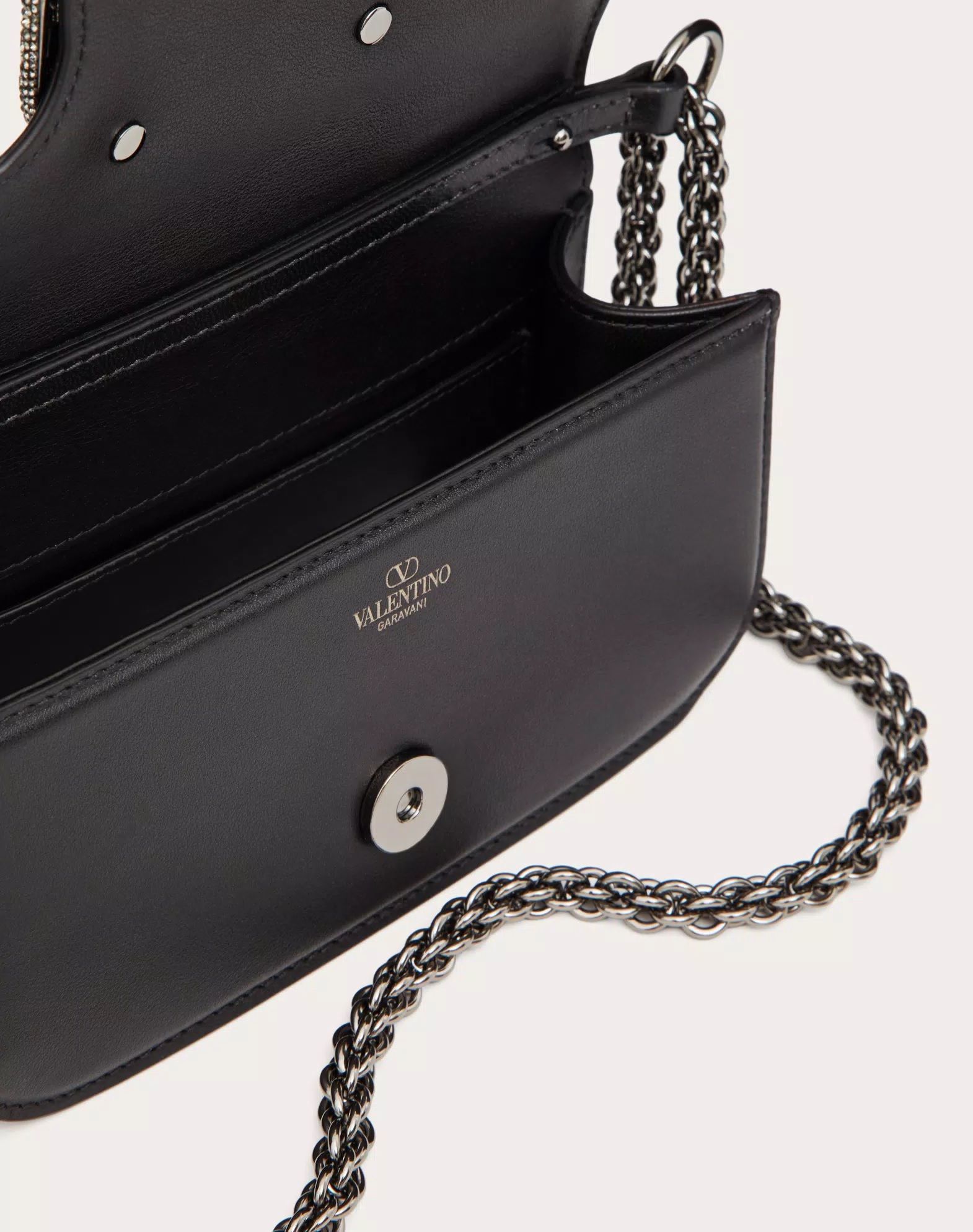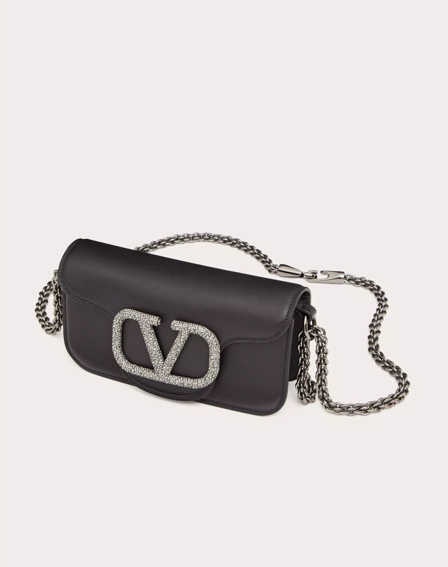Túi nữ da màu đen nắp túi gắn logo chữ V đính đá màu trắng, 1 quai xách 1 quai đeo, kích thước 19x10