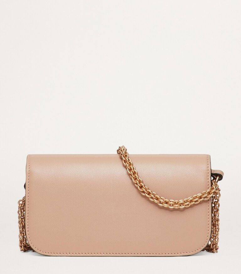 Túi nữ da màu hồng, nắp túi gắn logo chữ V đính đá cùng màu, 1 quai xách 1 quai đeo, kích thước 19x10