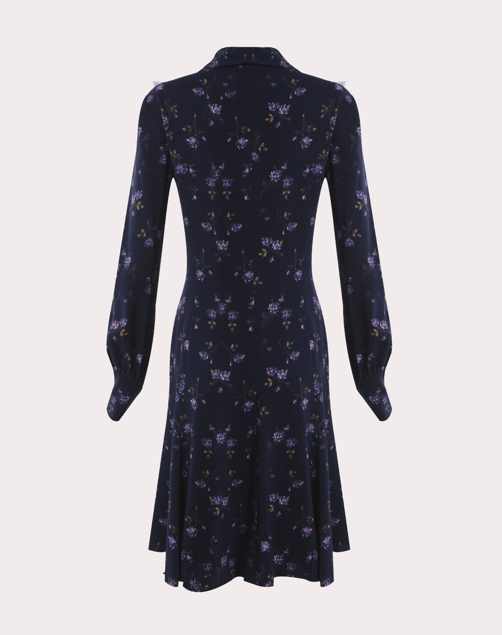 váy dài tay cổ kiểu vest cài khuy nền màu tím than in hoa màu hồng vùng ngực pha ren lưới