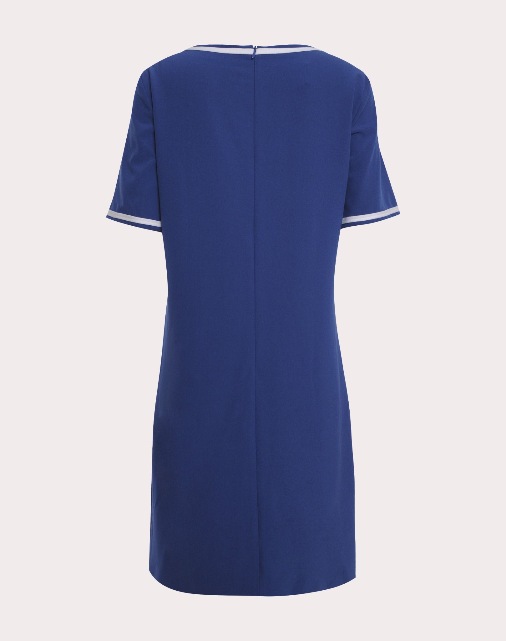 Váy liền cộc tay màu xnah tím than, viền cổ viền tay màu trắng, giữa ngực gắn sợi vải màu trắng, xếp thành chữ Holiday