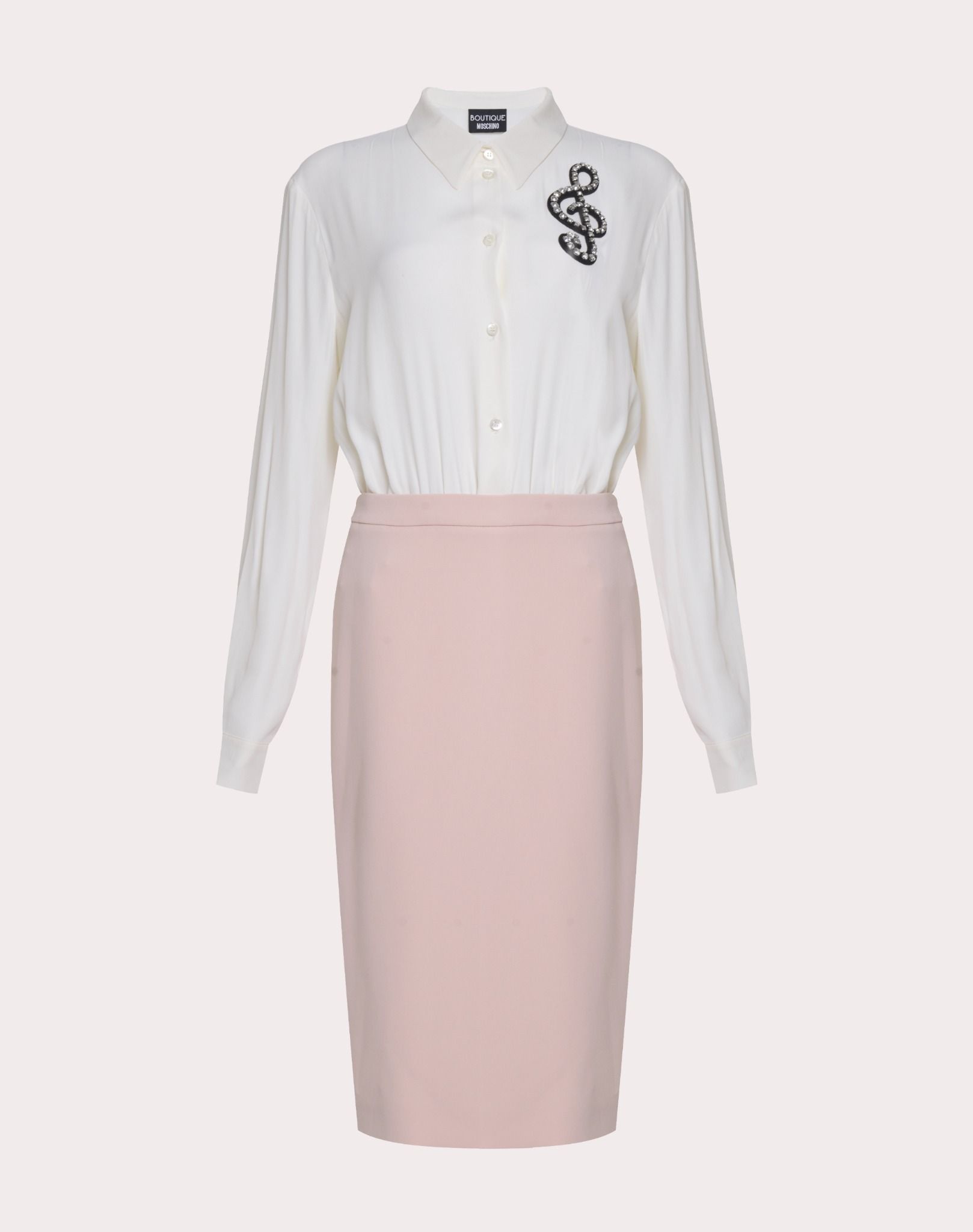 Váy liền dài tay cổ bẻ cài khuy thân trên bằng lụa màu trắng có gắn khóa son bằng cườm thân dưới chất vải dầy màu đen