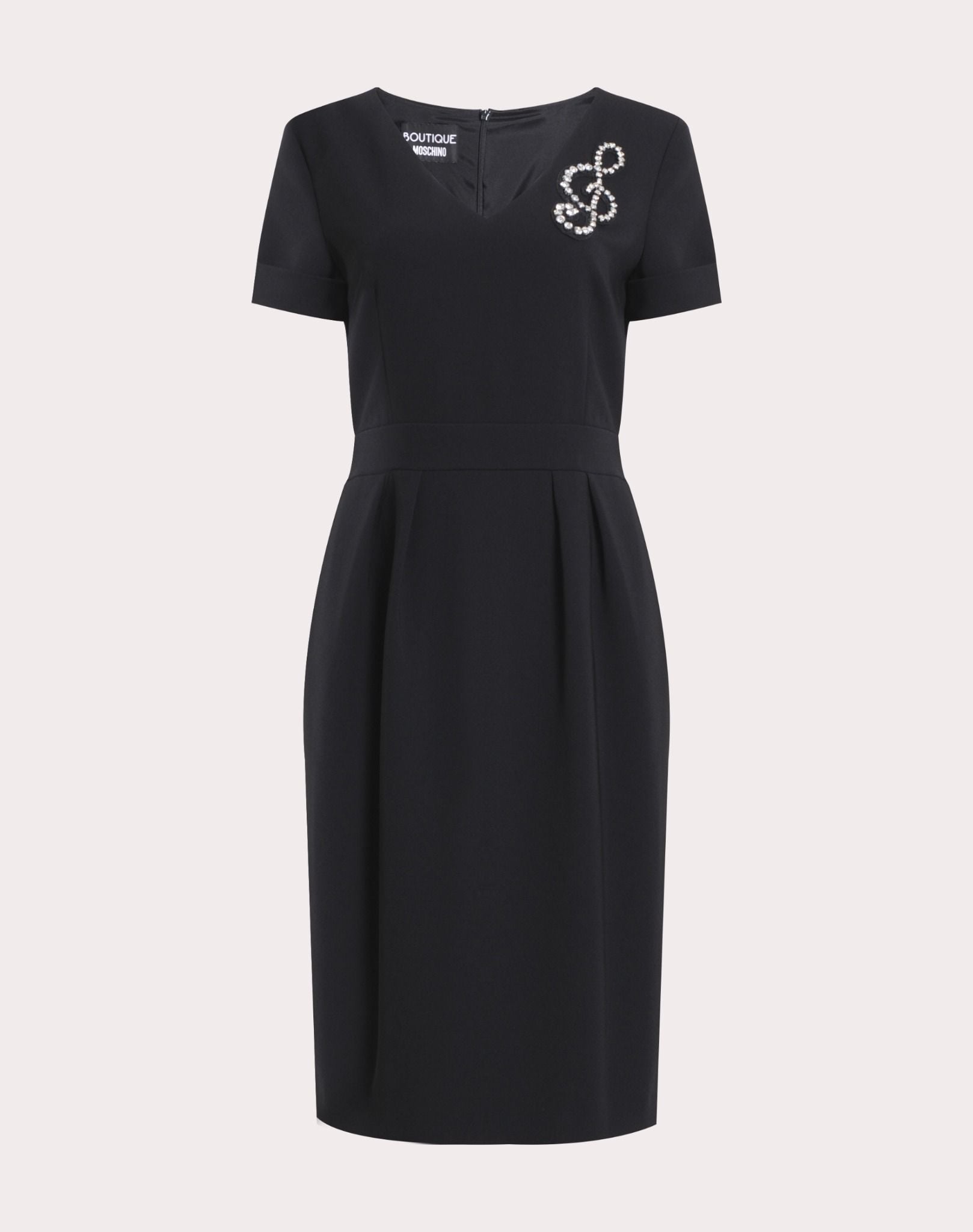 Váy liền cộc tay màu đen ngực đính đá tạo khóa nhạc, tay áo gấu lơ vê, thân dưới may ghép đai