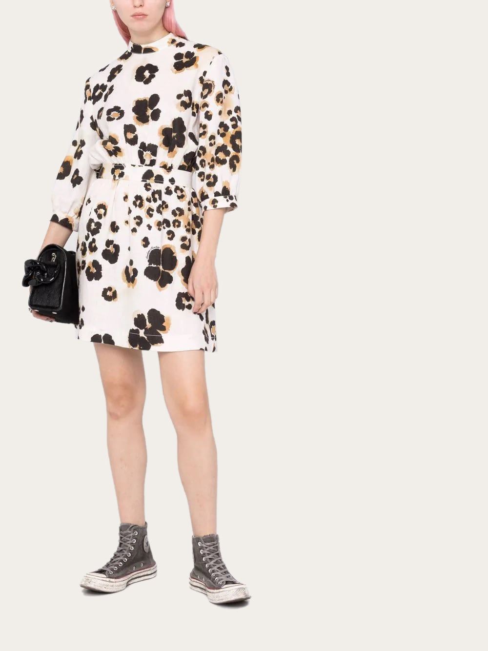 Váy liền tay lỡ cổ tàu kéo khóa sau chất vải thô nền màu be toàn thân họa tiết hoa màu nâu + đen