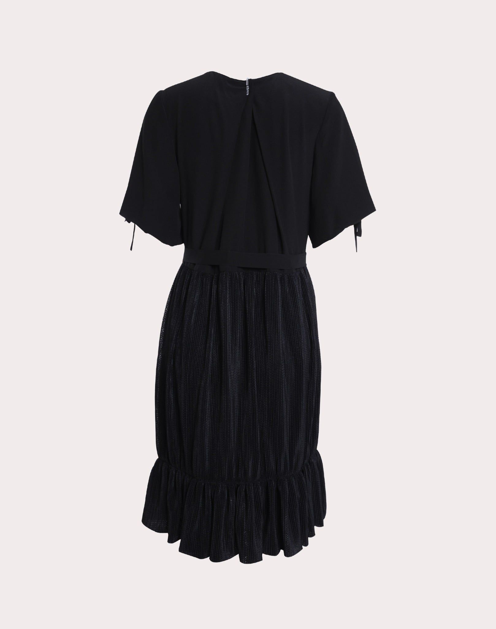 Váy liền cộc tay màu đen, thân dưới gấu vẩy cá, vải nổi gân có đai kèm theo