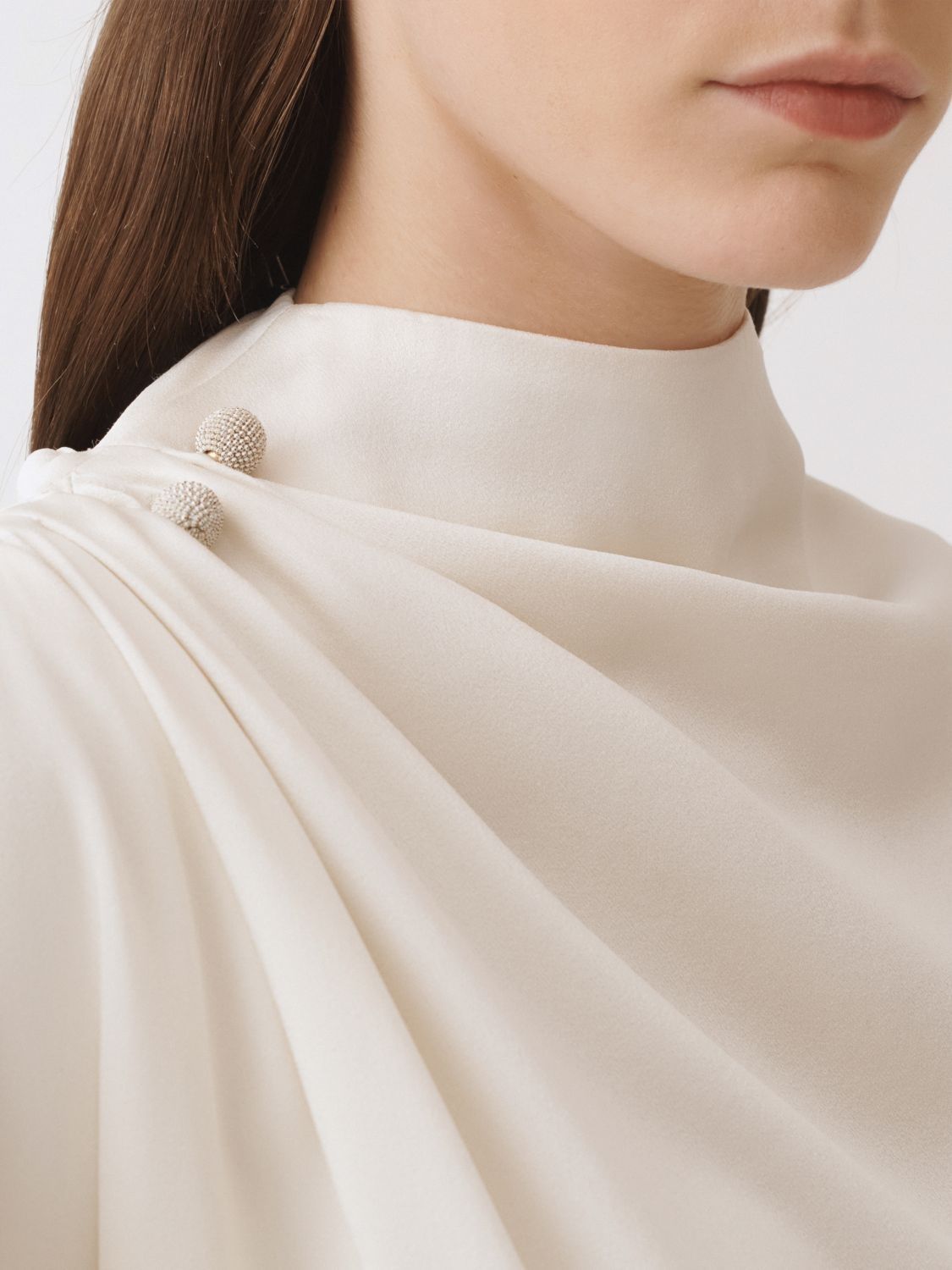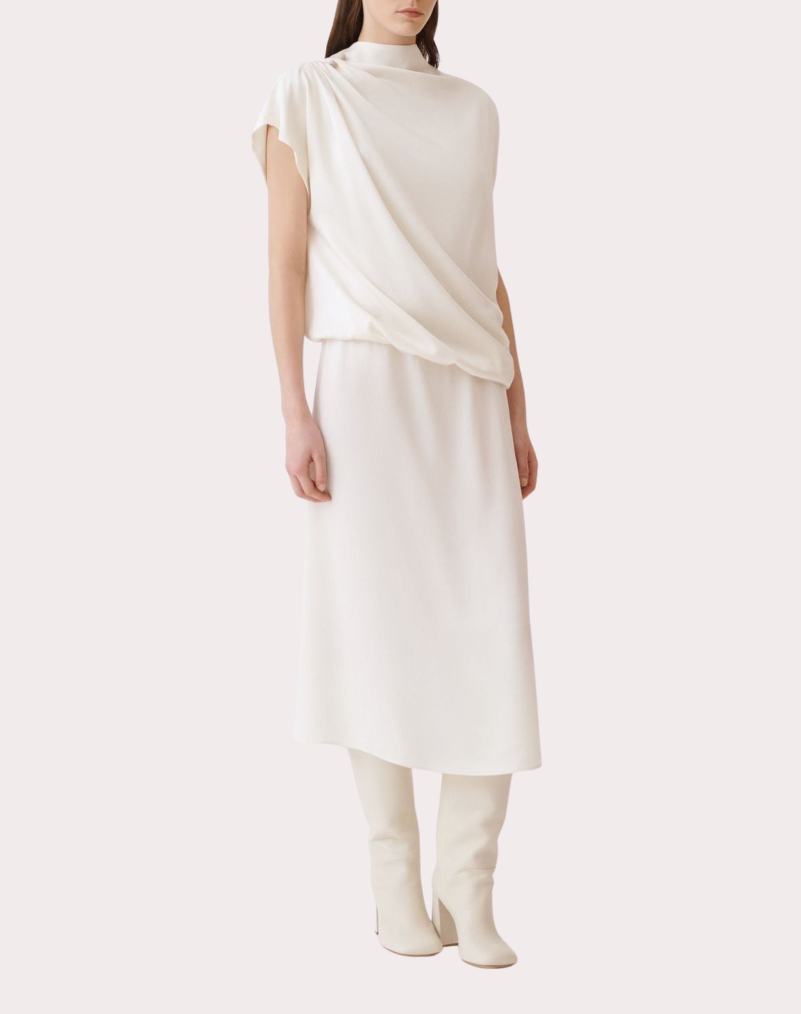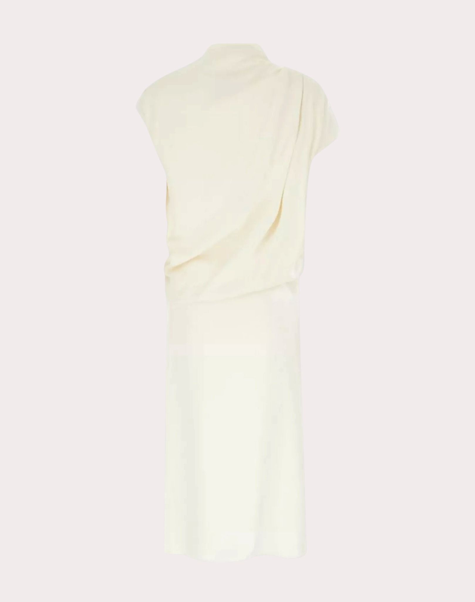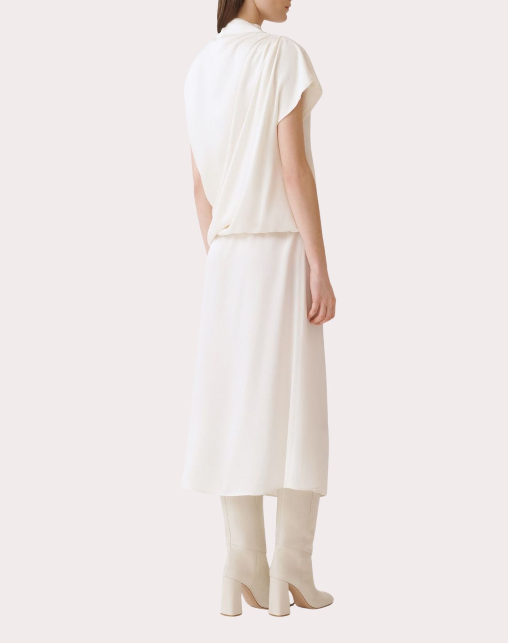 Váy liền màu be tay cánh dơi, cổ đổ, kéo khóa vai trái, vai phải cài rúm bằng khóa kim loại