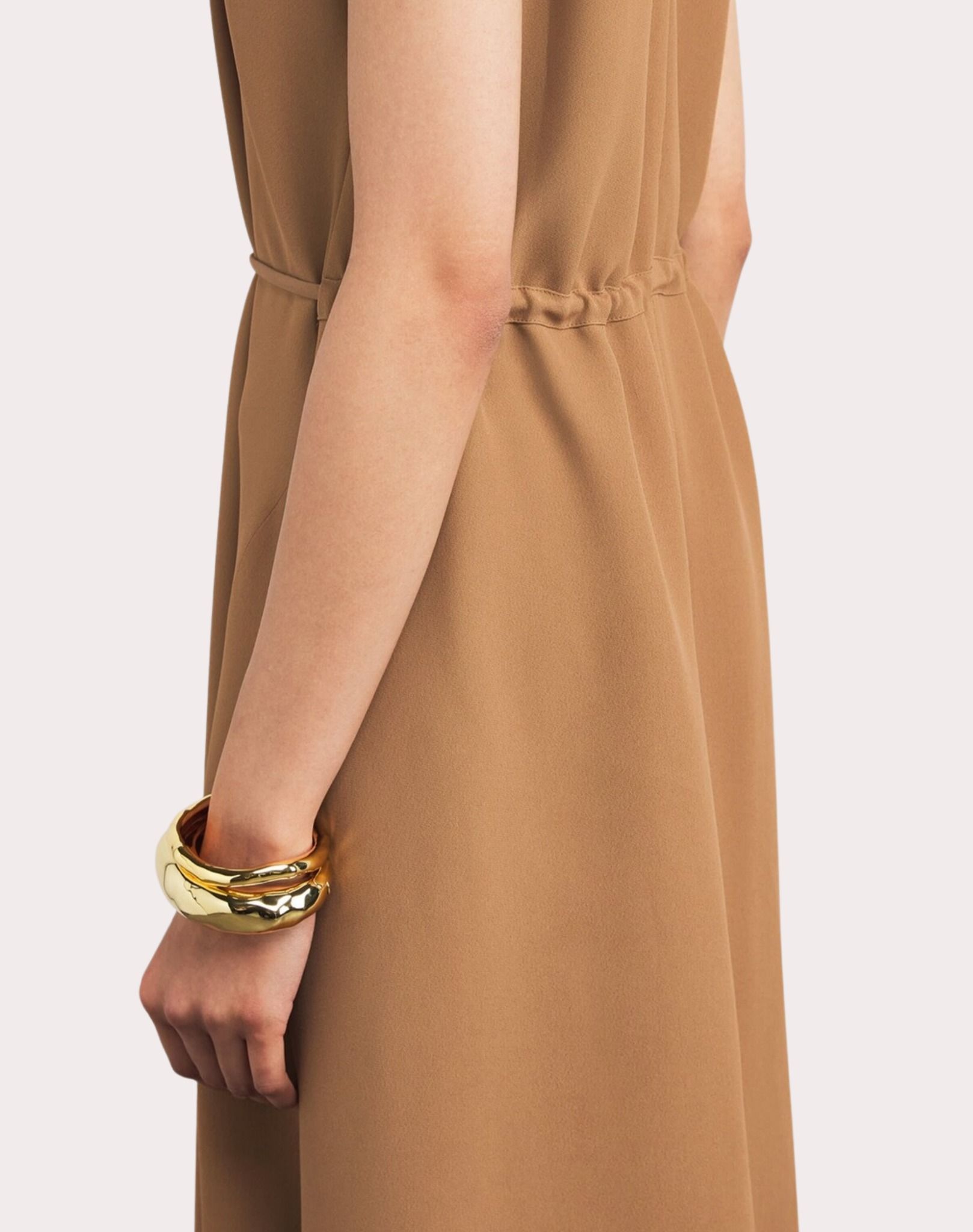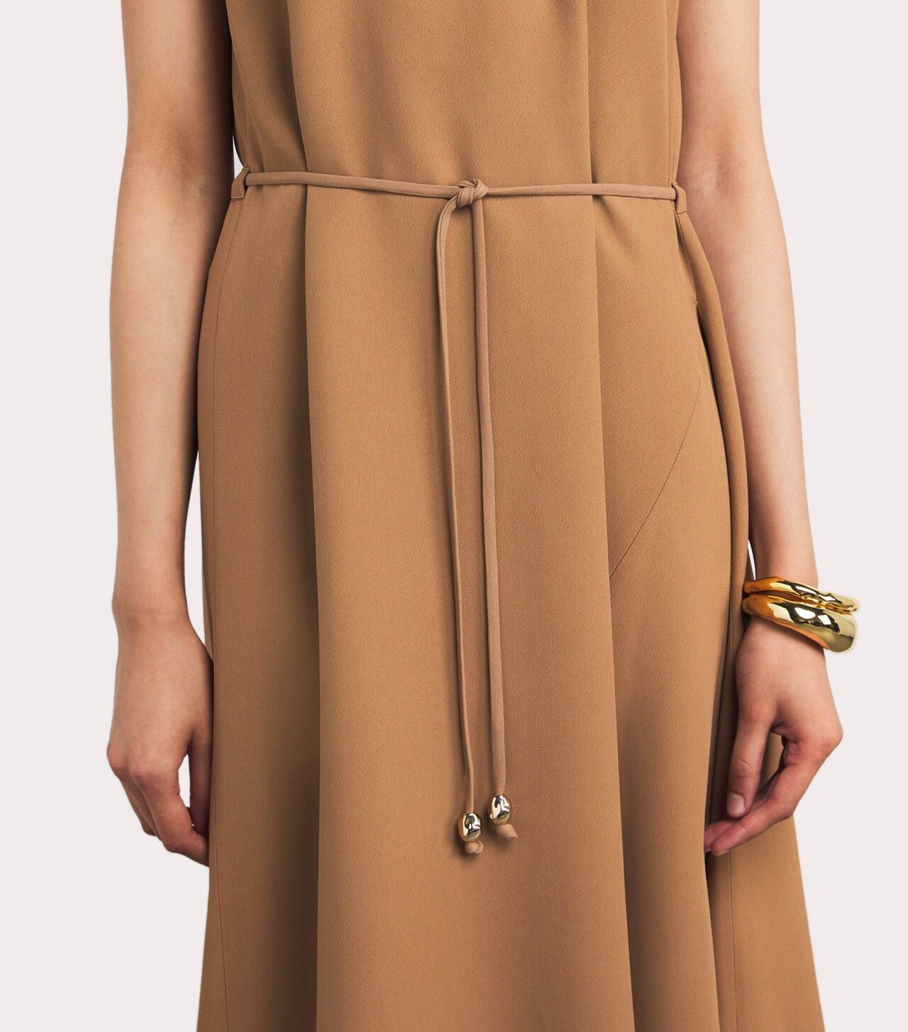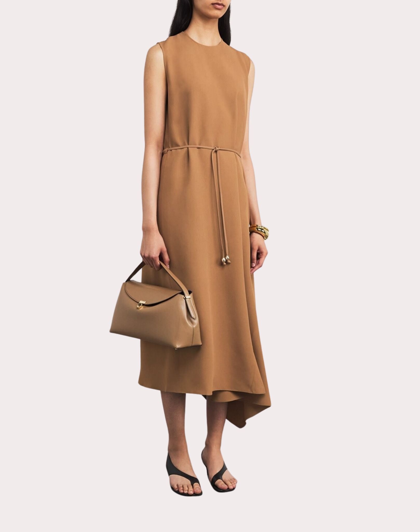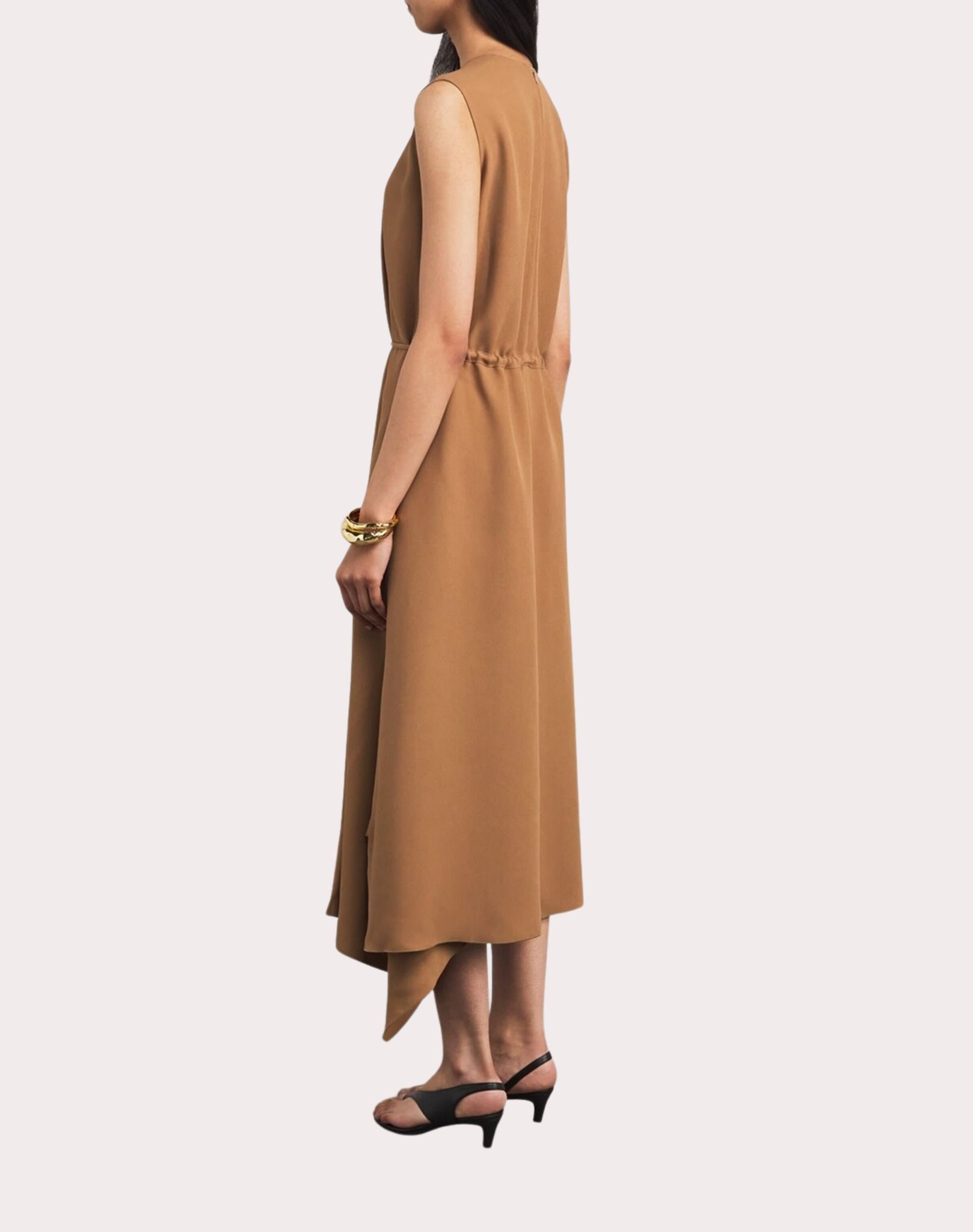 Váy liền dáng dài màu nâu, cổ tròn sát nách