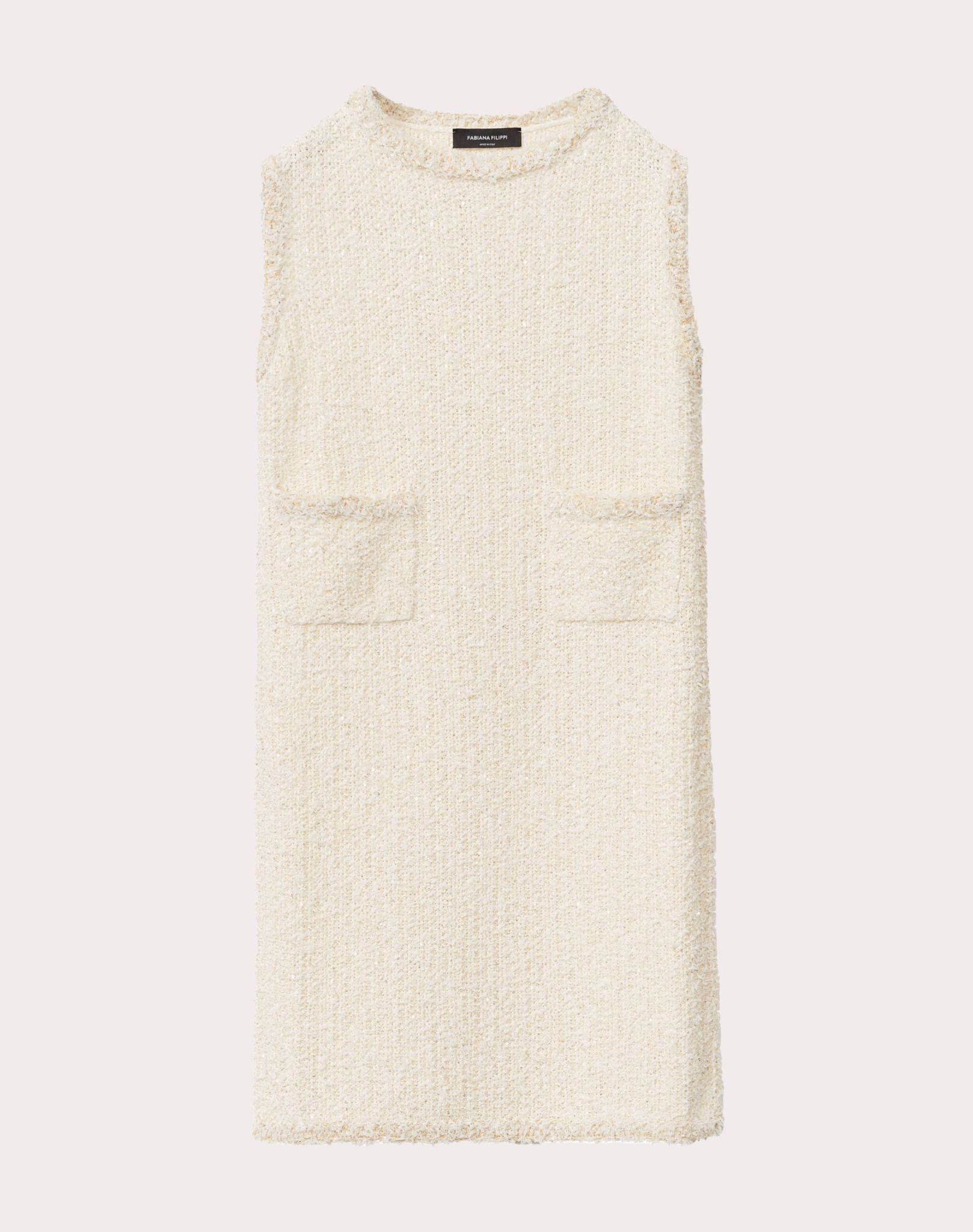 Váy liền nữ chất sợi sát nách cổ tròn màu trắng pha kim tuyến vàng,toàn thân đính cườm trắng,trước có hai túi bụng