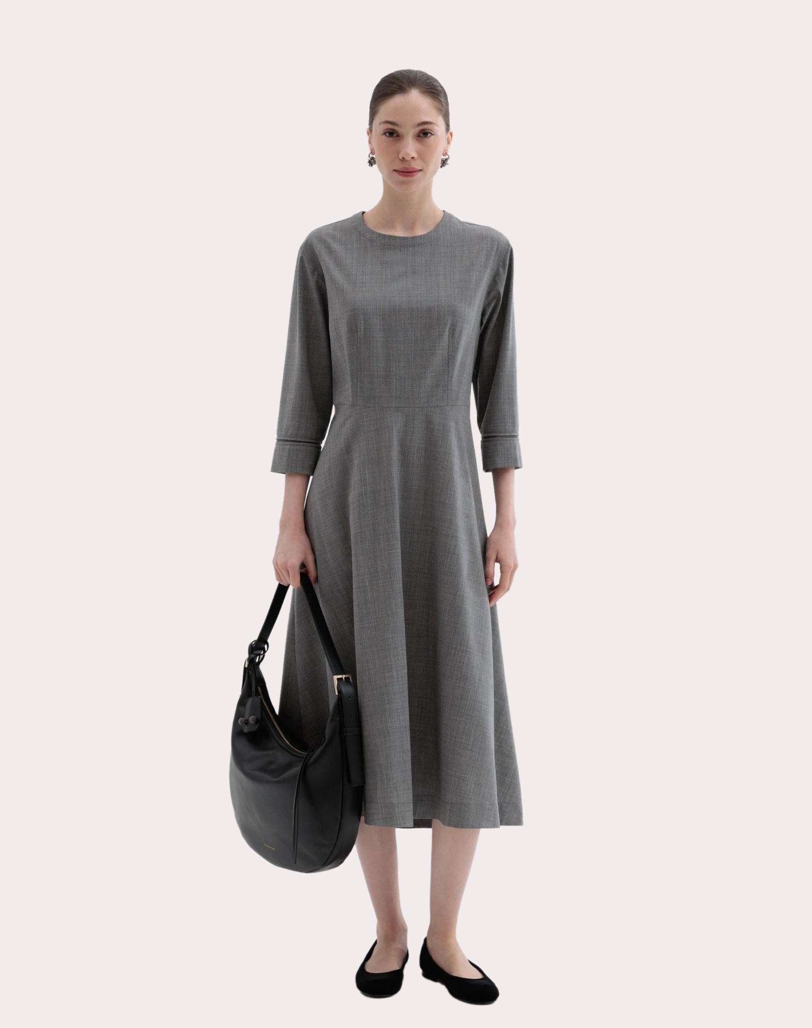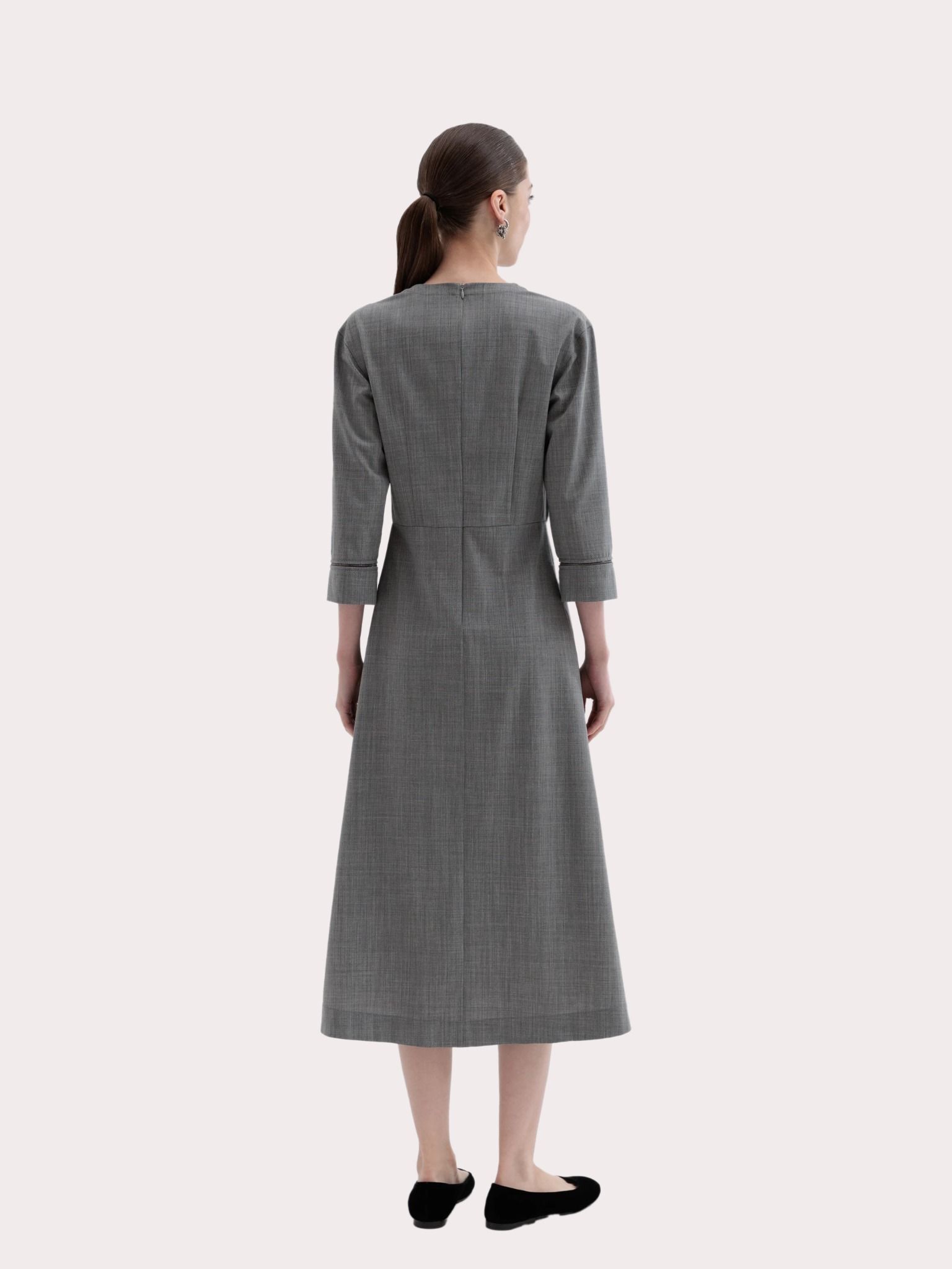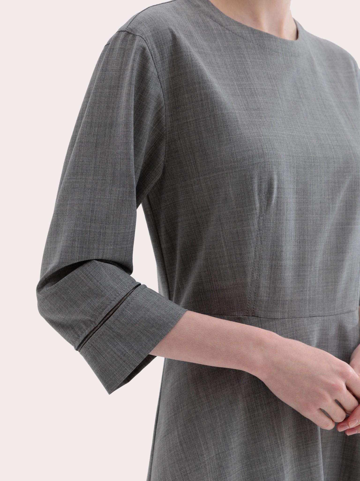 Váy liền dày tay màu ghi cổ tròn kéo khóa sau, cổ tay may ghép ren pha cườm cùng màu