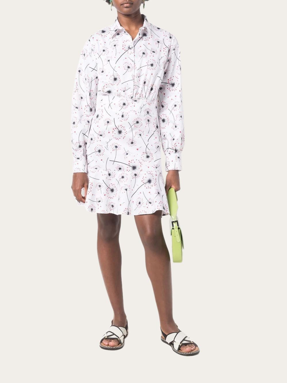 Váy liền dài tay cổ bẻ cài khuy thân trên, 2 tầng, nề màu trắng toàn thân họa tiết hoa và chữ Love Moschino màu đen đỏ