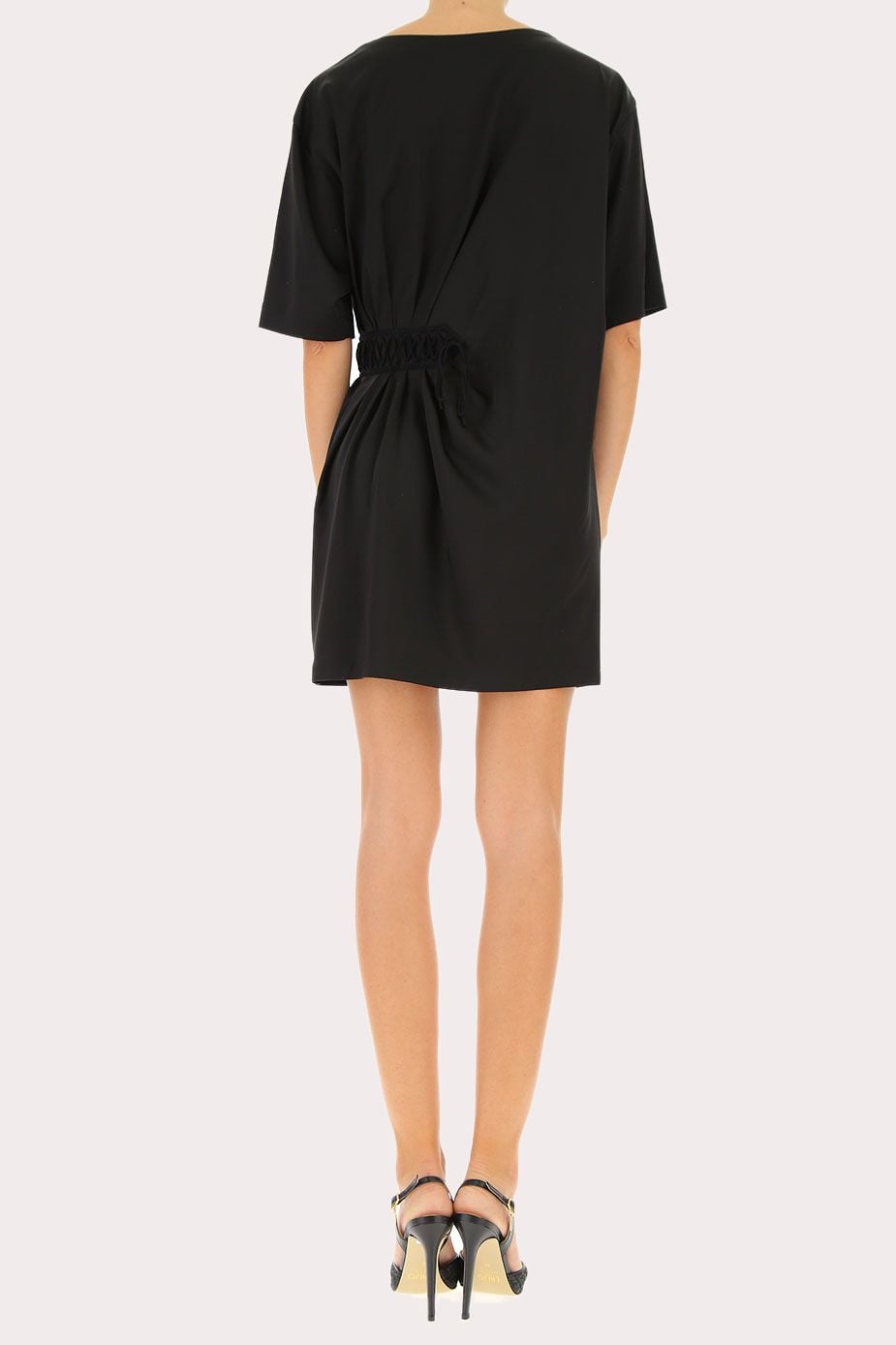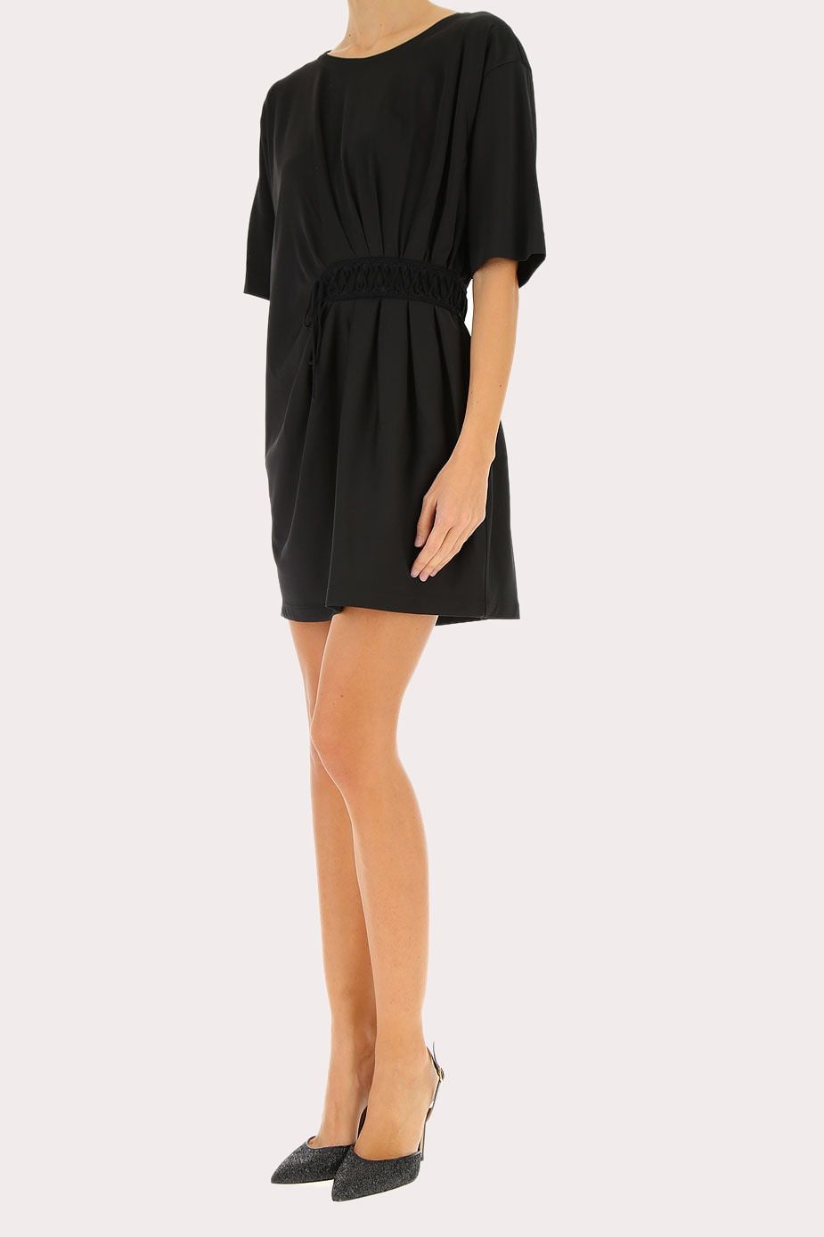 váy liền cộc tay màu đen eo dúm, gắn sợi đan chéo