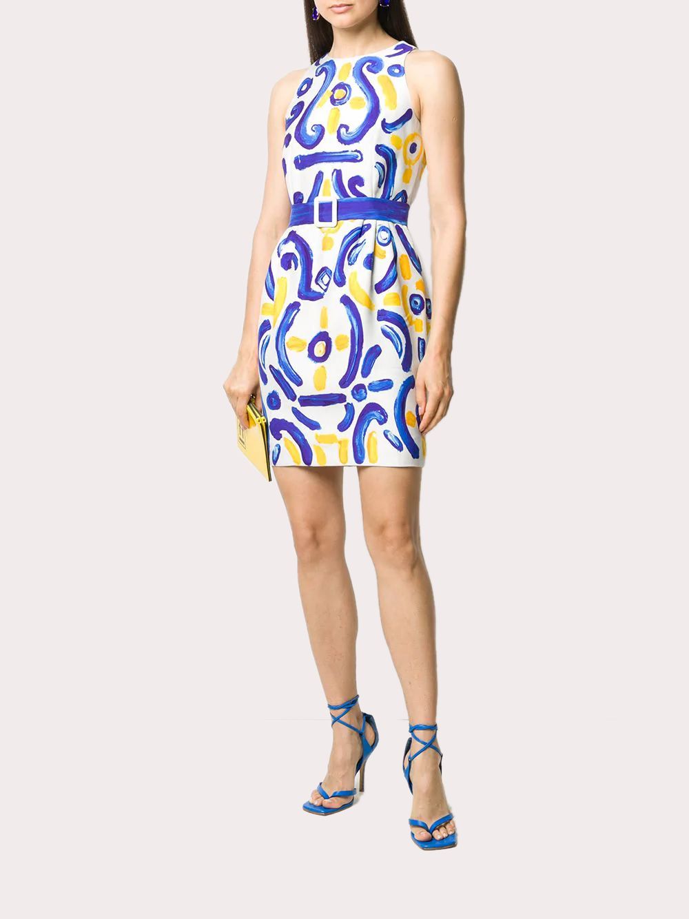 Váy liền sát nách dáng chữ A nền màu trắng toàn thân họa tiết sơn mài vàng xanh eo có đai