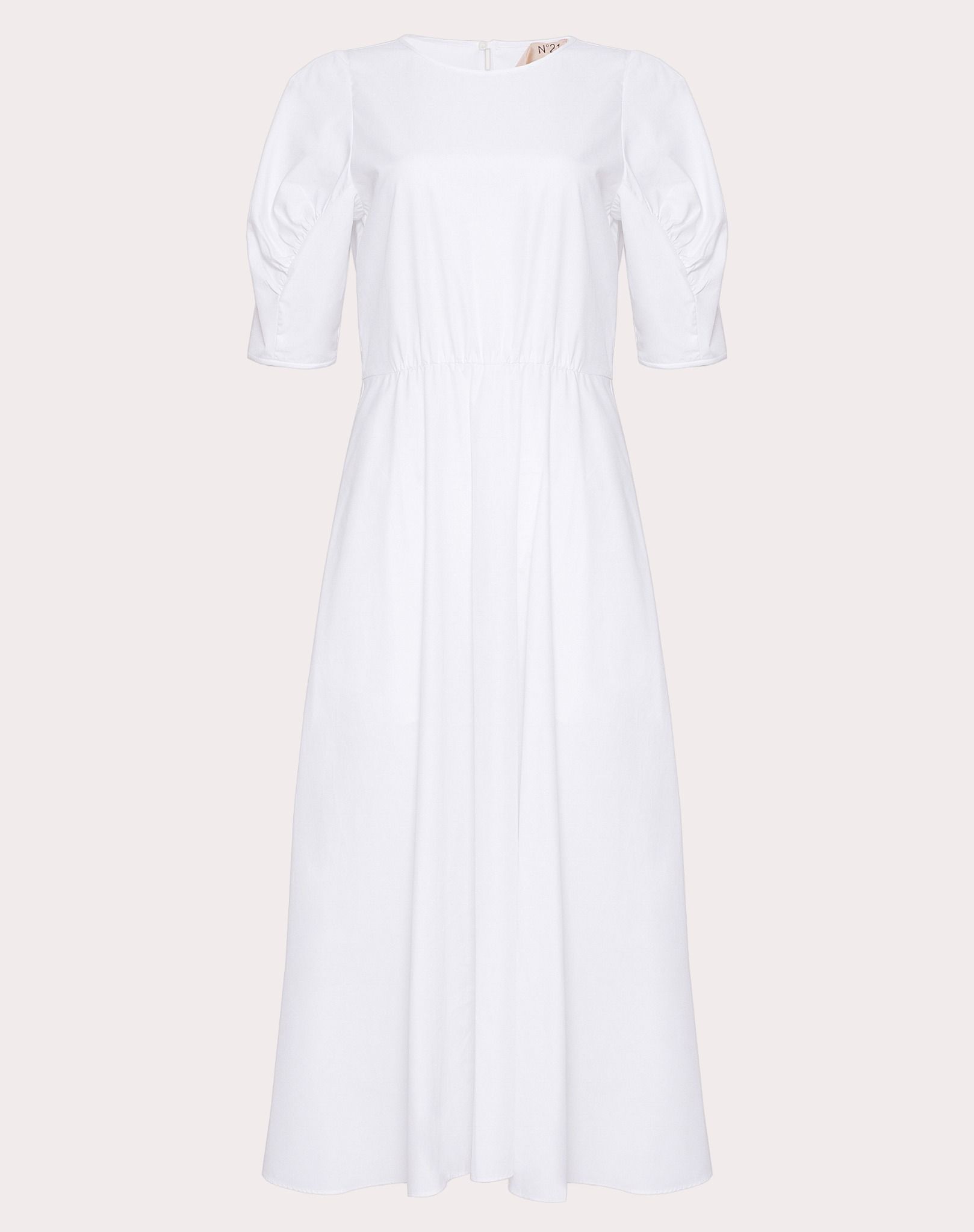 Váy liền cộc tay màu trắng cổ tròn, sau xẻ giọt lệ cài khuy, kéo khóa cạnh