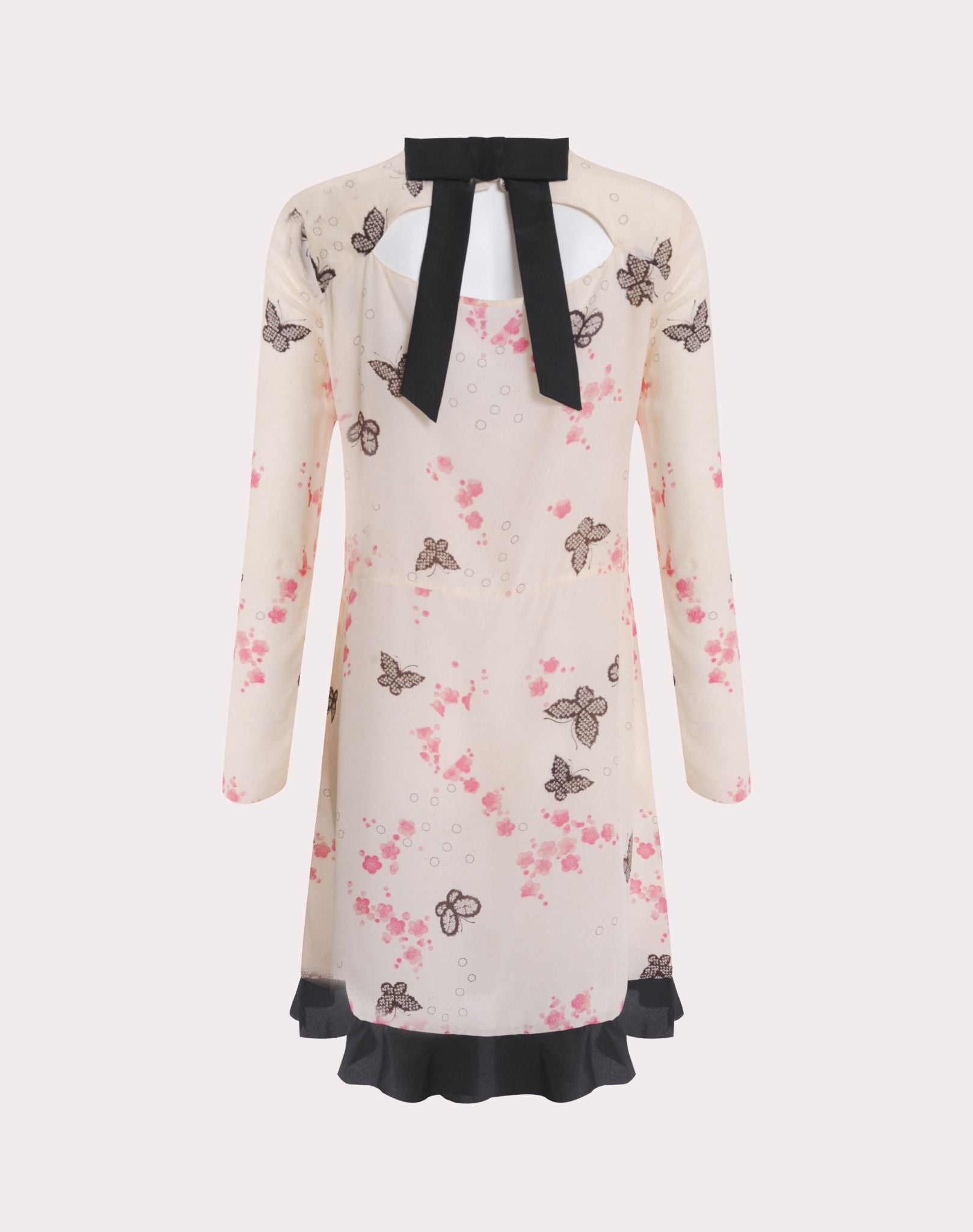 Váy lụa màu hồng nhạt hoa lá màu hồng và con bướm màu đen sau gáy gắn nơ đen