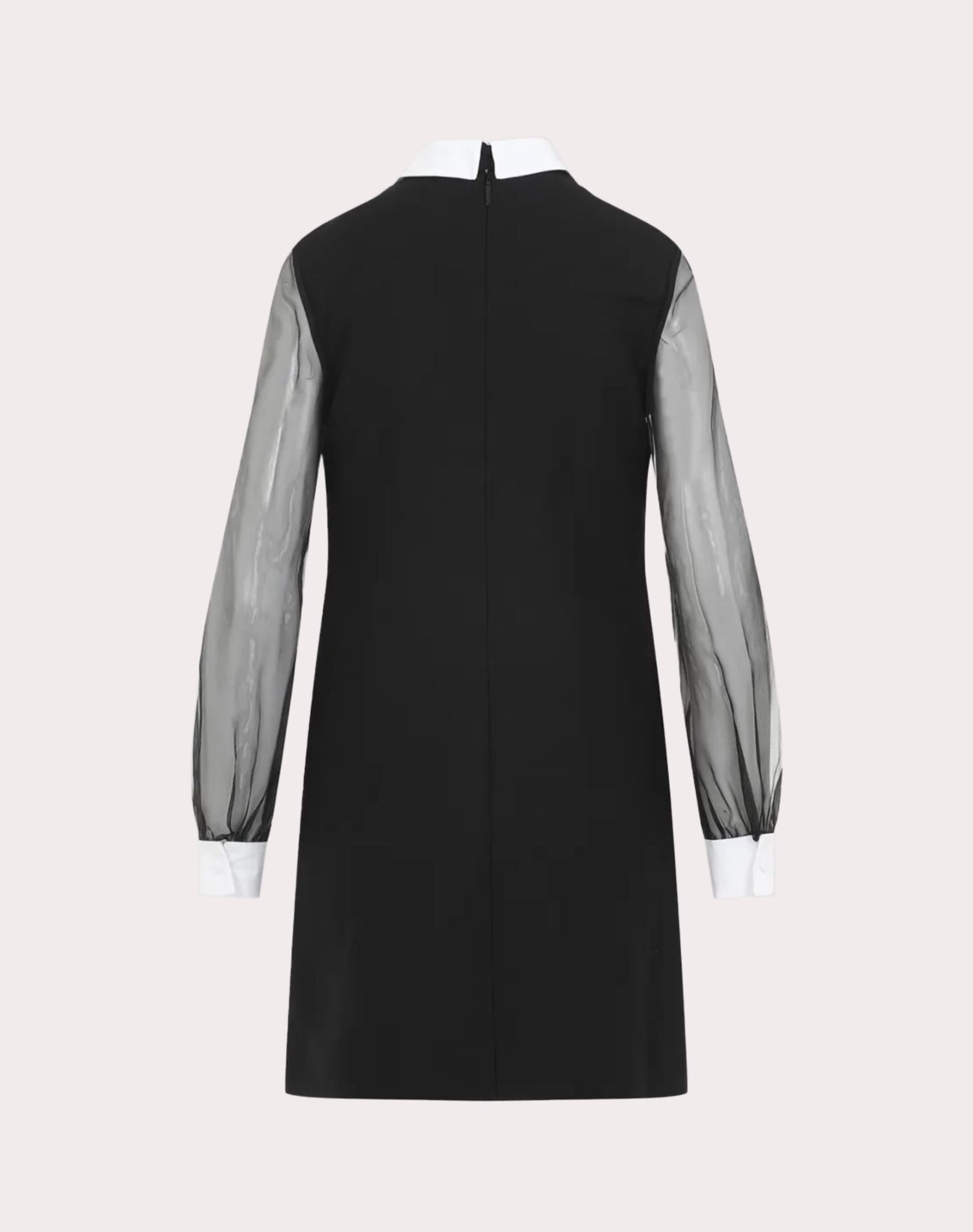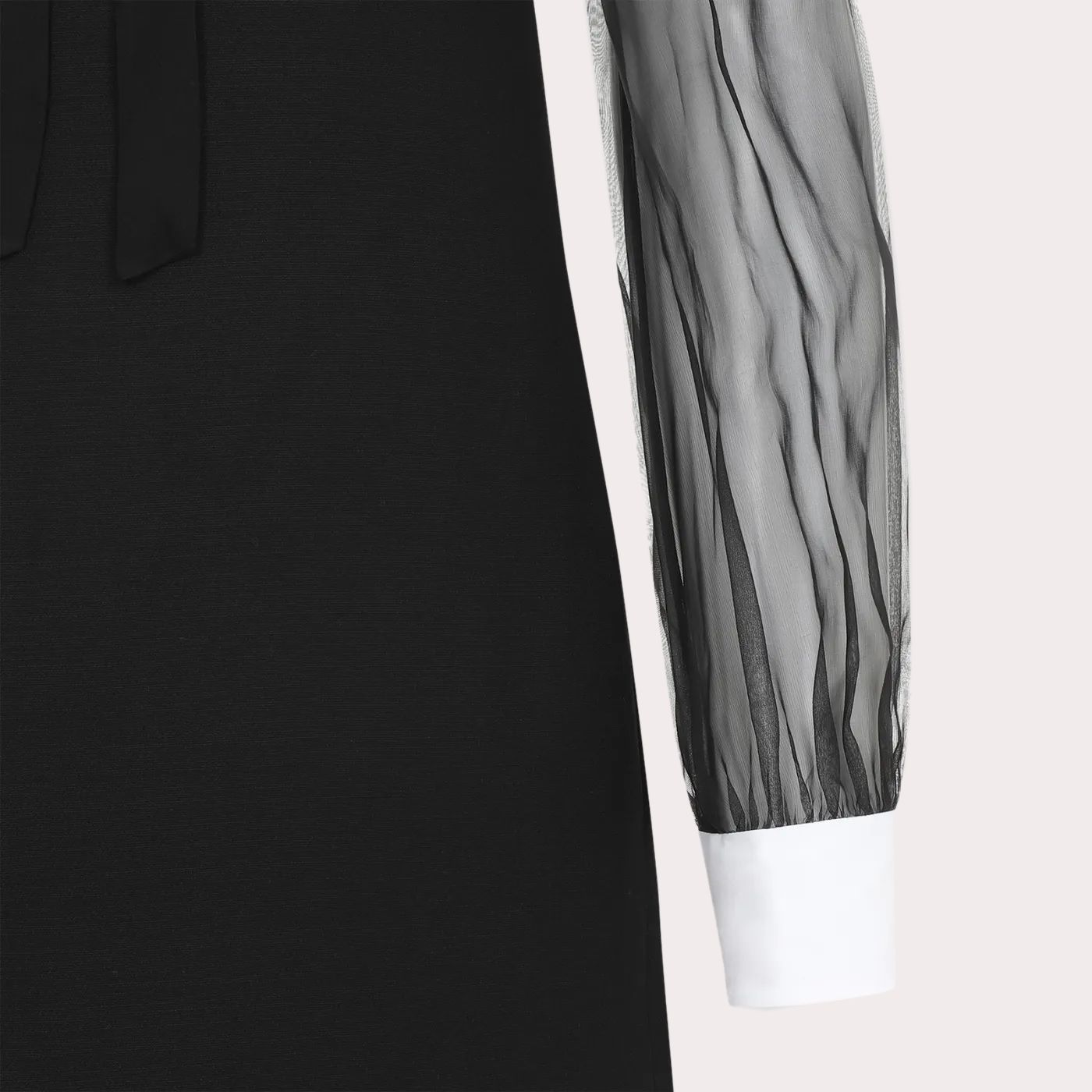 Váy liên dài tay cổ bẻ màu đen, tay pha vải voan đen, cổ và cổ tay pha vải trắng, ngực pha bèo đen, cổ có đai buộc nơ