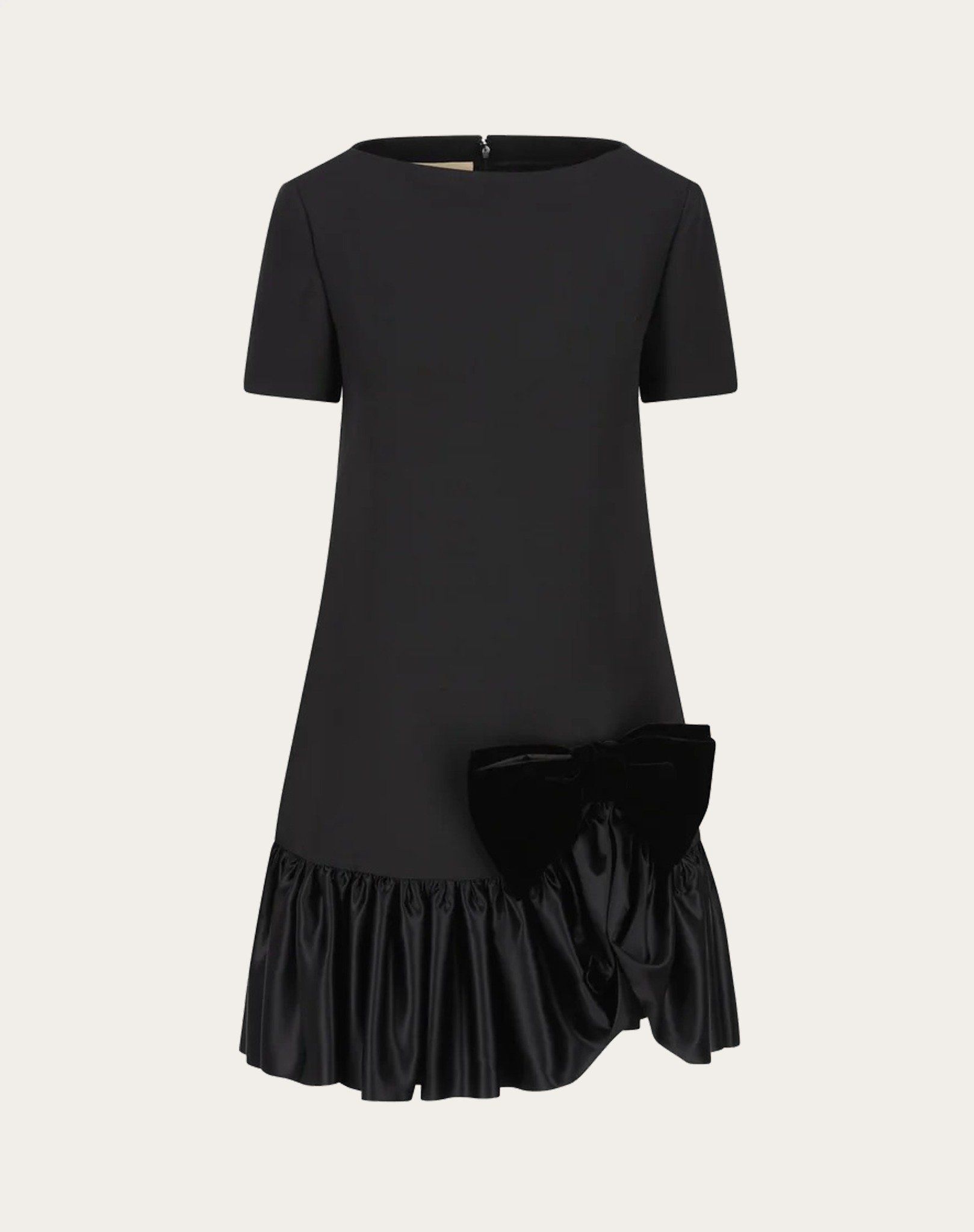Váy liền cộc tay màu đen kéo khóa sau màu đen, thân dưới pha vải đen xếp ly và gắn 1 nơ to nhung đen