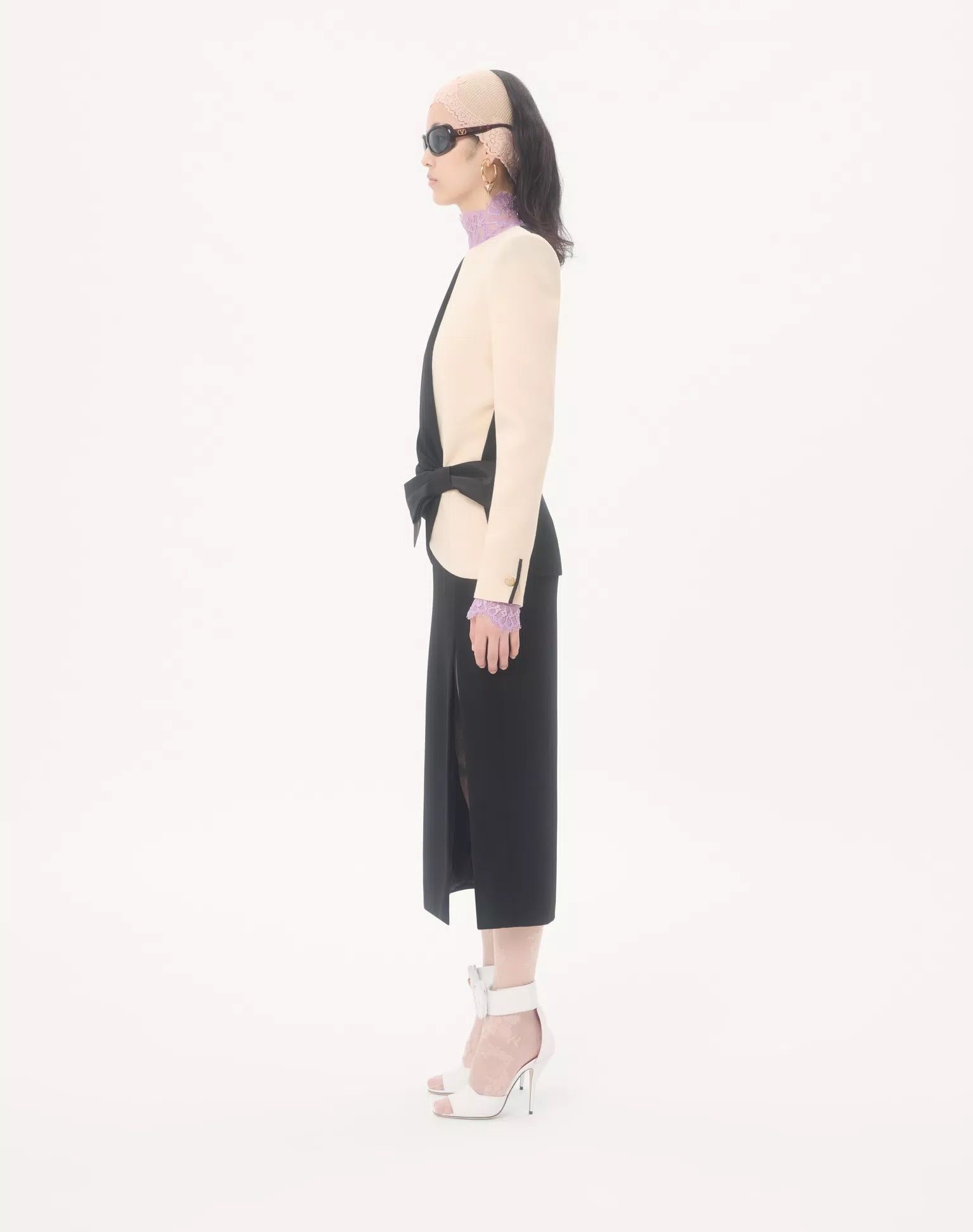 Váy liền dài tay cổ tròn kéo khóa sau màu đen vạt chép gắn nơ to màu đen, thân trên bên trái pha vải màu be