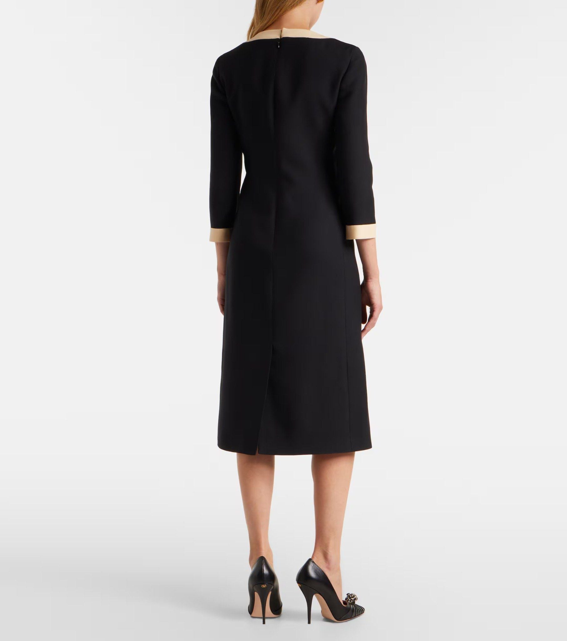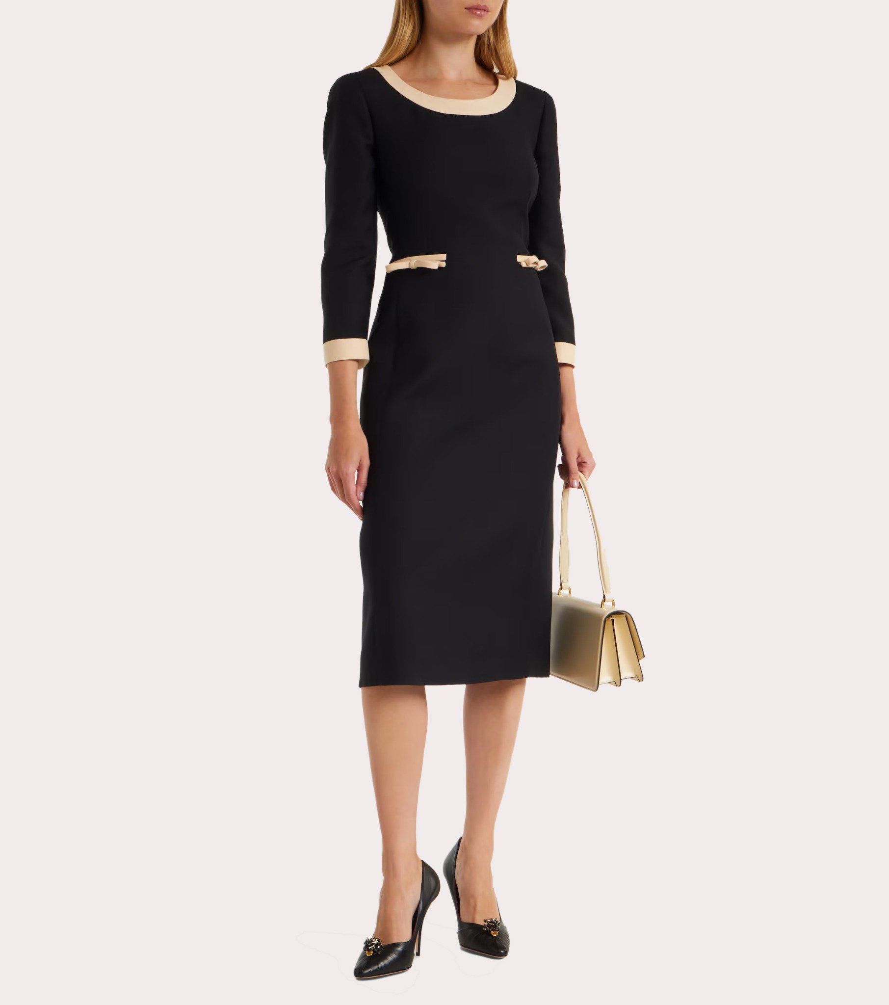 Váy liền dài tay màu đen cổ rộng kéo khóa sau, trước có 2 túi bổ, miệng túi + cổ tay + cổ pha vải màu be, miệng túi gắn nơ nhỏ màu be