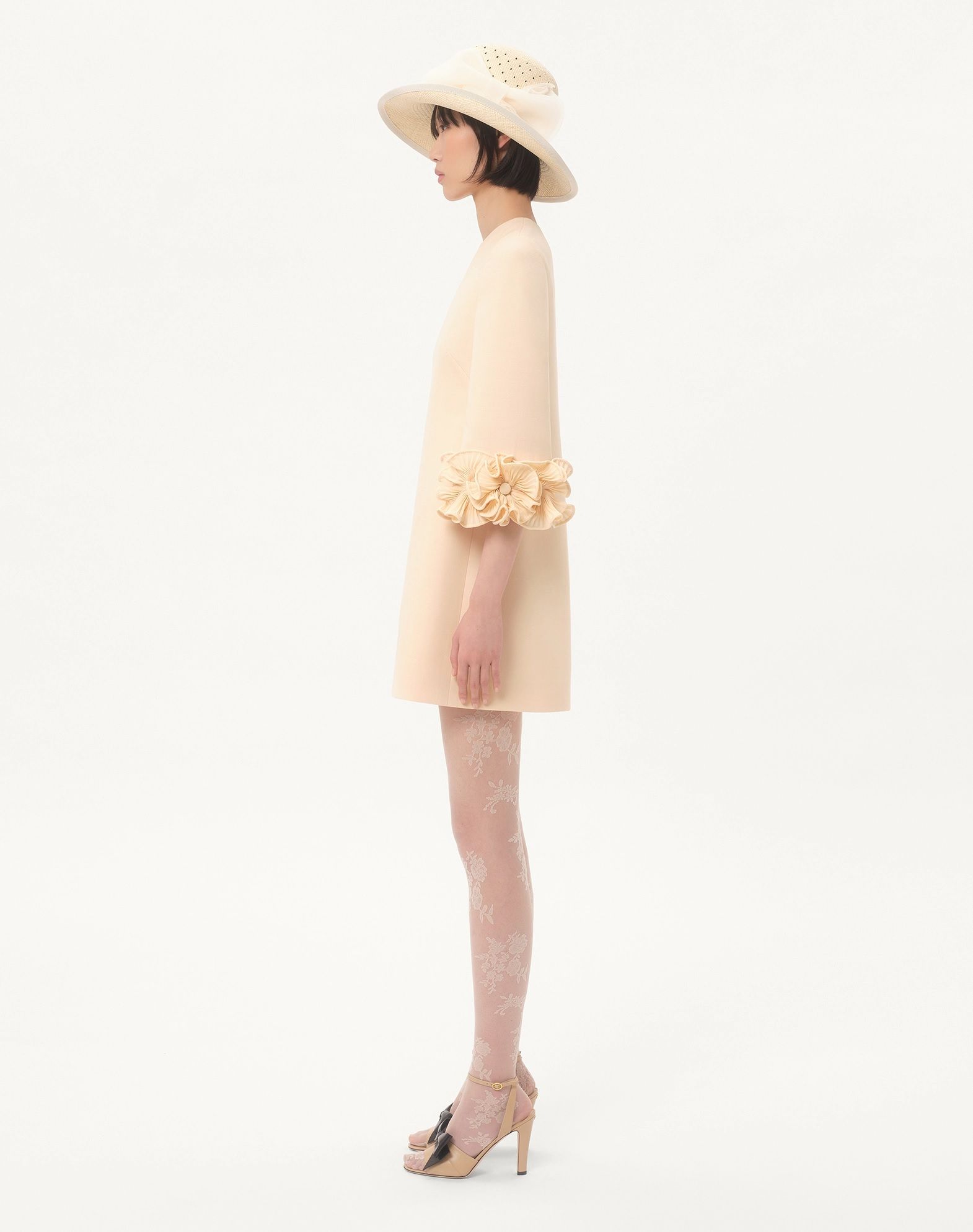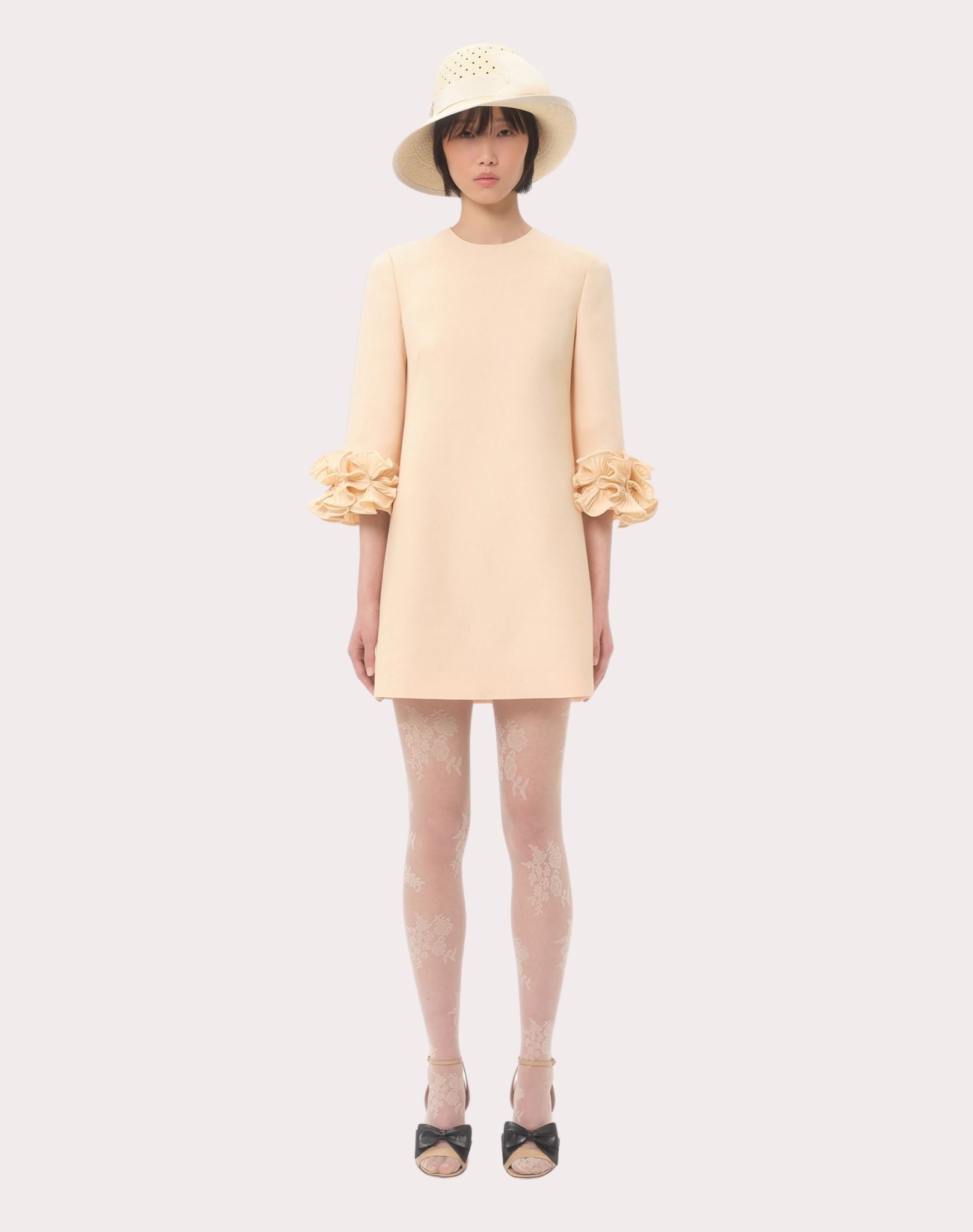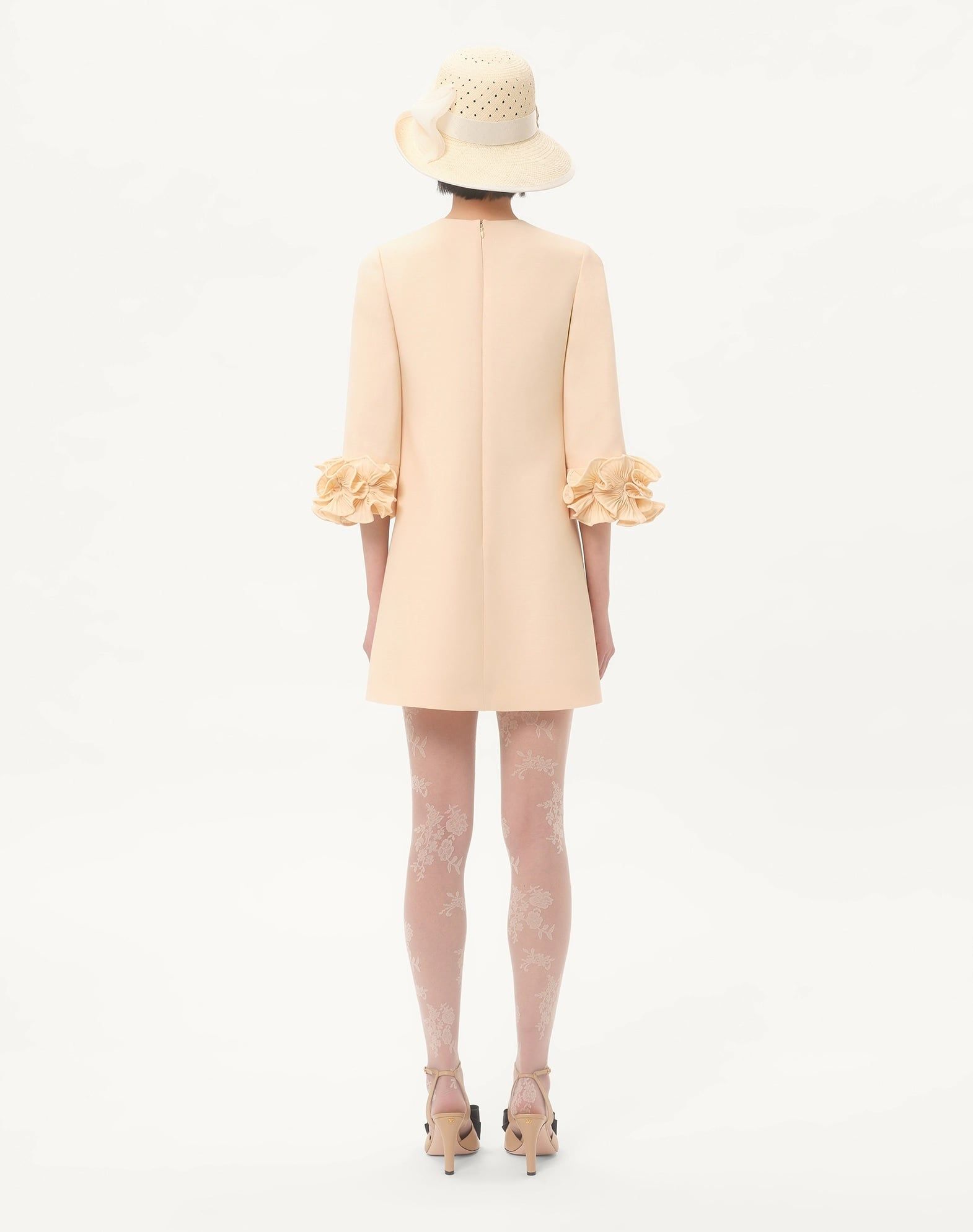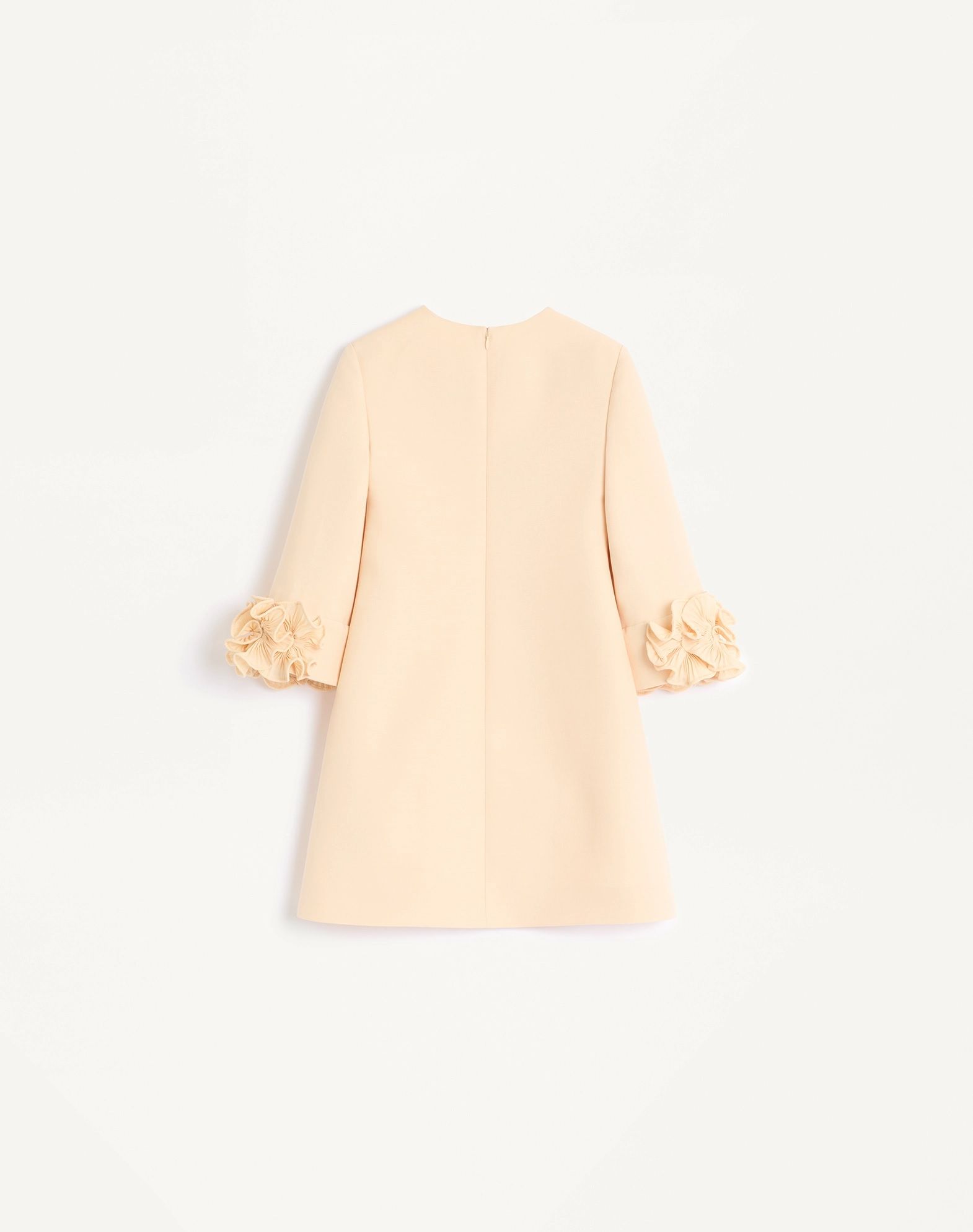 Váy liền dài tay cổ tròn màu be, dáng ngắn kéo khóa sau, cổ tay đính hoa