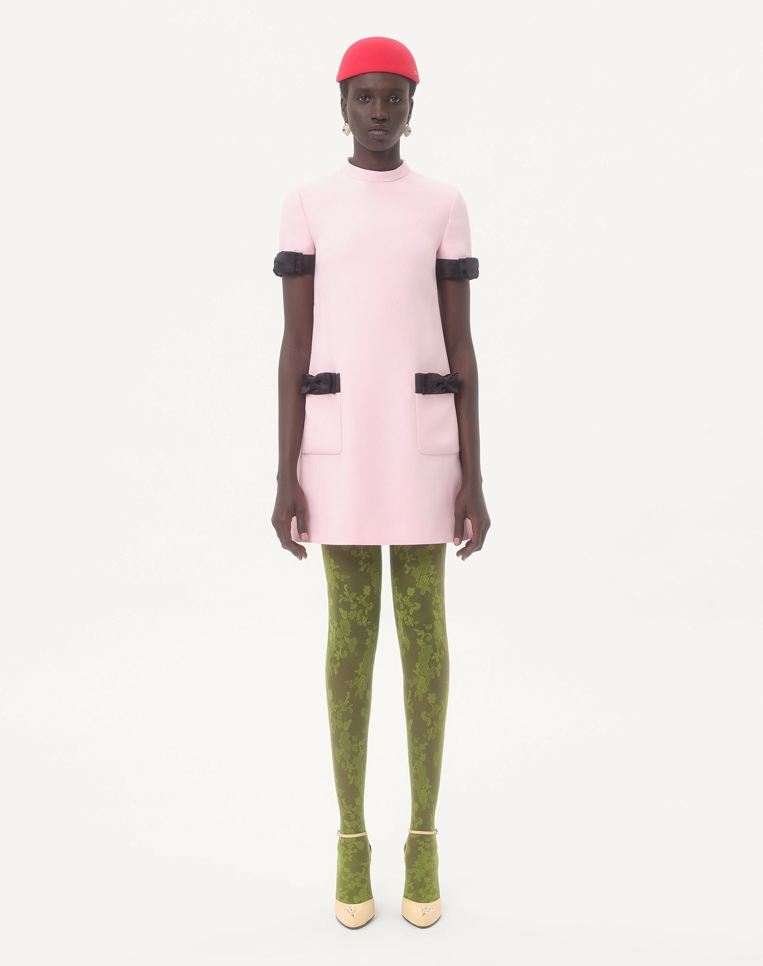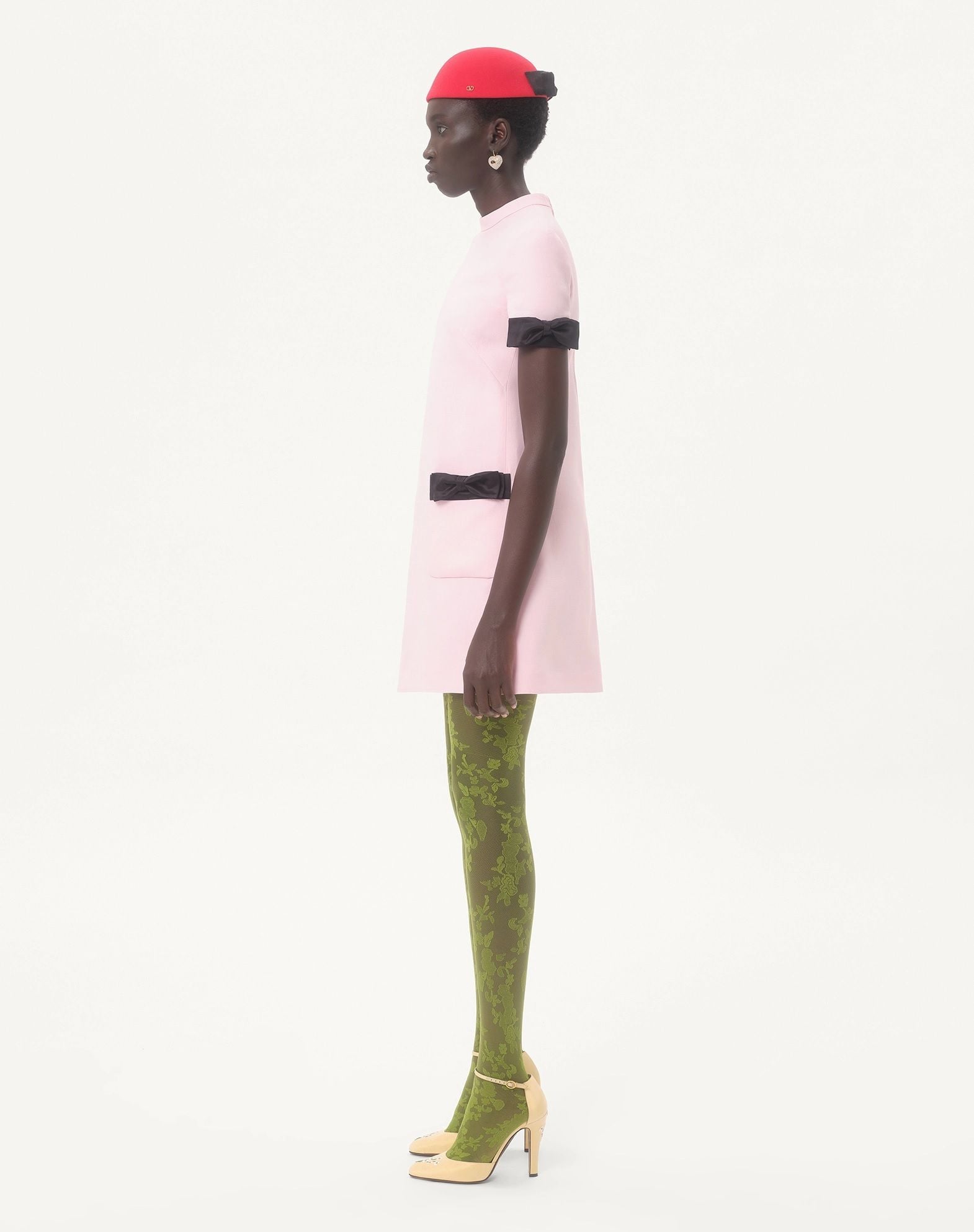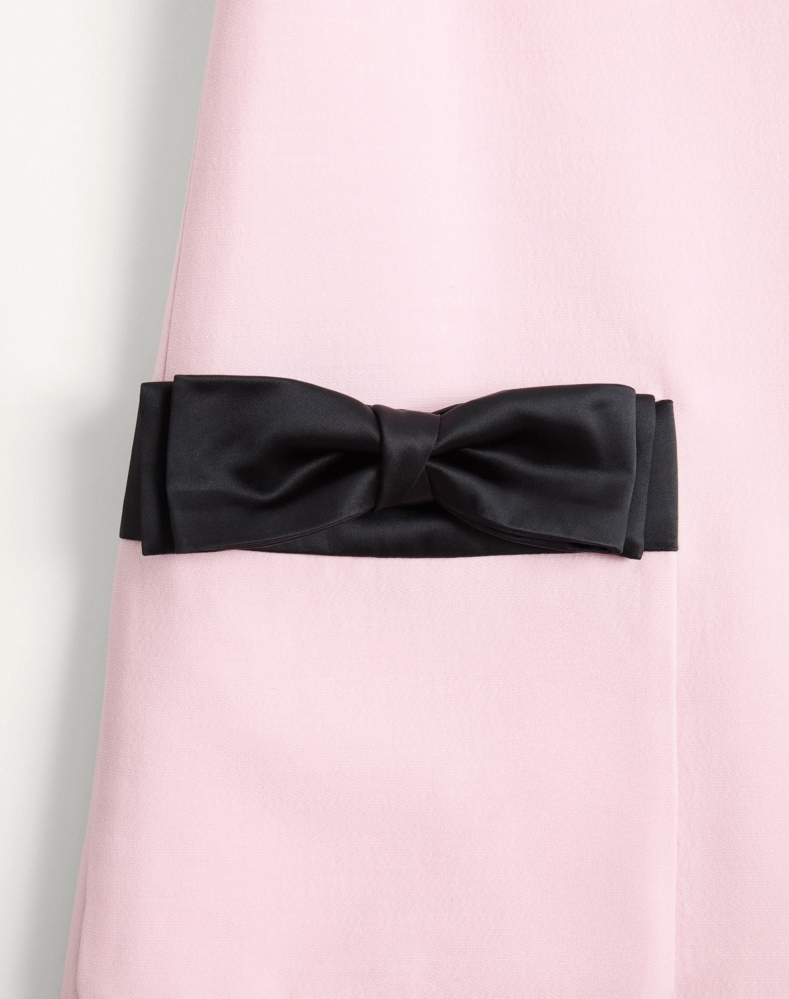 Váy liền cộc tay cổ tròn màu hồng , keo khóa sau, trước có 2 túi, miệng túi và cổ tay đính nơ bằng vải bóng màu đen