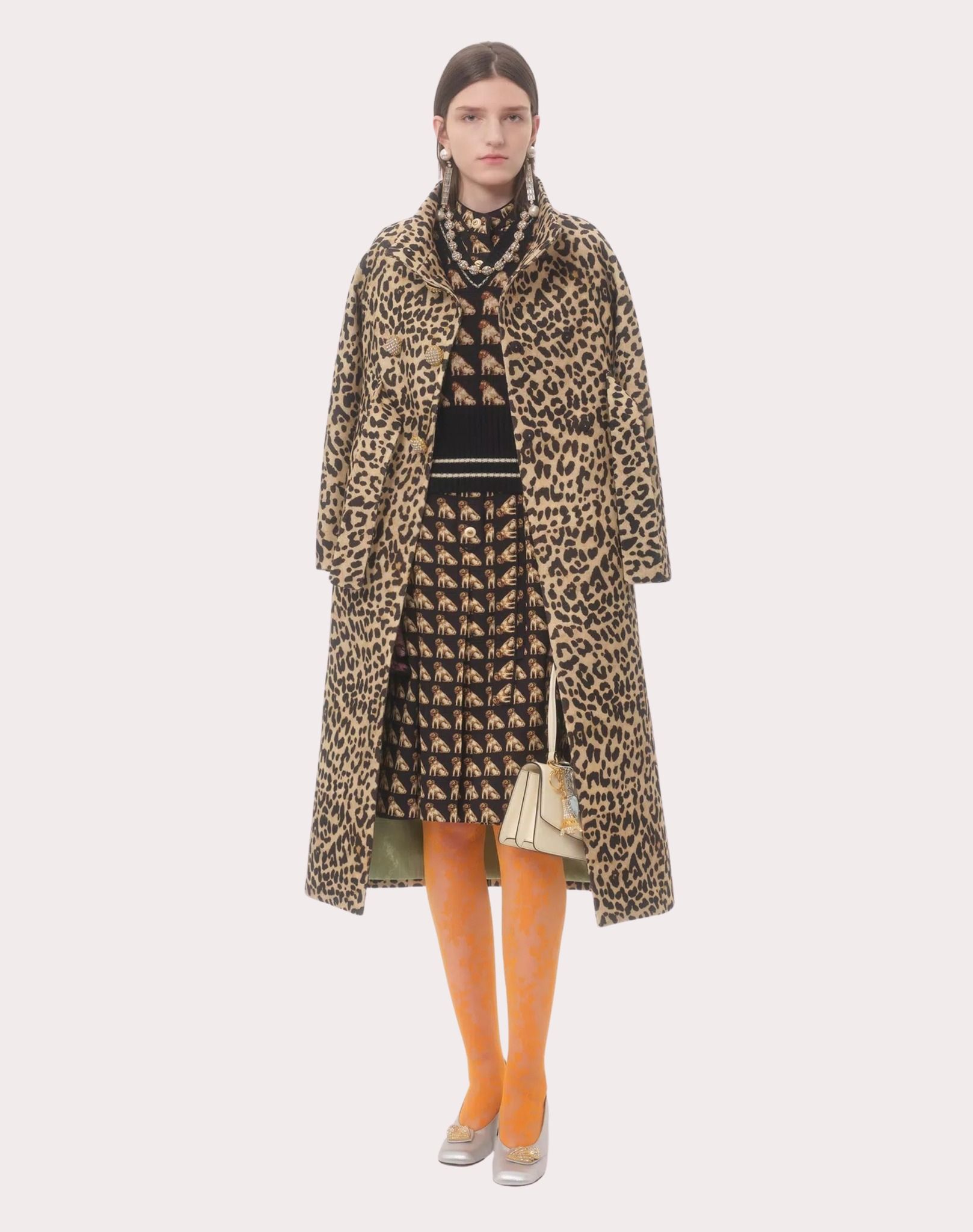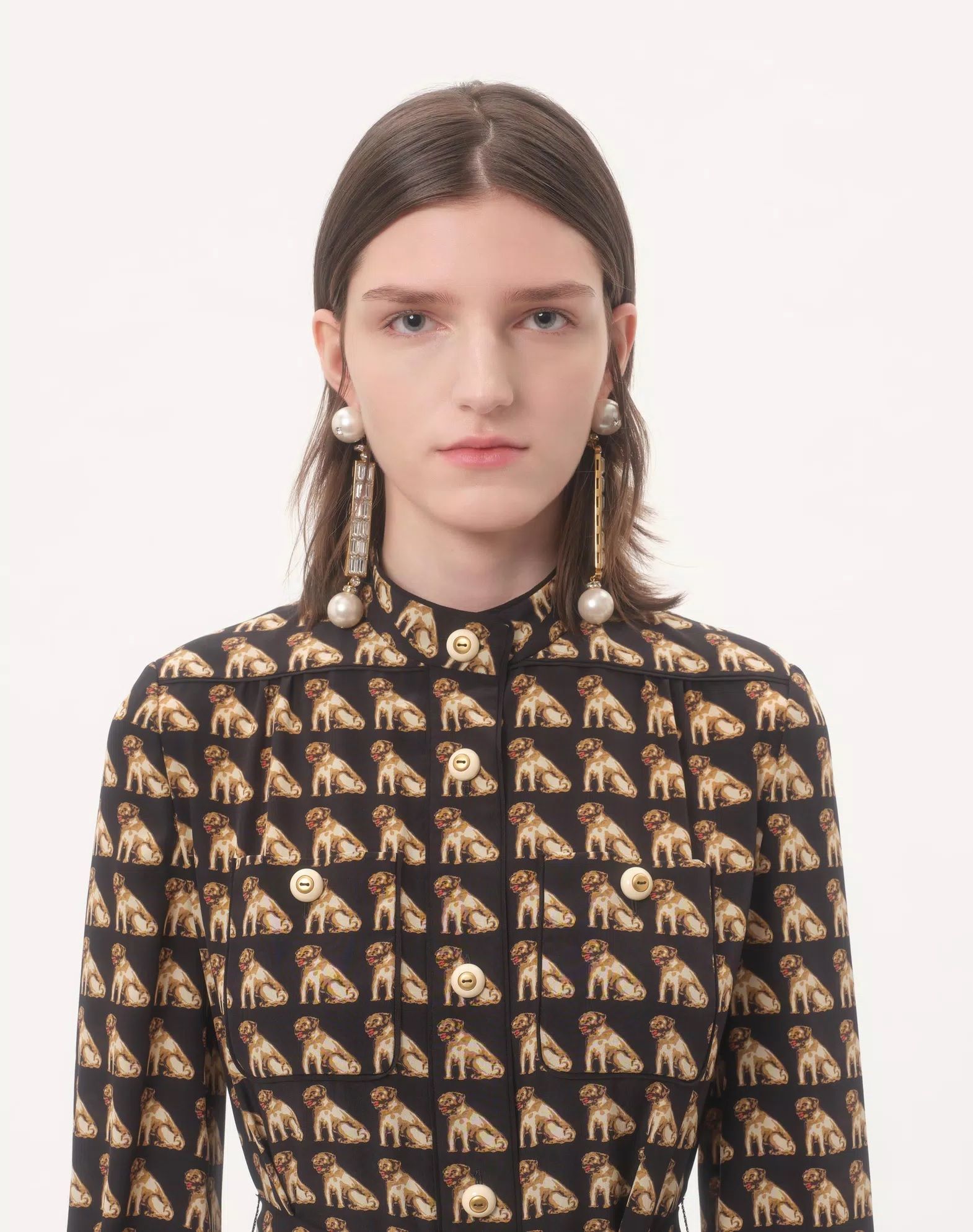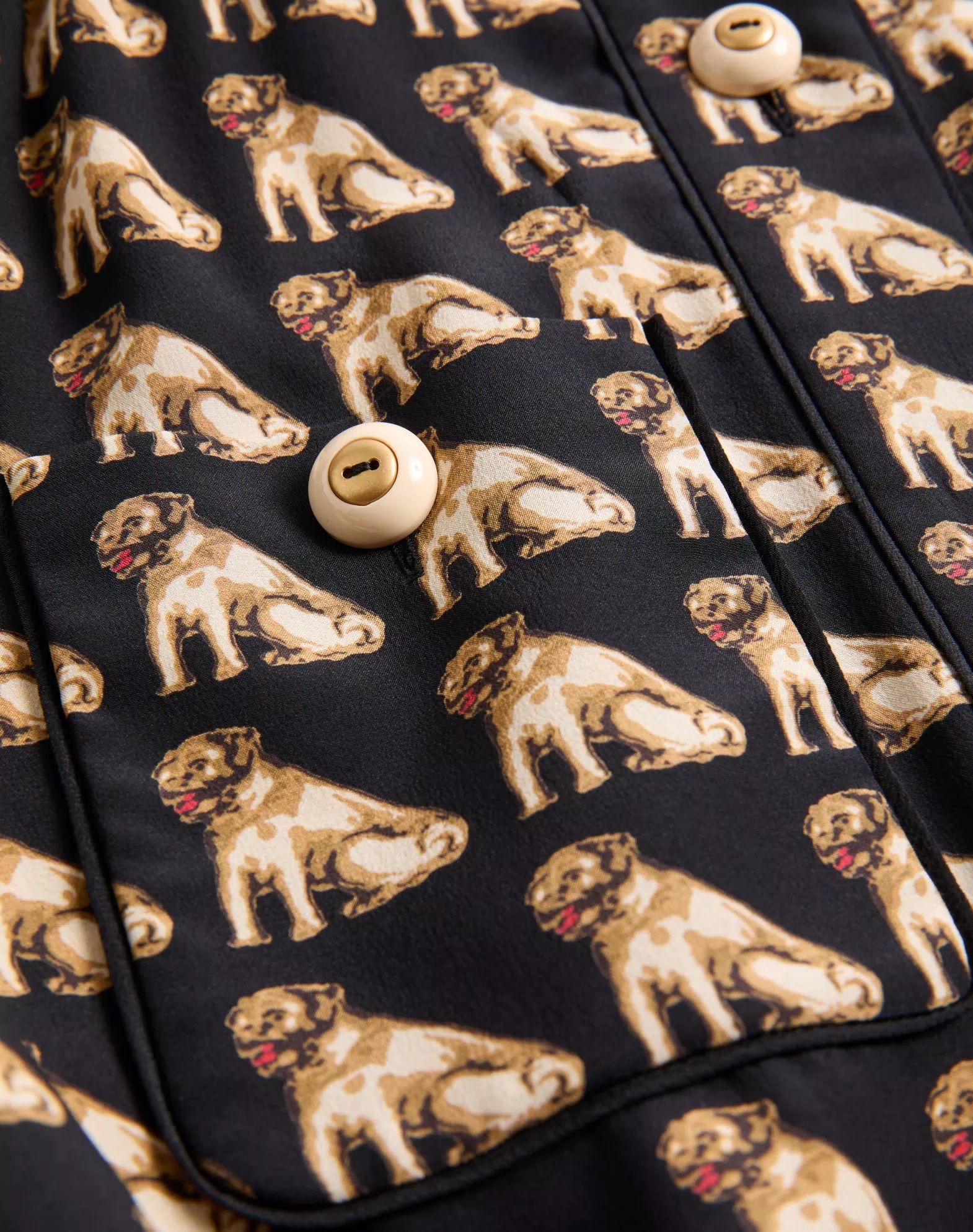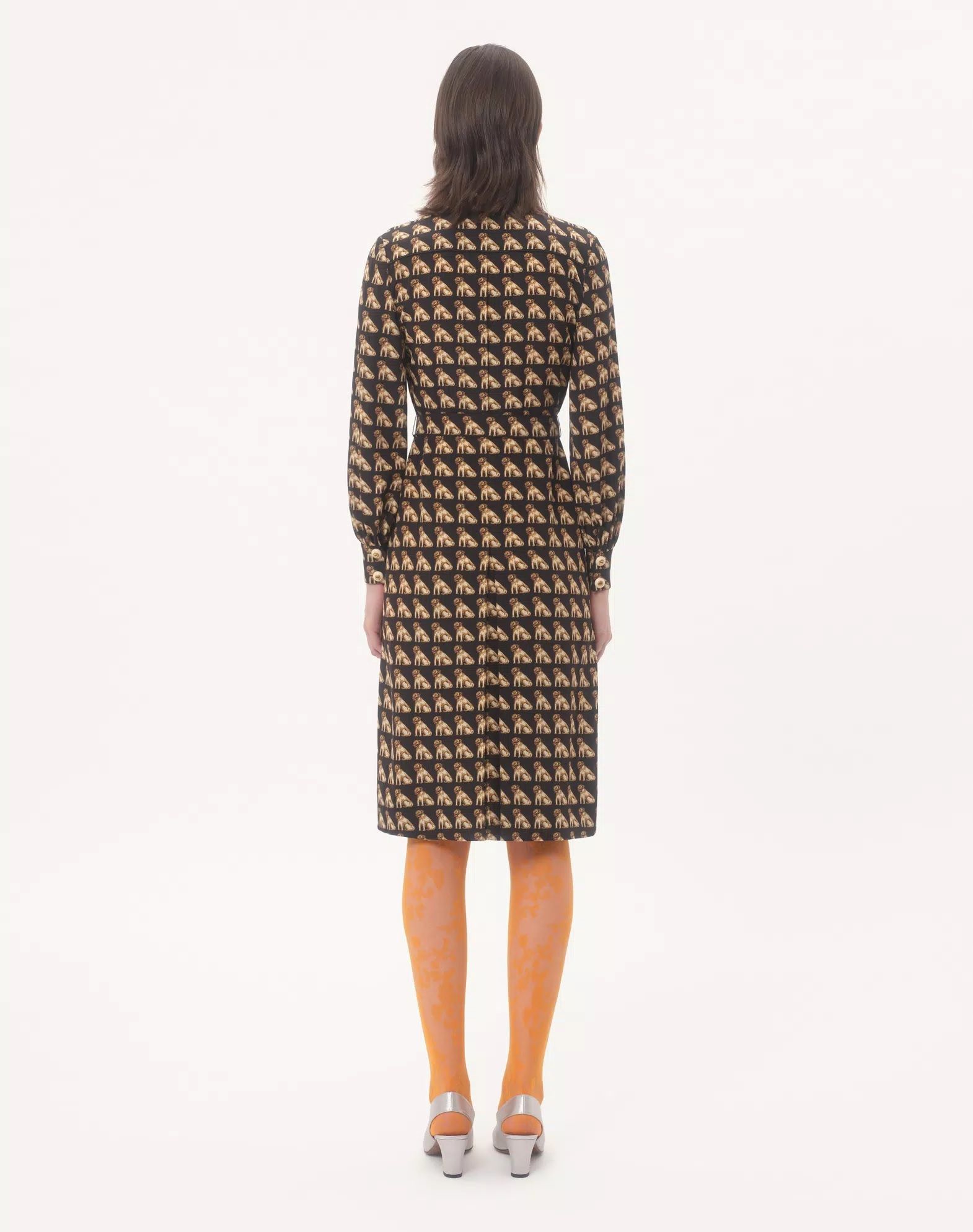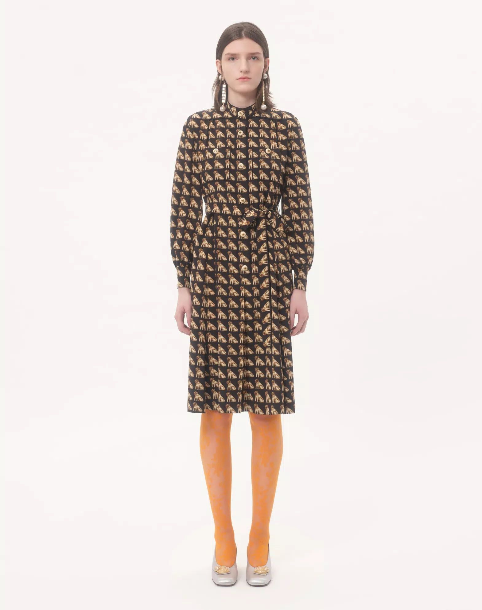 VÁY SƠ MI DÁNG DÀI DÀI TAY NỀN ĐEN HỌA TIẾT CON CHÓ , CỔ TÀU CÀI KHUY TRƯỚC , KÈM ĐAI RỜI CÙNG MẦU , CÓ 2 TÚI NGỰC , THÂN DƯỚI XẾP LY TO