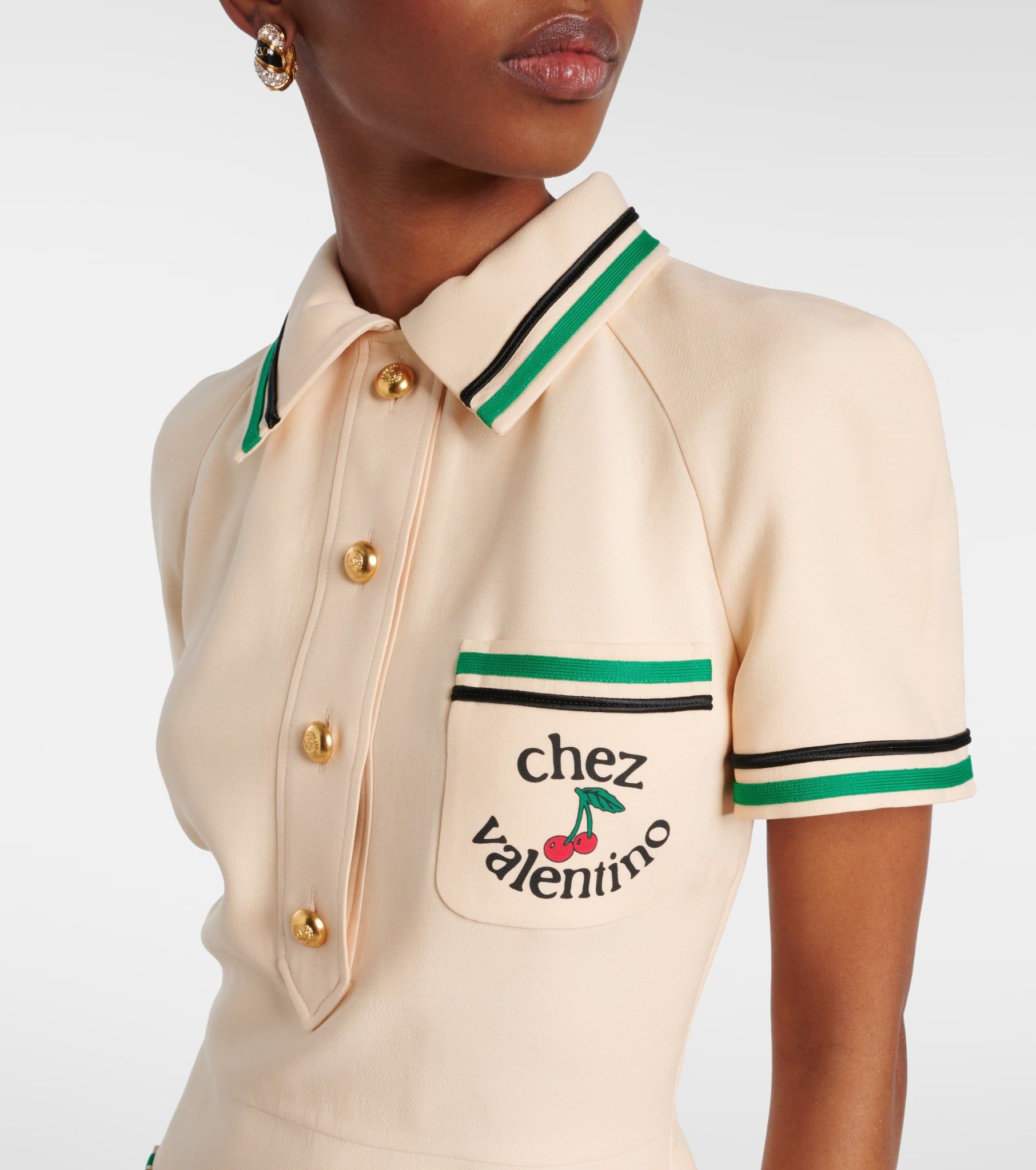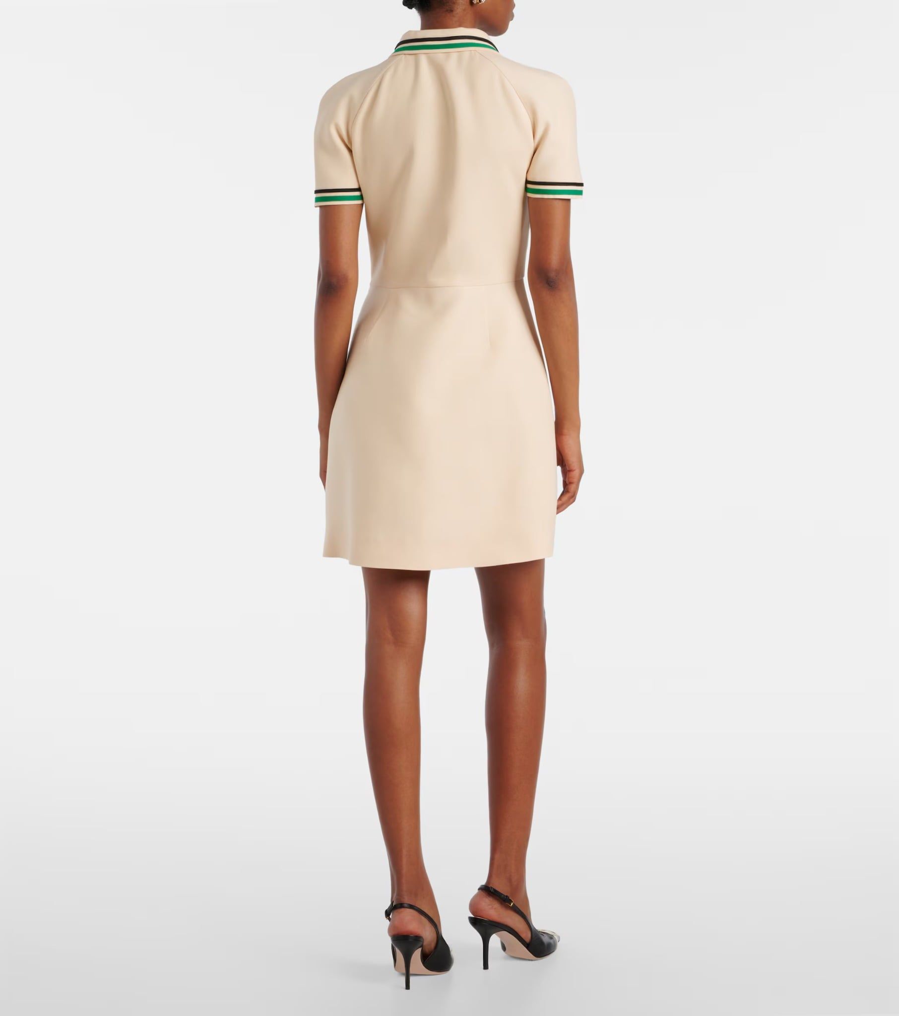 Váy liền cộc tay cổ bẻ cài khuy nửa thân màu be, trước có 1 túi ngực và 2 túi chéo, viền cổ , cổ tay và miệng túi may ghép vải màu đen và xanh lá cây