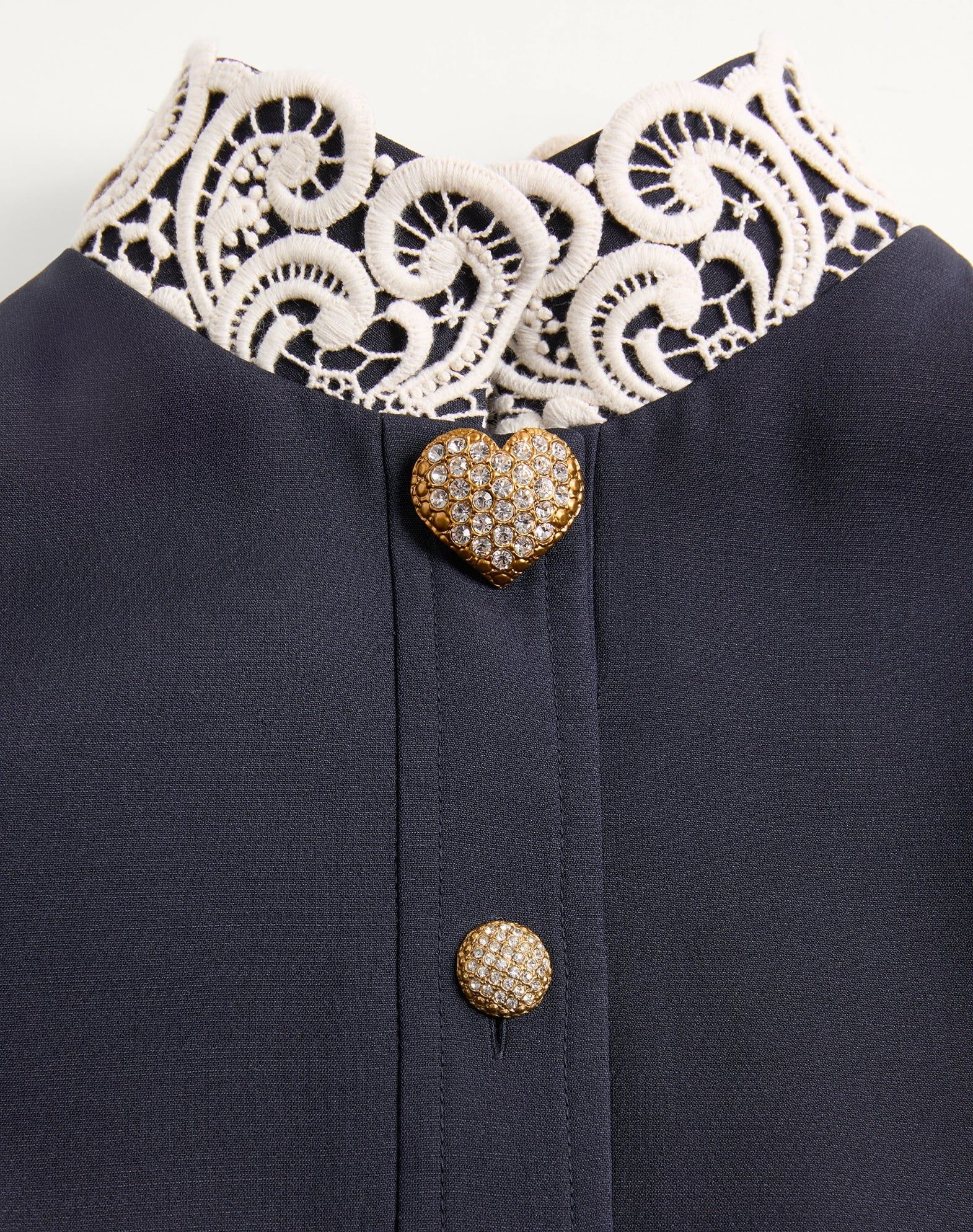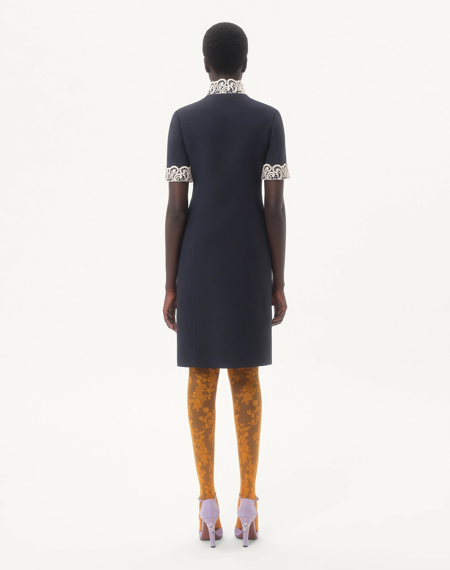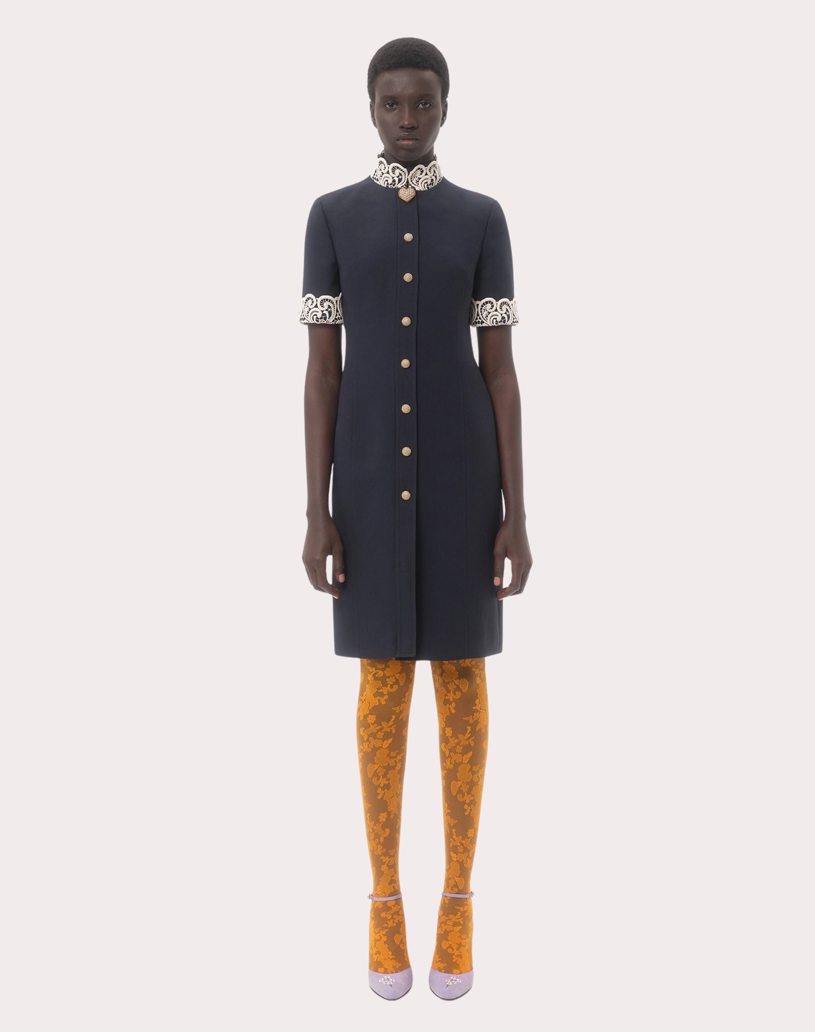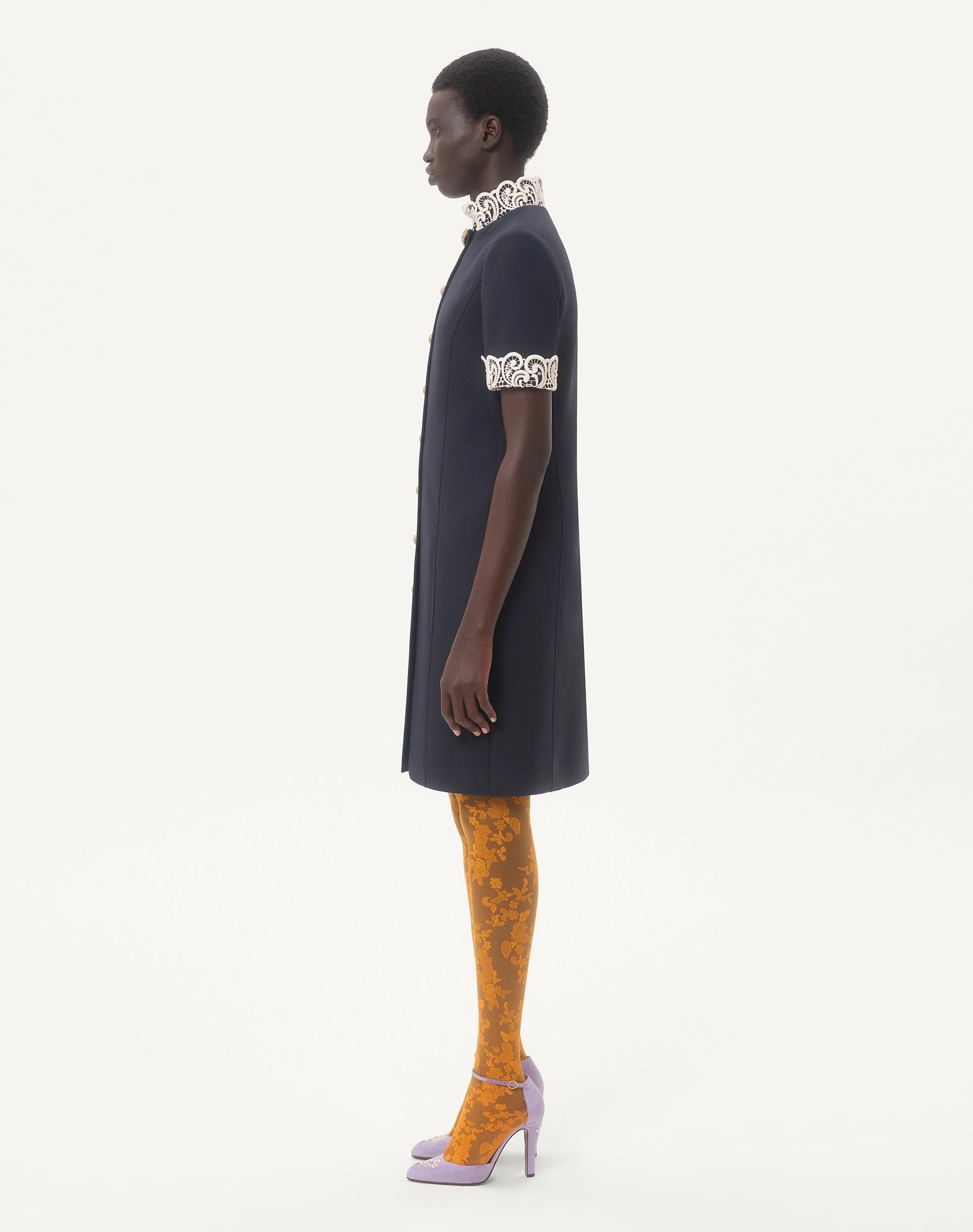 Váy liền cộc tay màu xanh tím than, cài khuy dọc thân, cổ và cổ tay thêu ren trắng