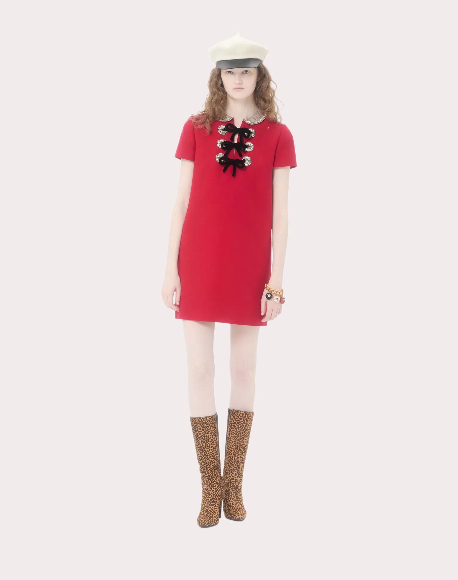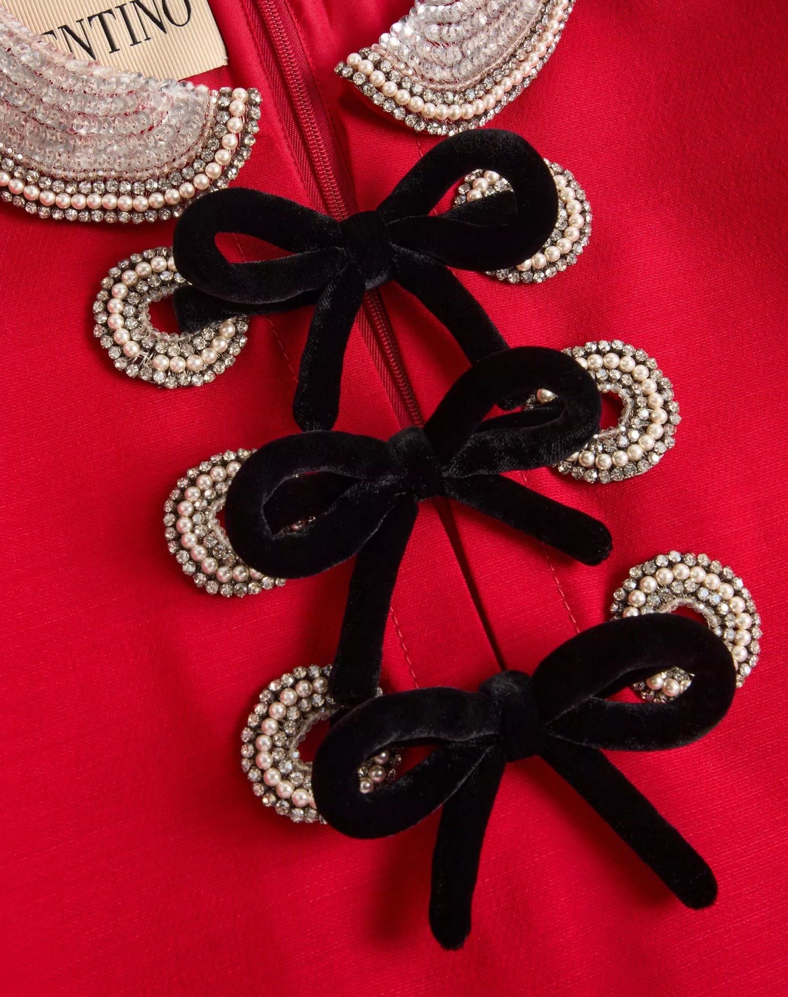 Váy liền cộc tay màu đỏ, kéo khóa sau, cổ đính đá trắng, ngực đục 6 lỗ đính đá trắng luồn dây buộc 3 nơ màu đen